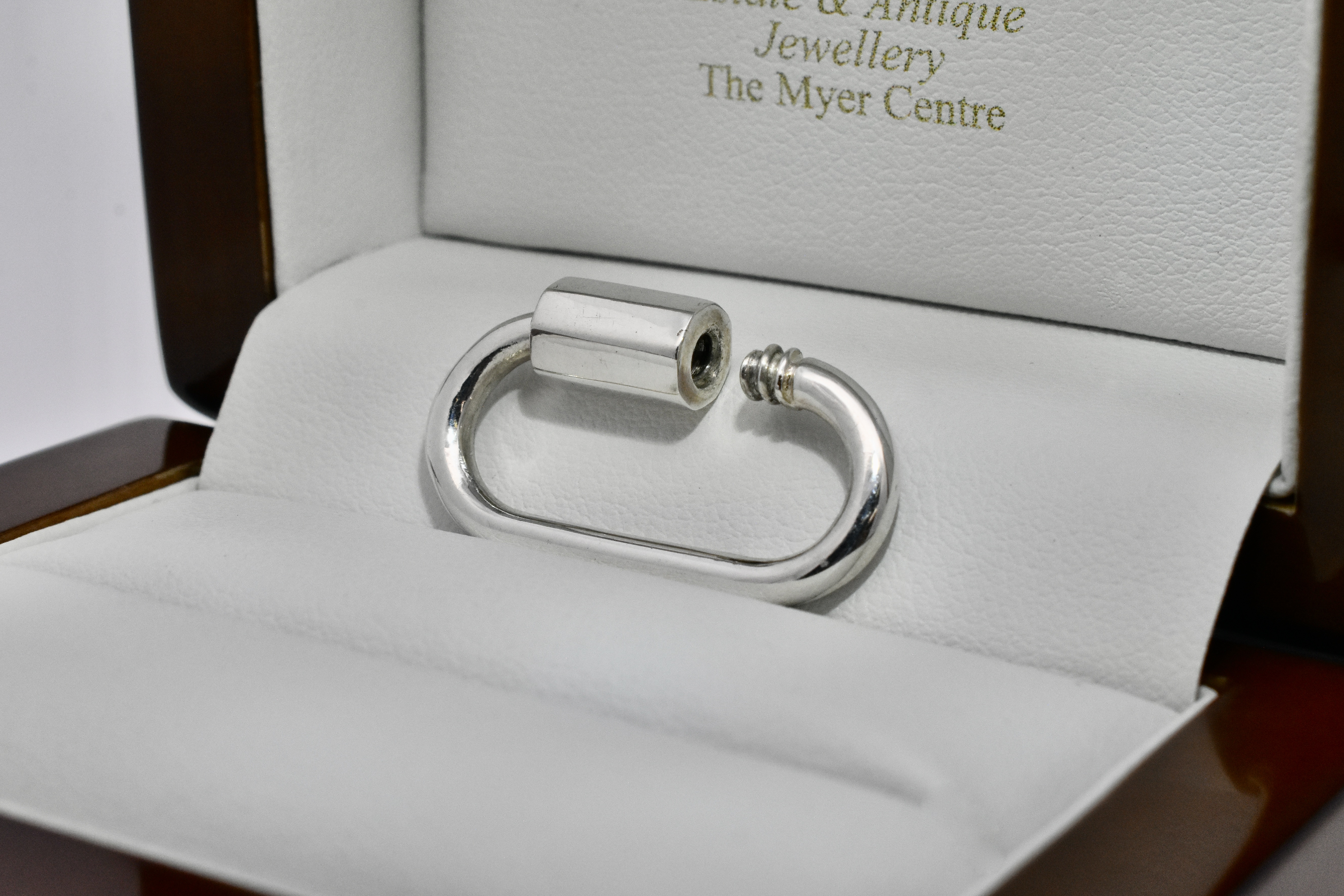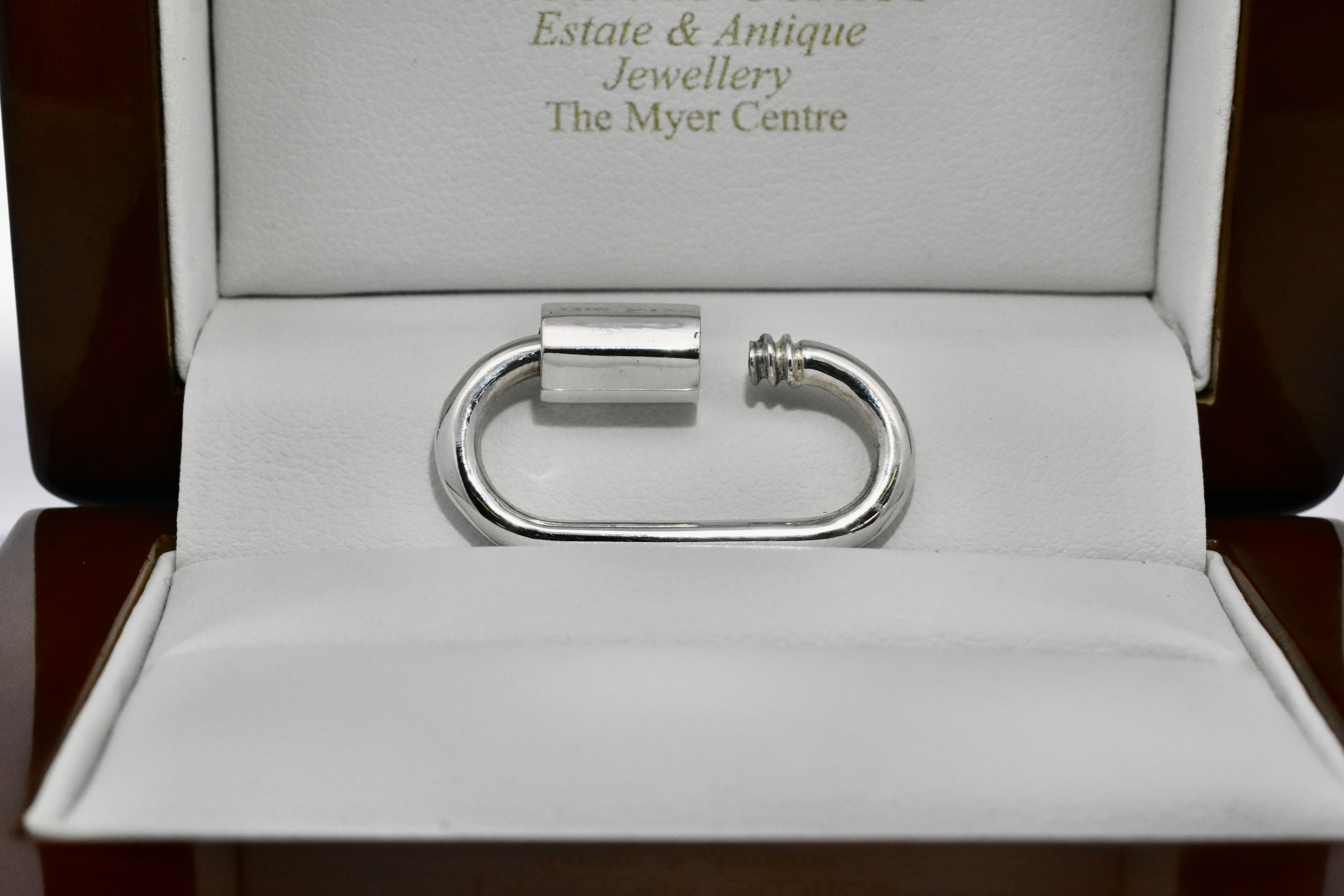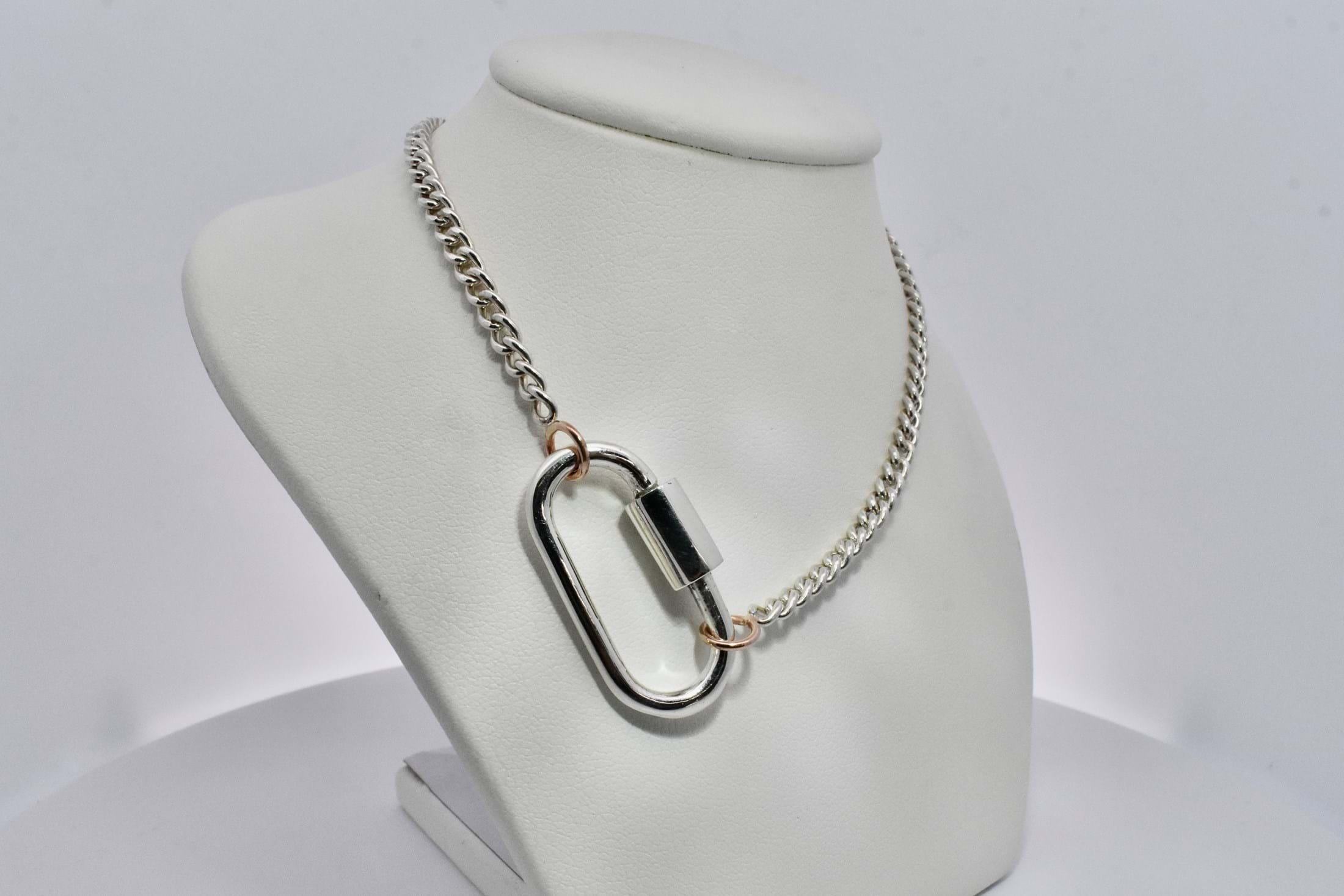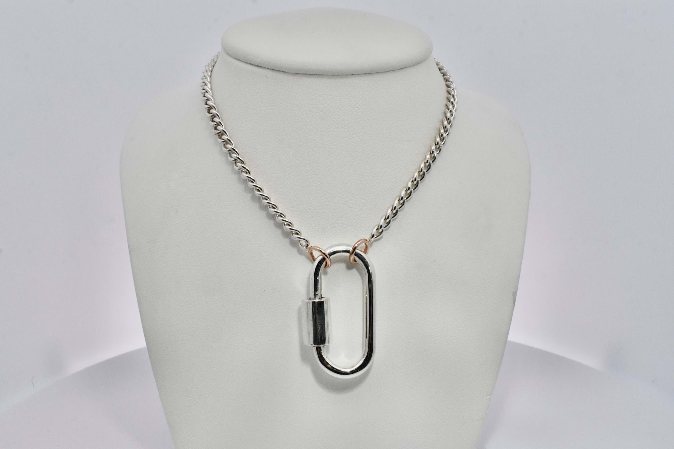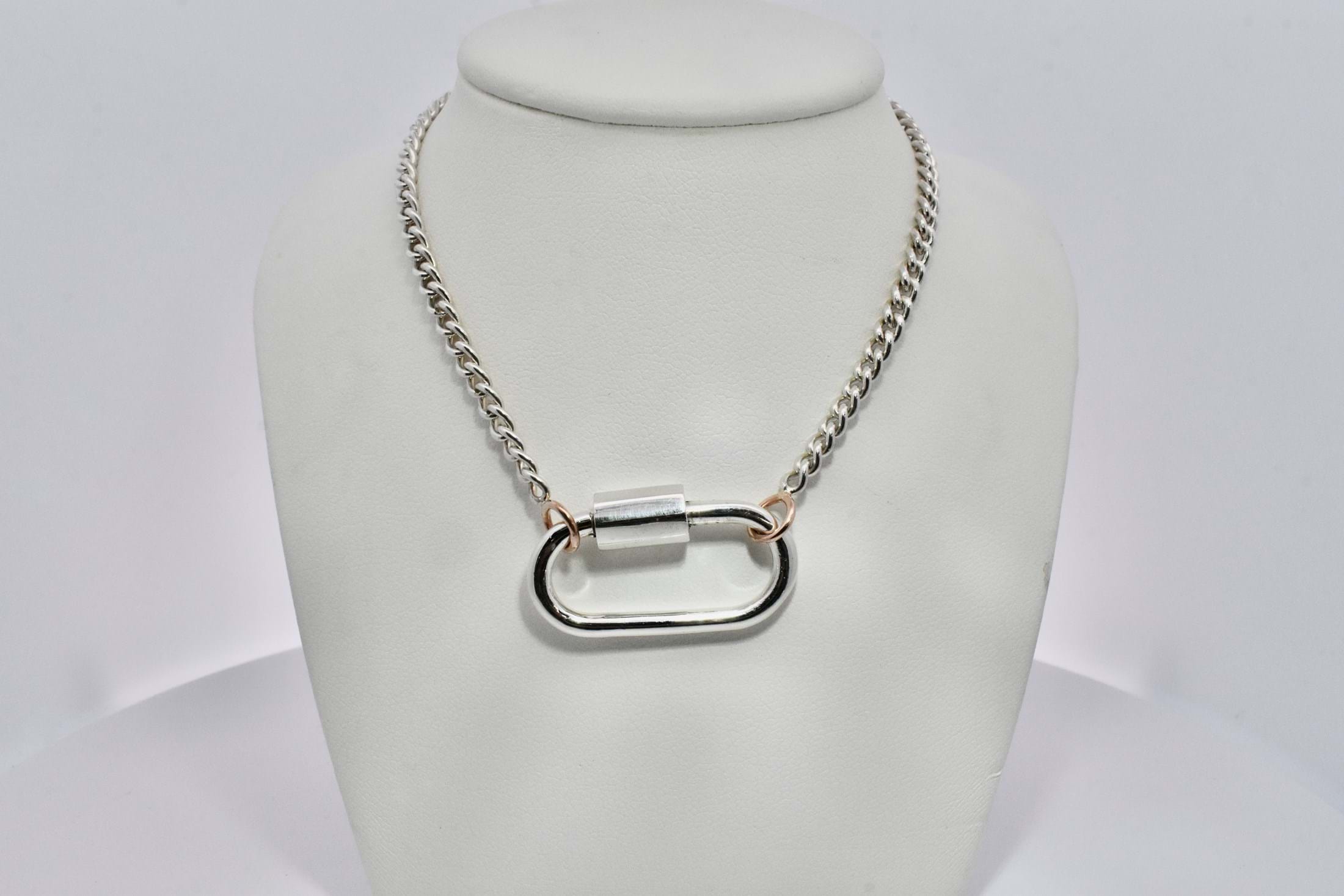 A contemporary and stylish statement accessory, this oval carabiner is crafted in sterling silver and has been designed as a multipurpose piece which can act primarily as a clasp but also as a linking or extending accessory; to hang a pendant or enhancer from or even be a pendant itself. Pair it with a silver chain for continuity or rose gold for a bold contrast. Chains pictured available for separate purchase. Carabiner measures approx. 29X15mm
