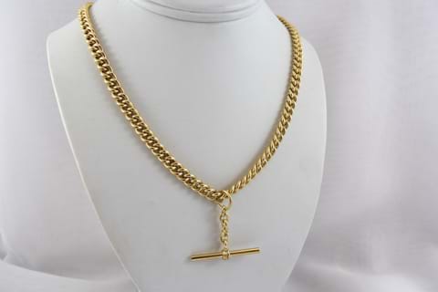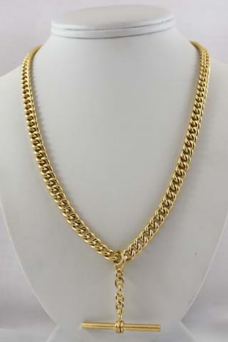 Handmade by our goldsmiths in 9ct yellow gold this curb link fob chain has two swivel claps and a sliding T-bar pendant. Weight: 59.9grams Length: 50cm