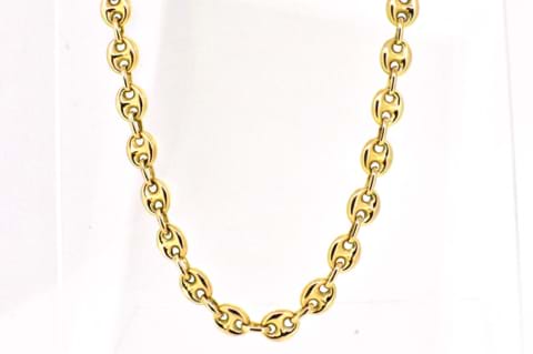 This 9ct yellow gold hollow type fancy link chain is incredibly tactile and measures 61cm and has a total weight of 20grams. A beautiful dress chain that looks stunning worn without any additions