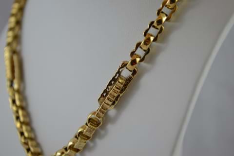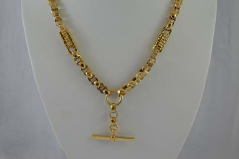 9ct yellow gold fetta link chain. The chain features a permanent t/bar at the front and two swivels at the back. The chain length is 51.5cm which is a great length for most ladies. The weight of the chain is 62 grams. Which is a great weight to be worn on a daily basis.