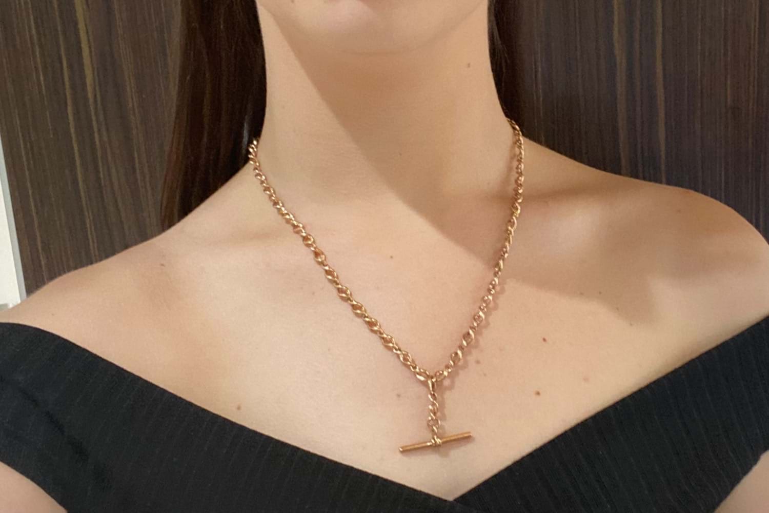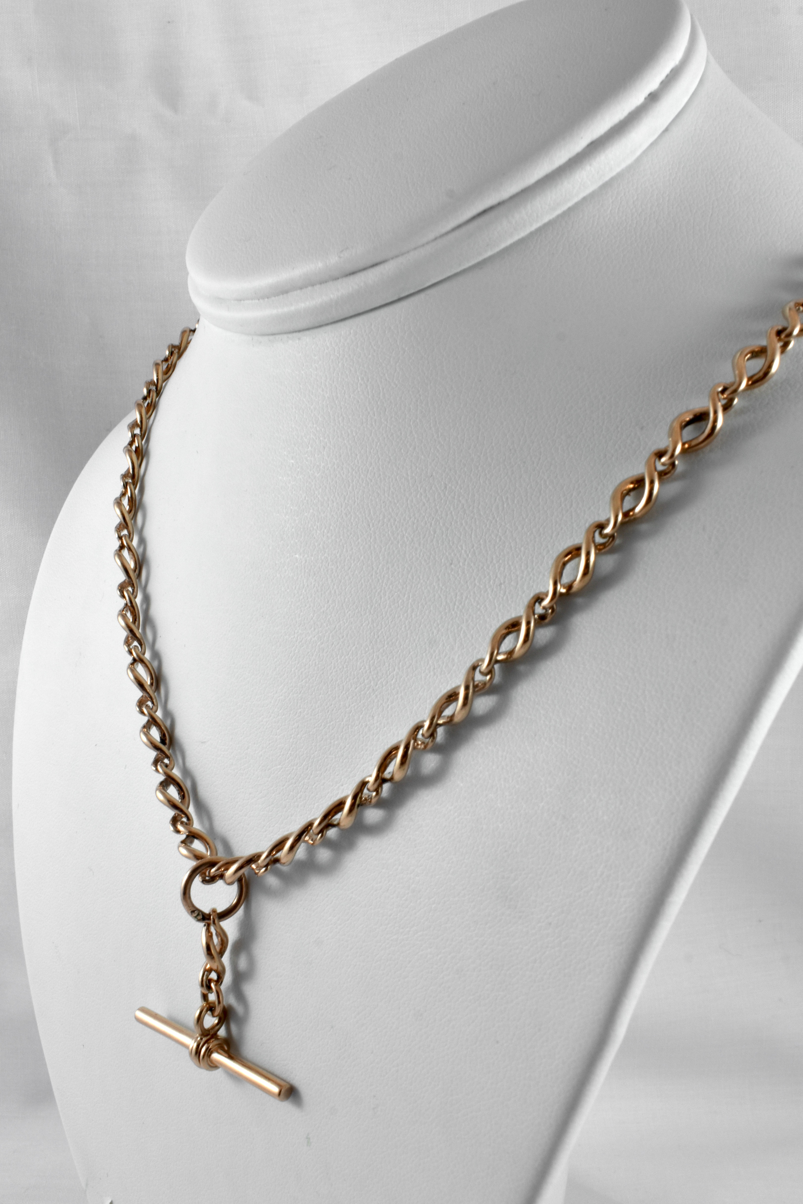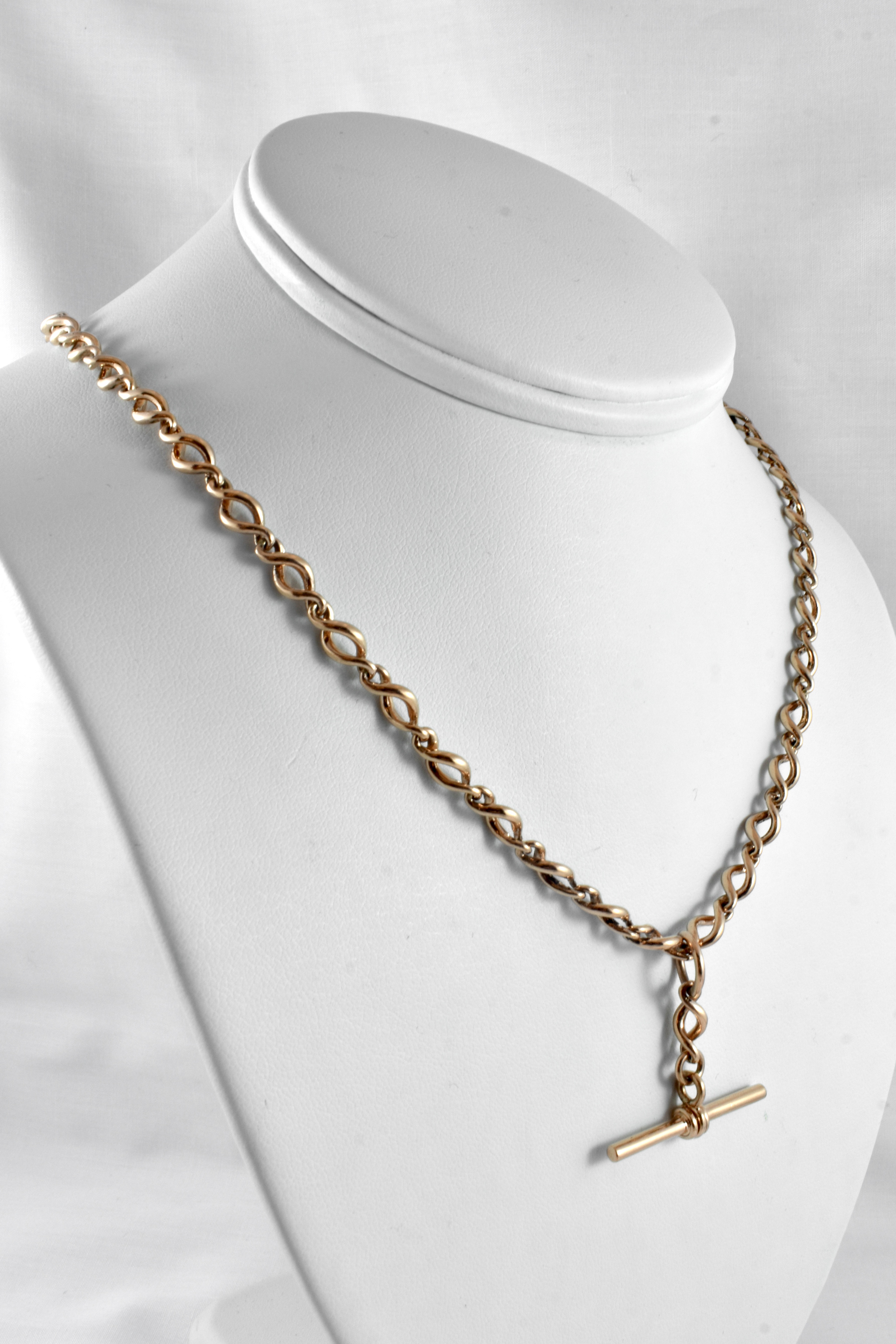 This lovely chain has a pretty and interesting twisted infinity style link, crafted in 9ct rose gold with a weight of 26.3 grams. The chain is 50cm long with one swivel and a removable T-bar