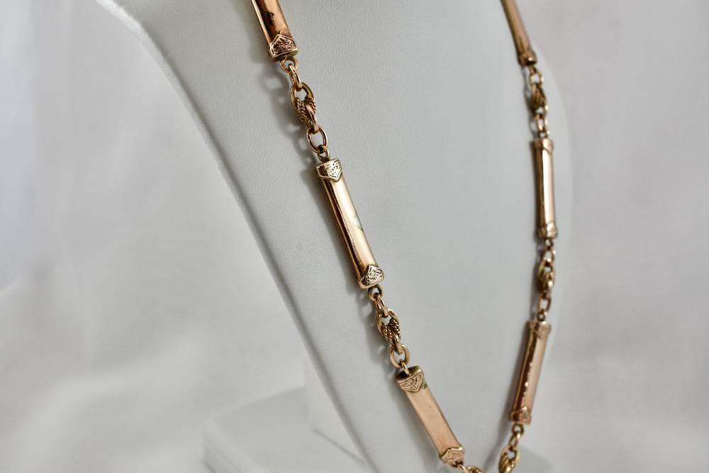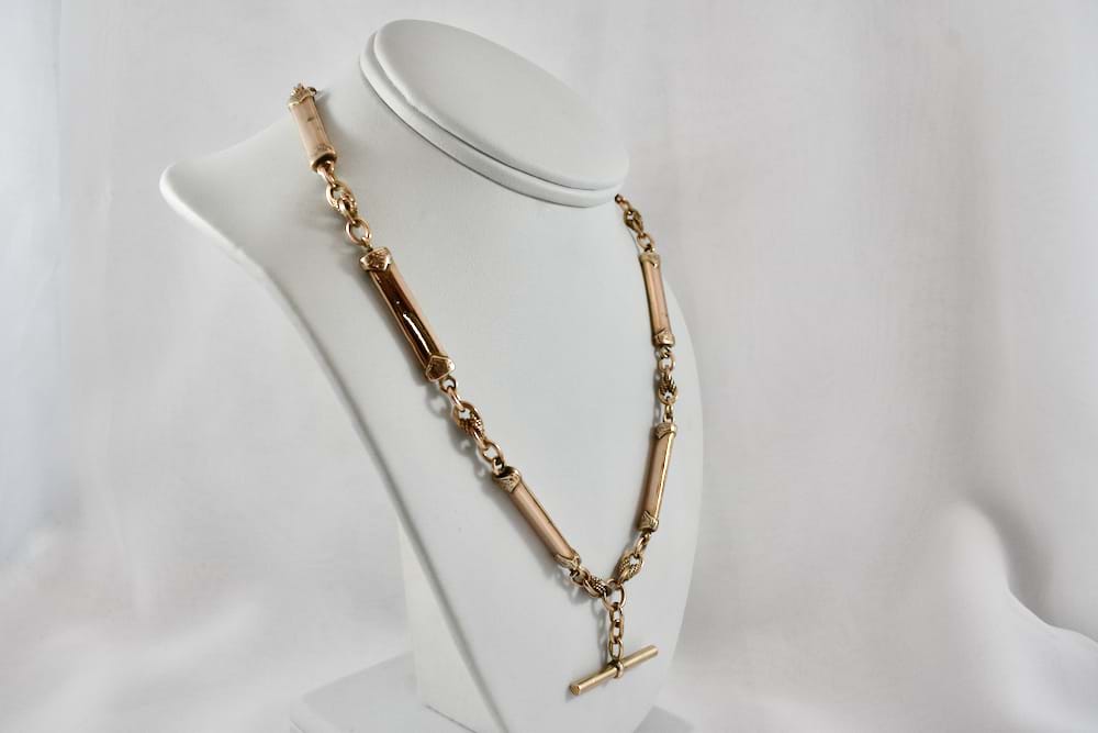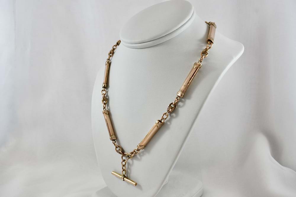 Gorgeous fob chain crafted in 9ct rose gold with fancy knot links and end-cap bards with a central jump ring and T-bar feature with a single swivel clasp at the back. Finish length is 50cm and weight is 45grams, approx. link width 6mm