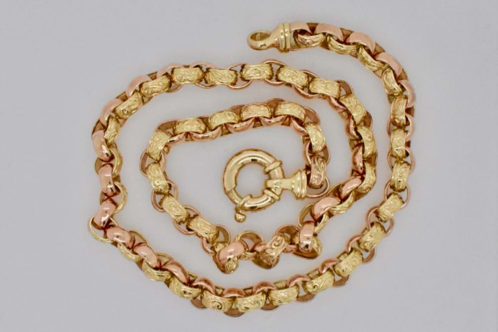 A beautiful solid 9ct rose and yellow gold belcher chain with alternating engraved links and end finials with a bolt ring clasp. Total length 53cm. Total weight 73.59grams. Independent Valuation Supplied