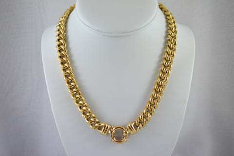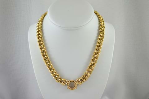 A stunning and classic 9ct yellow gold semi-hollow curb link chain with a European bolt ring clasp. This chain is a stand alone piece, but can also be stunning when paired with enhancers and pendants. Chain weight 70.8grams. Length: 45cm.