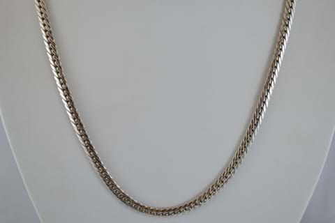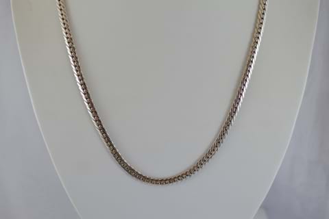 This double curb chain has a diamond cut which catches the light beautifully, it measures 46cm in total length and has a weight of 10.03grams. A well made chain that moulds itself to the neck of the wearer.