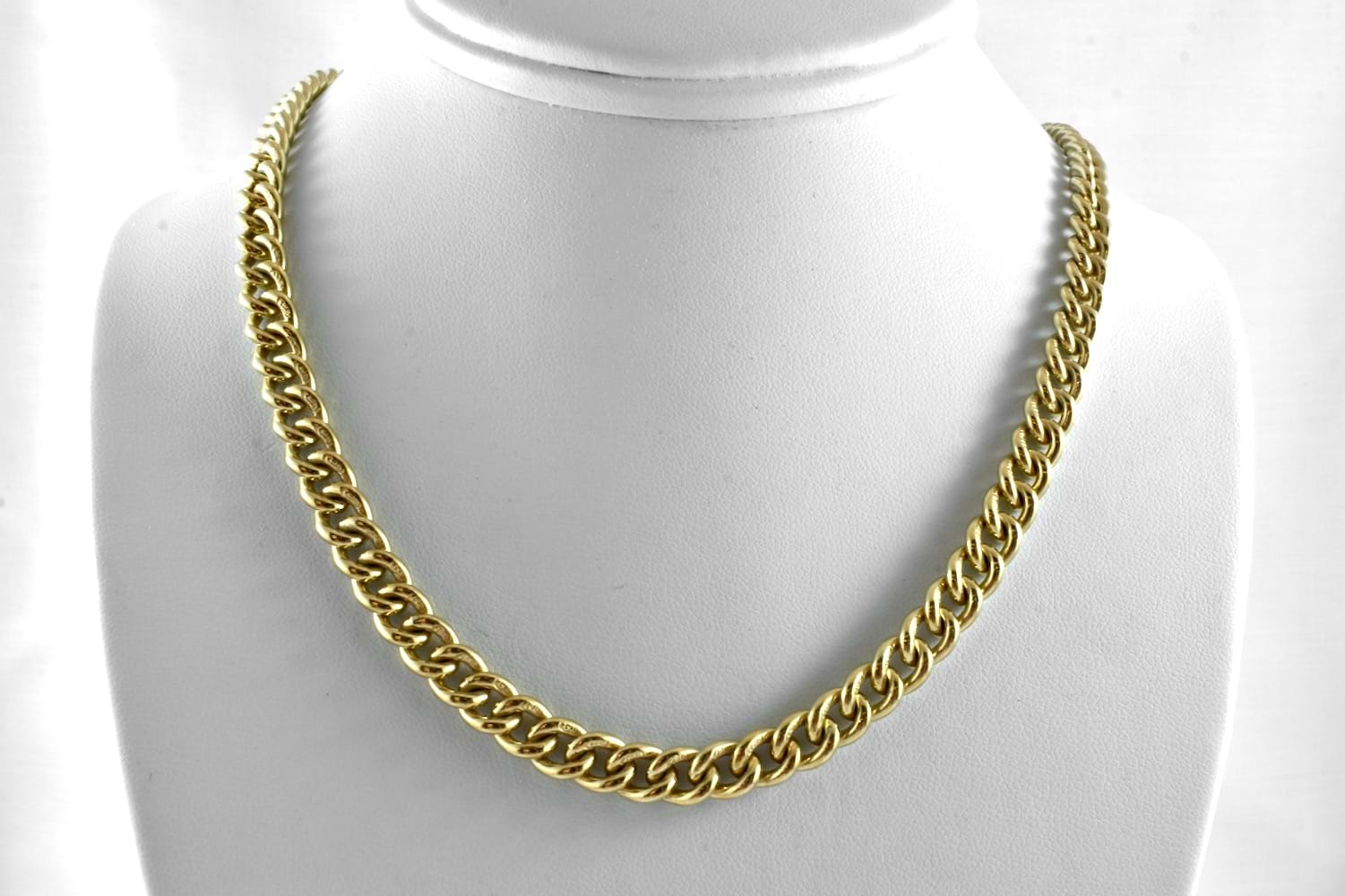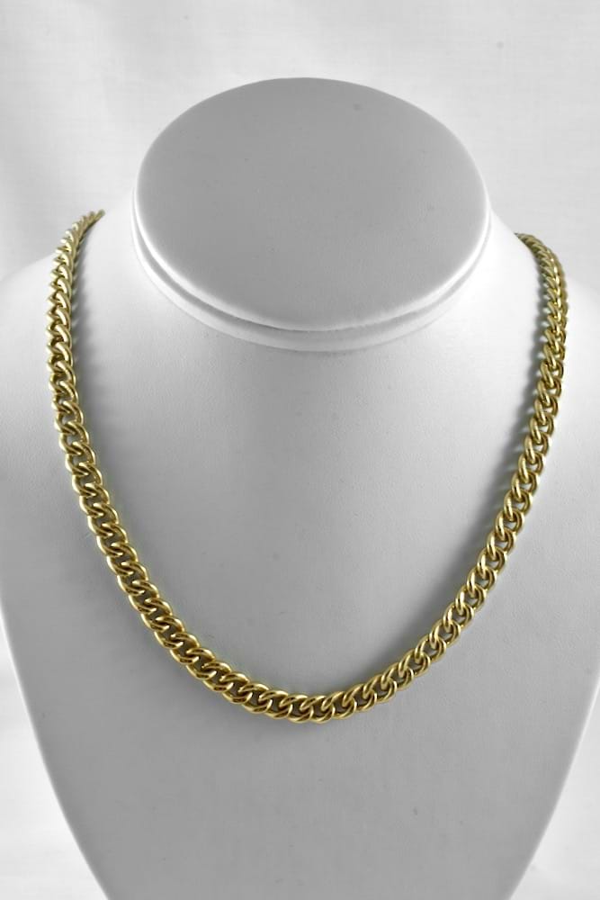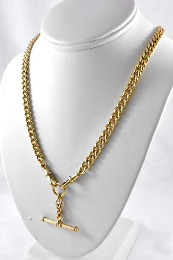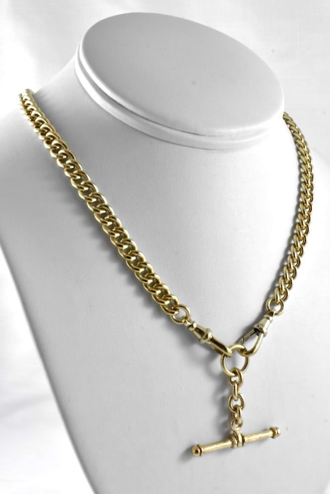 This classic and staple chain is made from 9ct yellow gold, weighing a heavy 62.87 grams with curb links and two swivels, with a removable T-bar. Chain is 50cm long