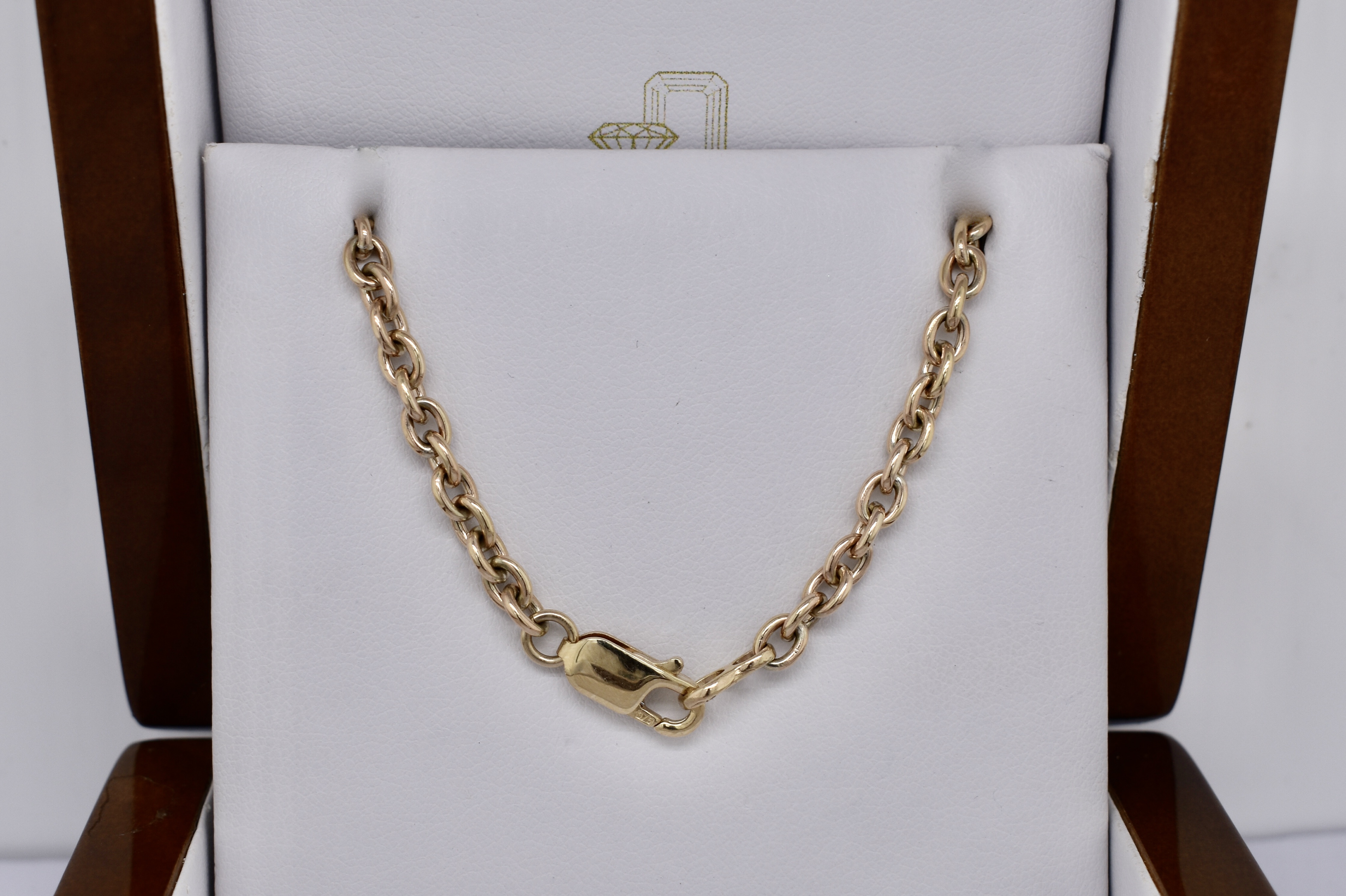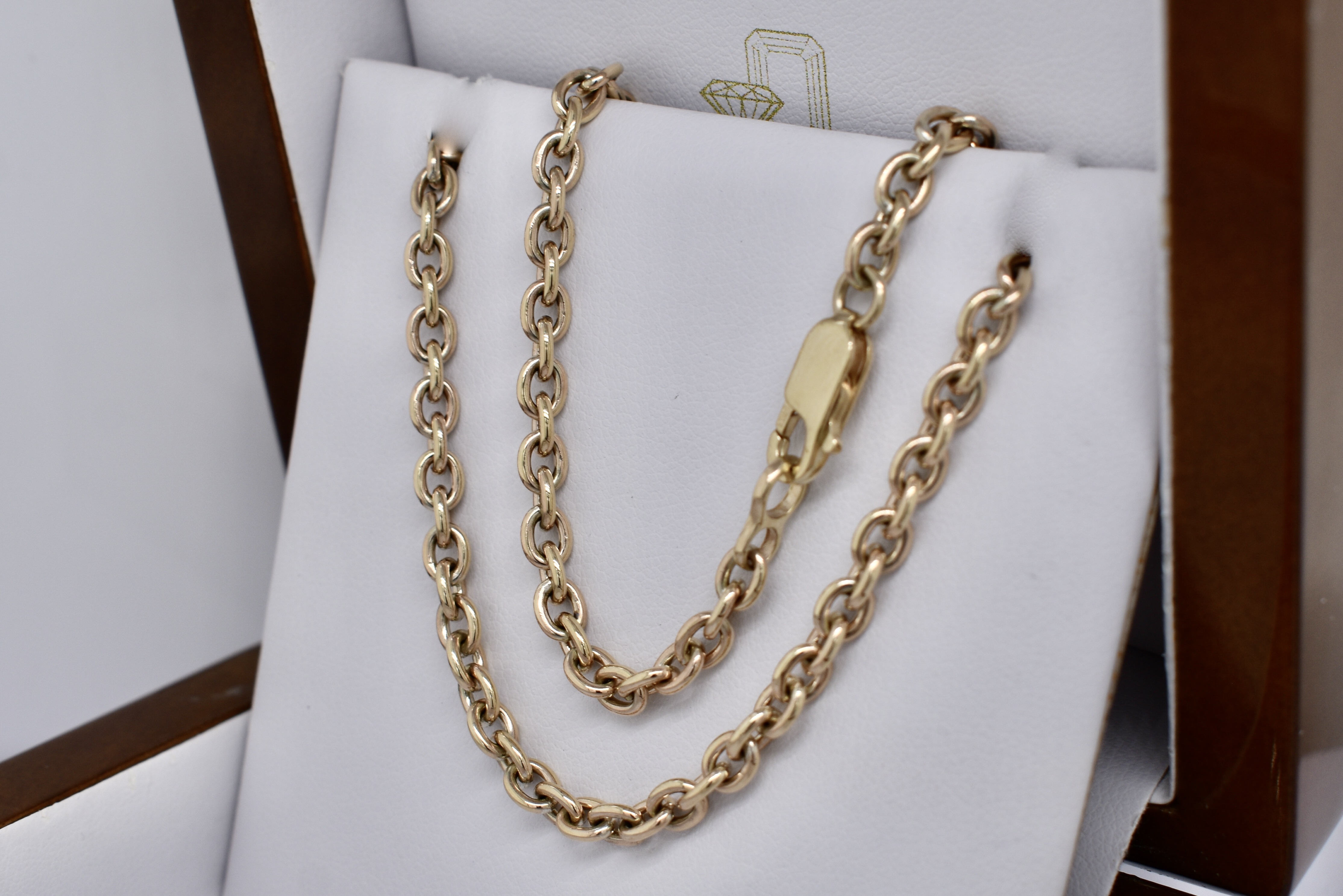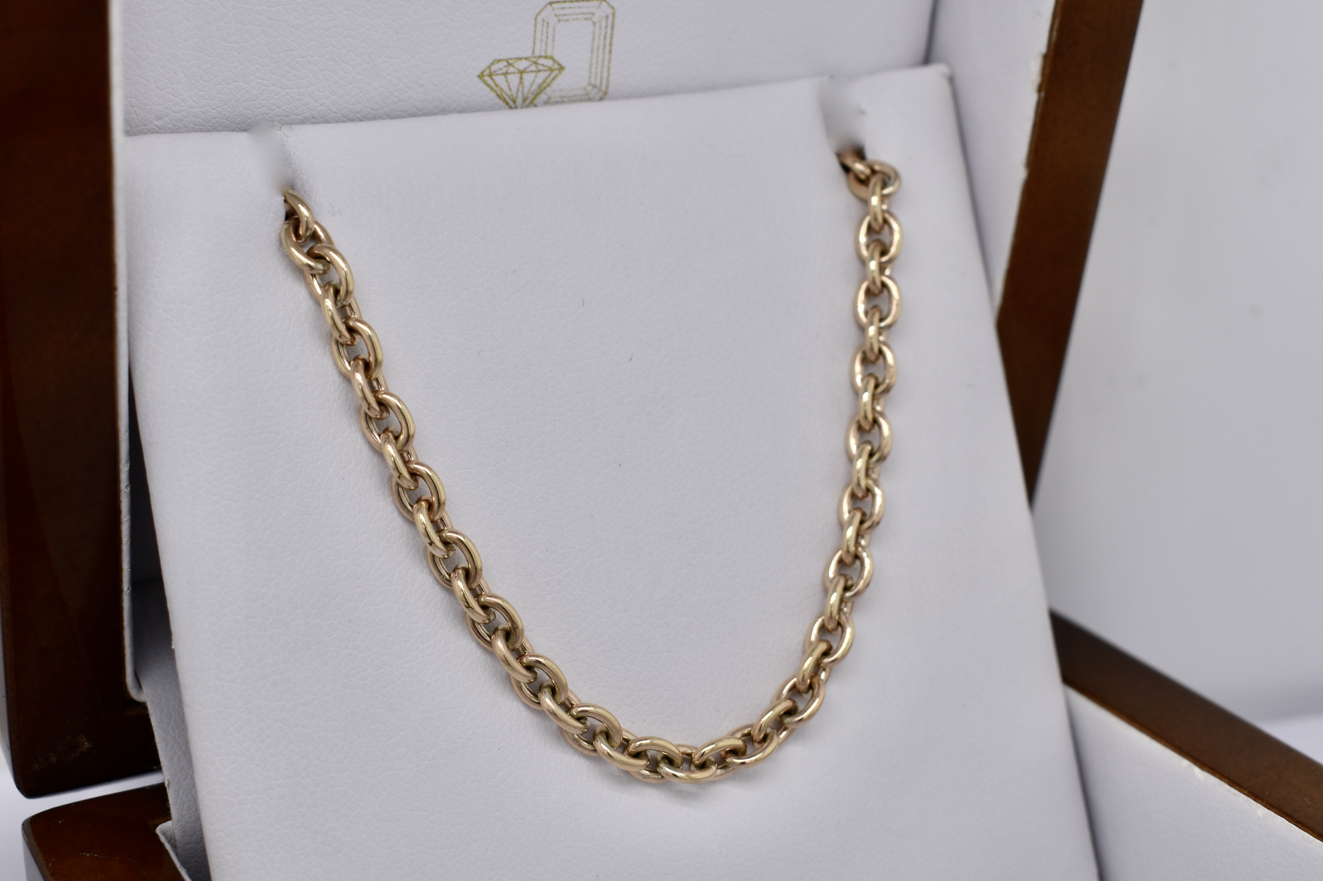 This beautiful classic chain was handmade by our goldsmith in 9ct yellow gold in this pretty BB cable link, measuring 1.1mm wide. It has a 14mm parrot clasp and measures 50cm long and weighs 22.50 grams. This chain is perfect to hang a pendant from or looks amazing alone.