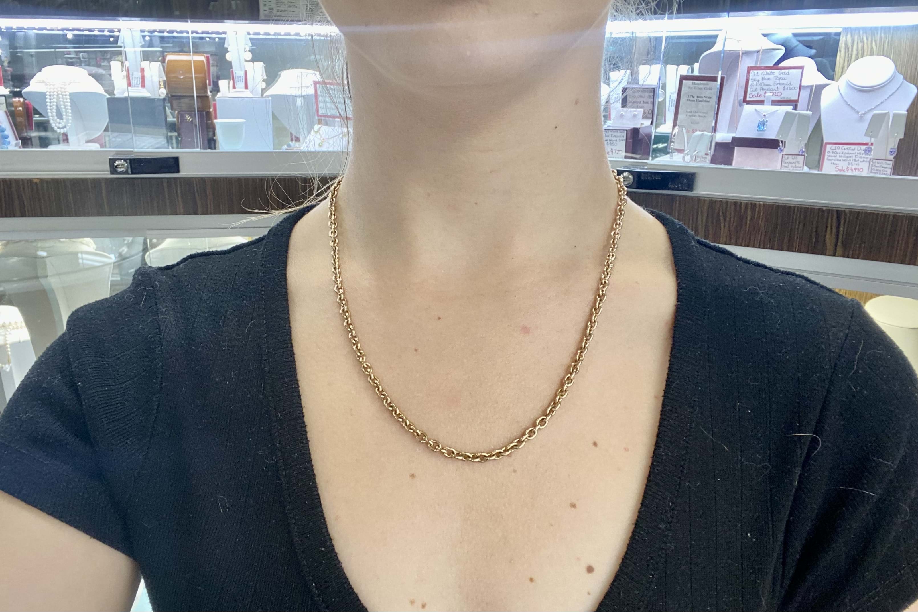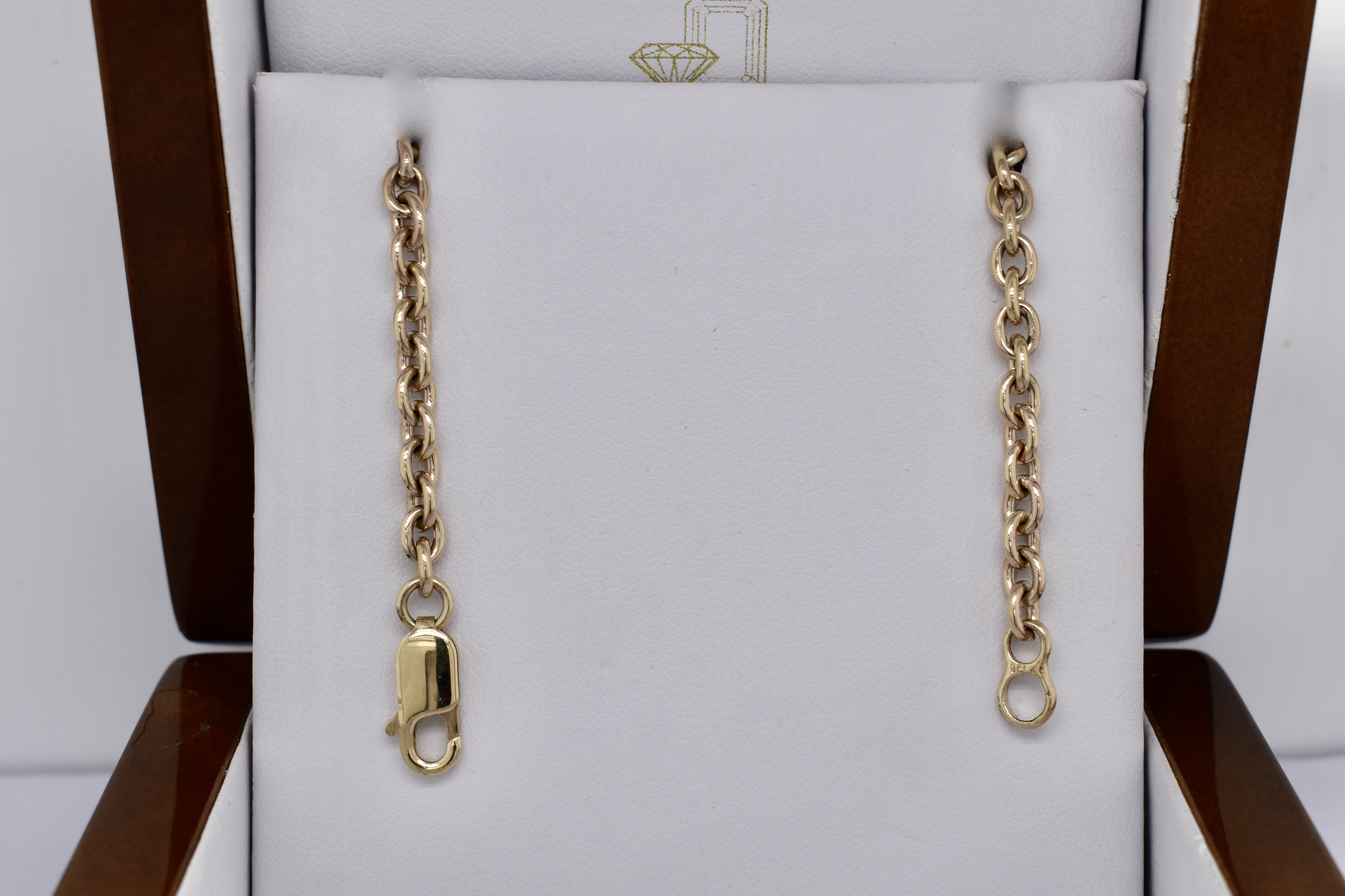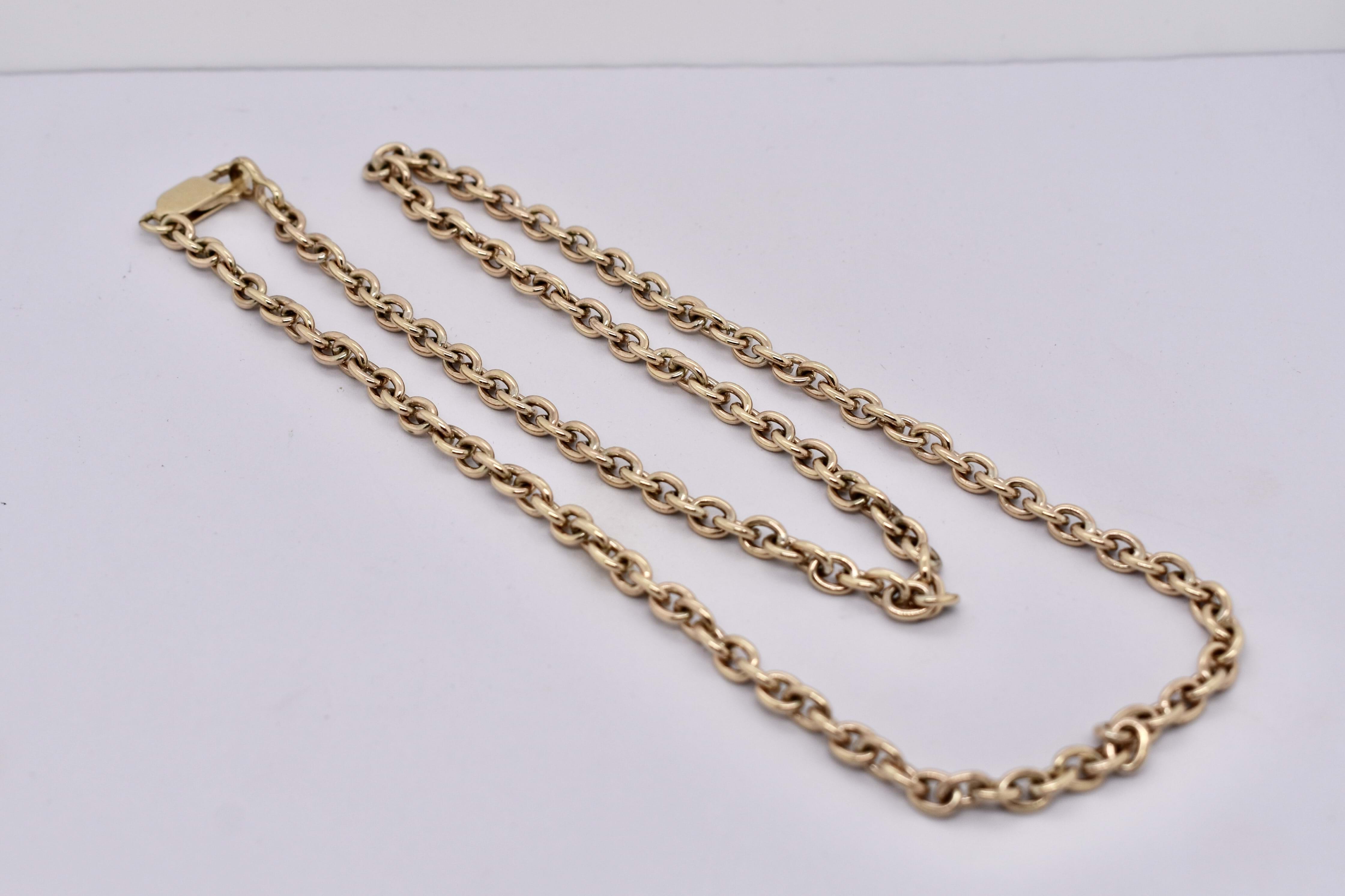 This beautiful classic chain was handmade by our goldsmith in 9ct yellow gold in this pretty BB cable link, measuring 1.1mm wide. It has a 14mm parrot clasp and measures 50cm long and weighs 22.50 grams. This chain is perfect to hang a pendant from or looks amazing alone.