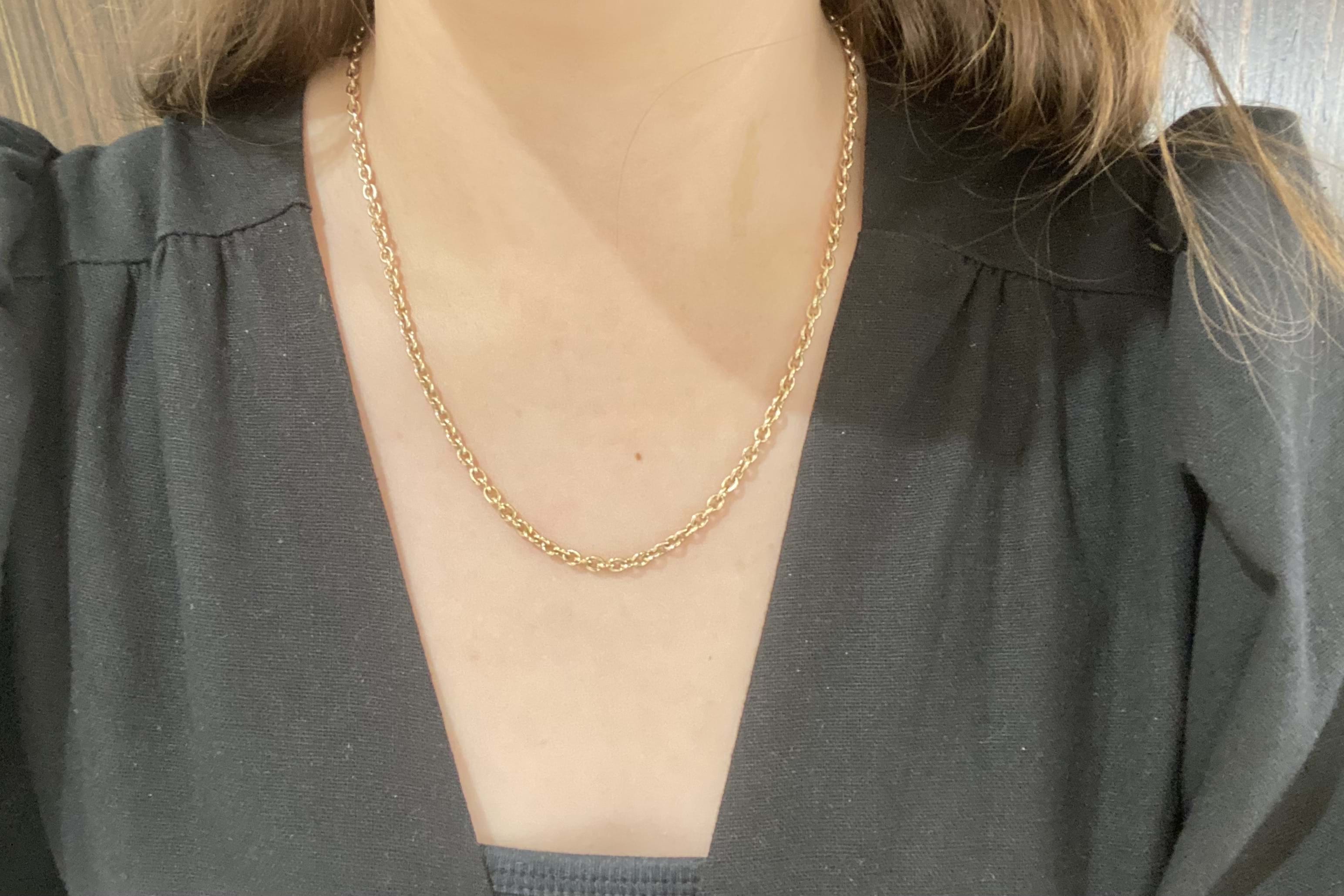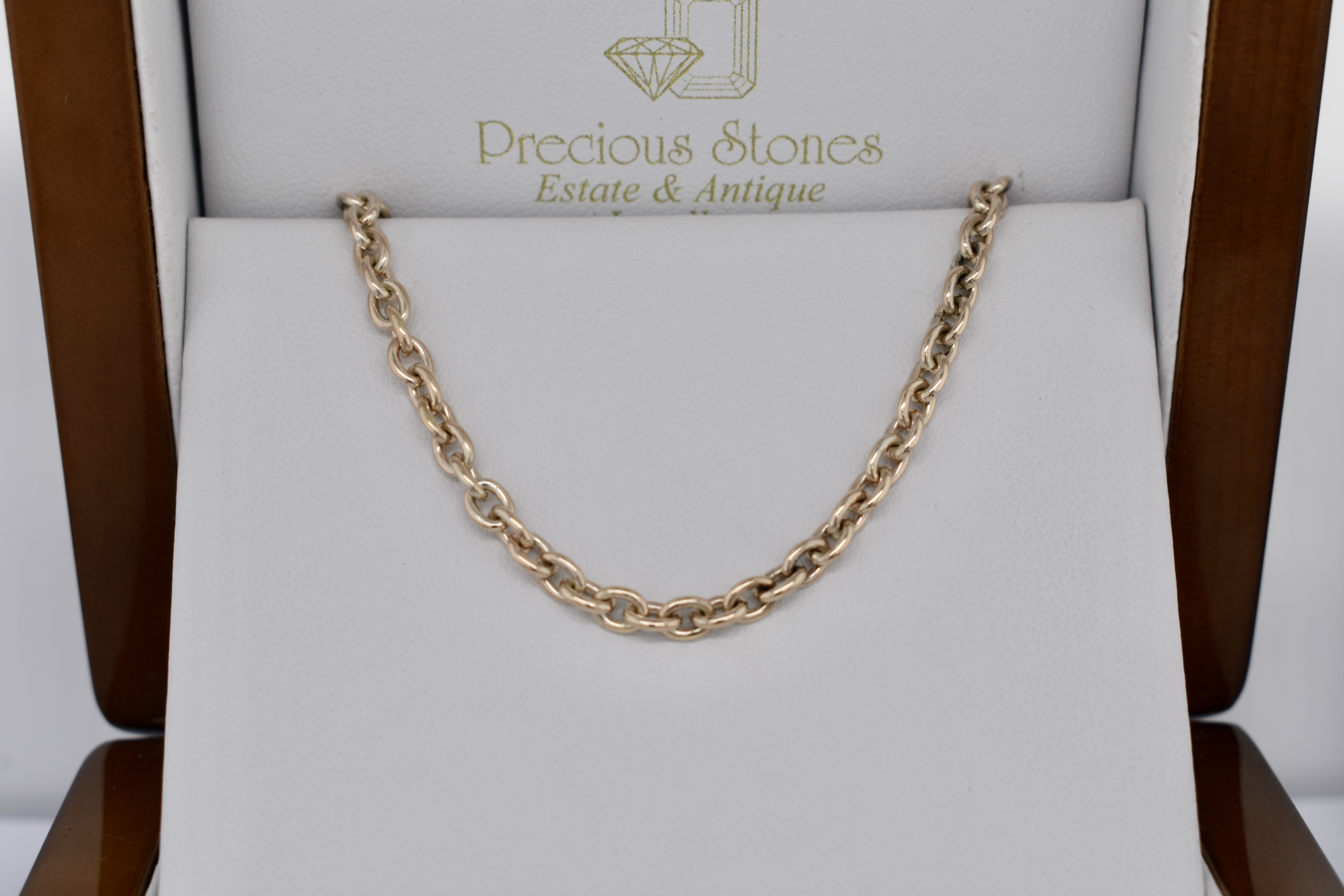 This stunning chain was handmade by our goldsmith in 9ct yellow gold in this pretty cable link. Chain measures 45cm long and weighs 14.20grams. It is completed with two jump ring ends, these ends allow for a wide range of styling versatility, including various brooches, enhancers or carabiners.