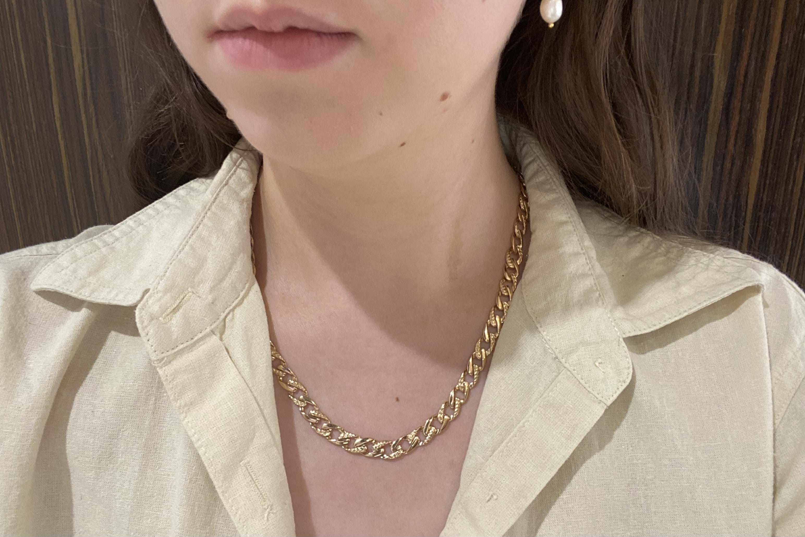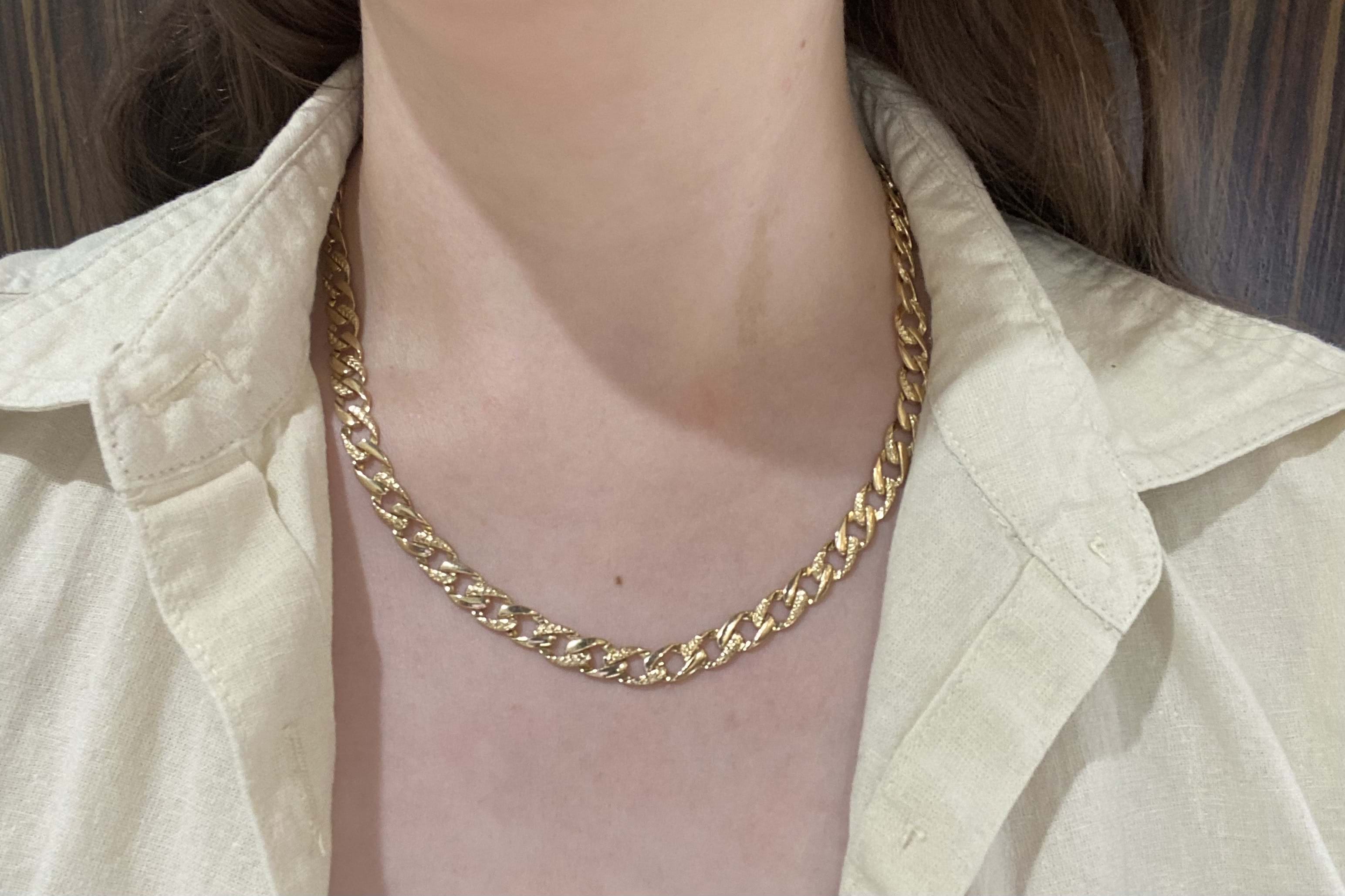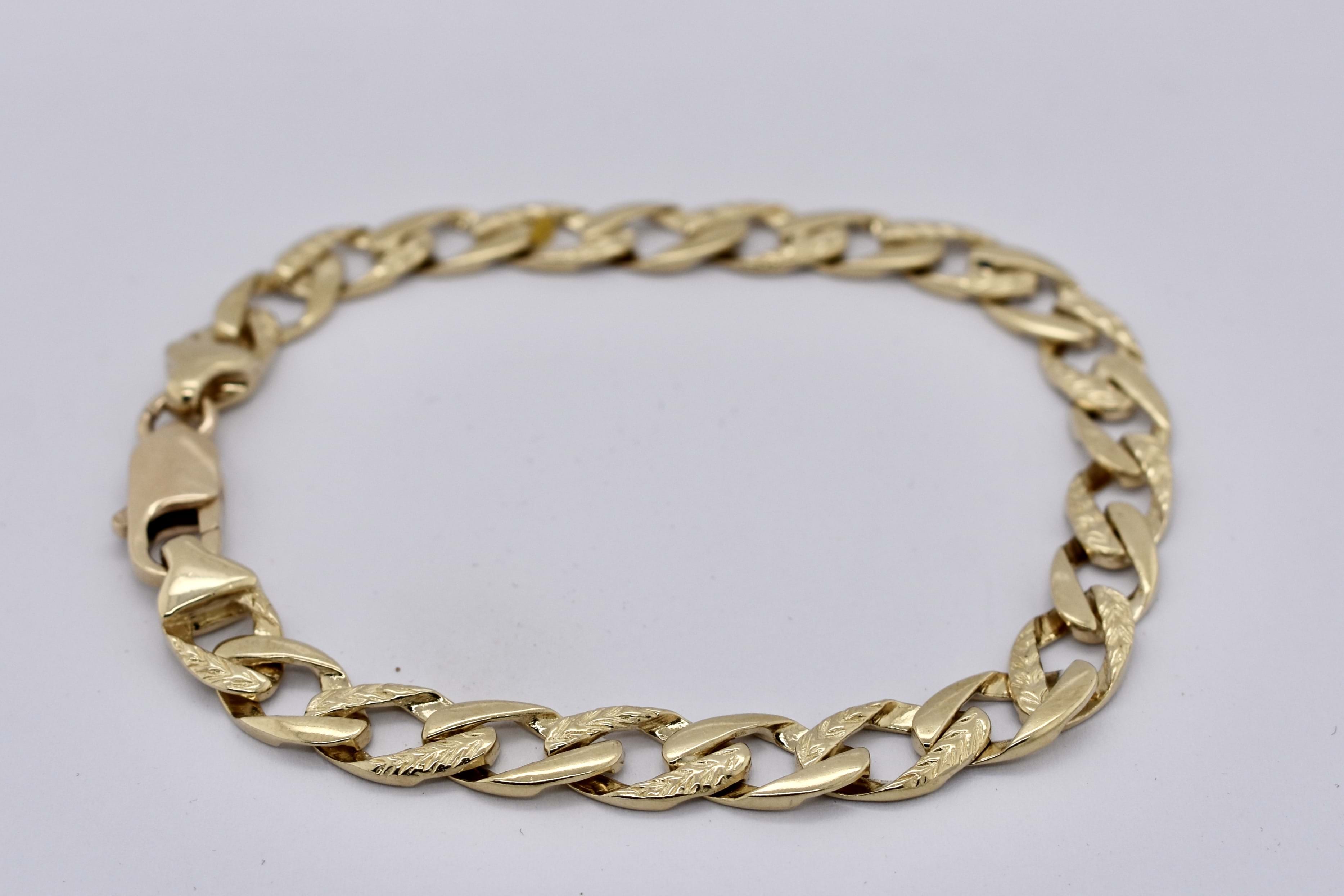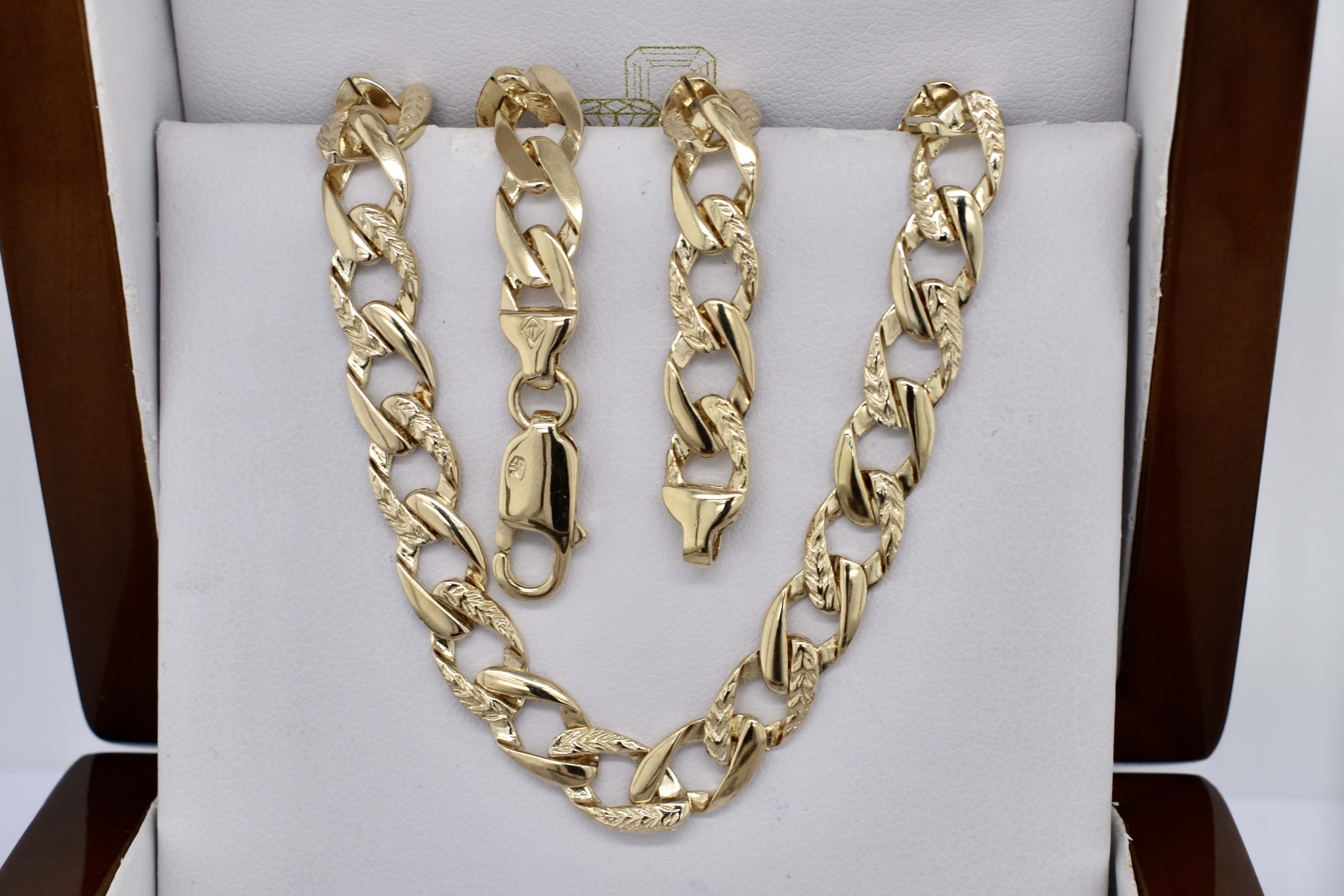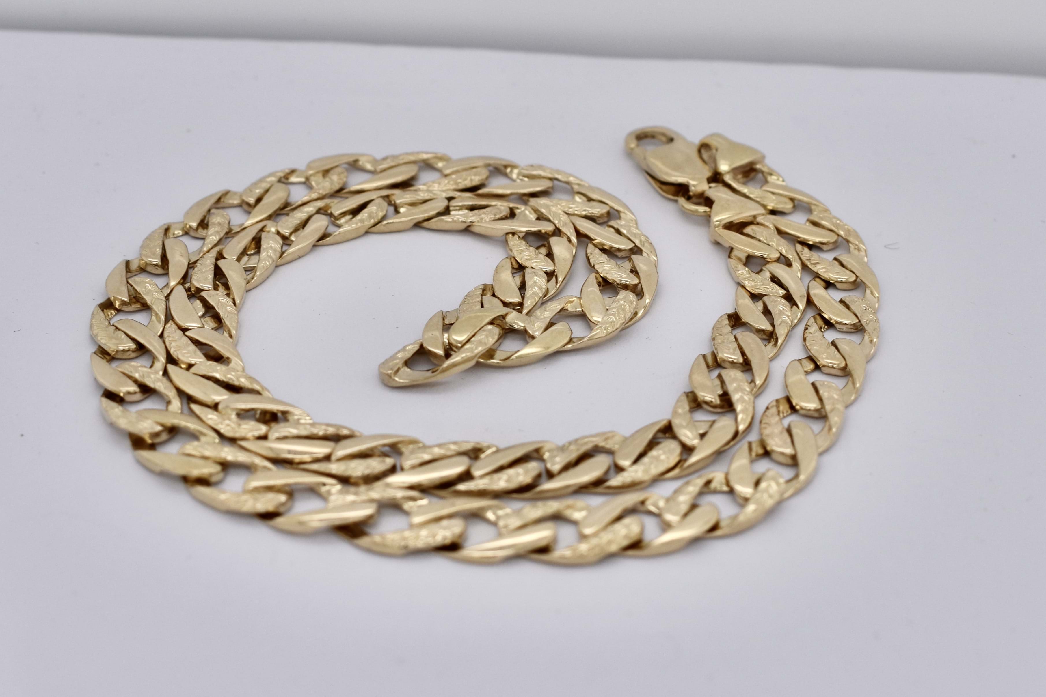 A classic flat curb link chain with a point of difference in the day/night style (alternate pattern links) crafted in 9ct yellow gold and measuring 48cm. The chain is 8mm wide and weighs 27.65g.