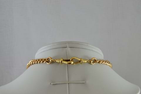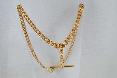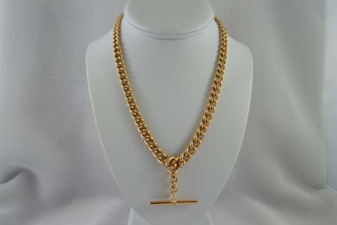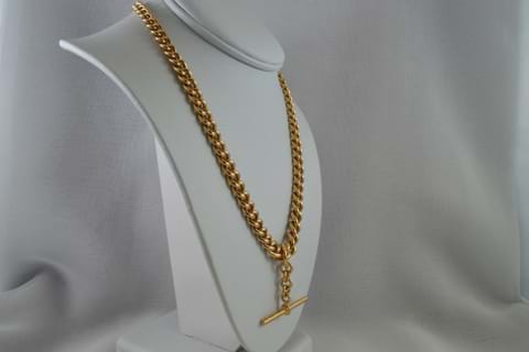 A beautifully made 9ct yellow gold curb link fob chain with sliding T-Bar and two swivel clasps. A traditional and timeless chain weighing 77.07grams.
