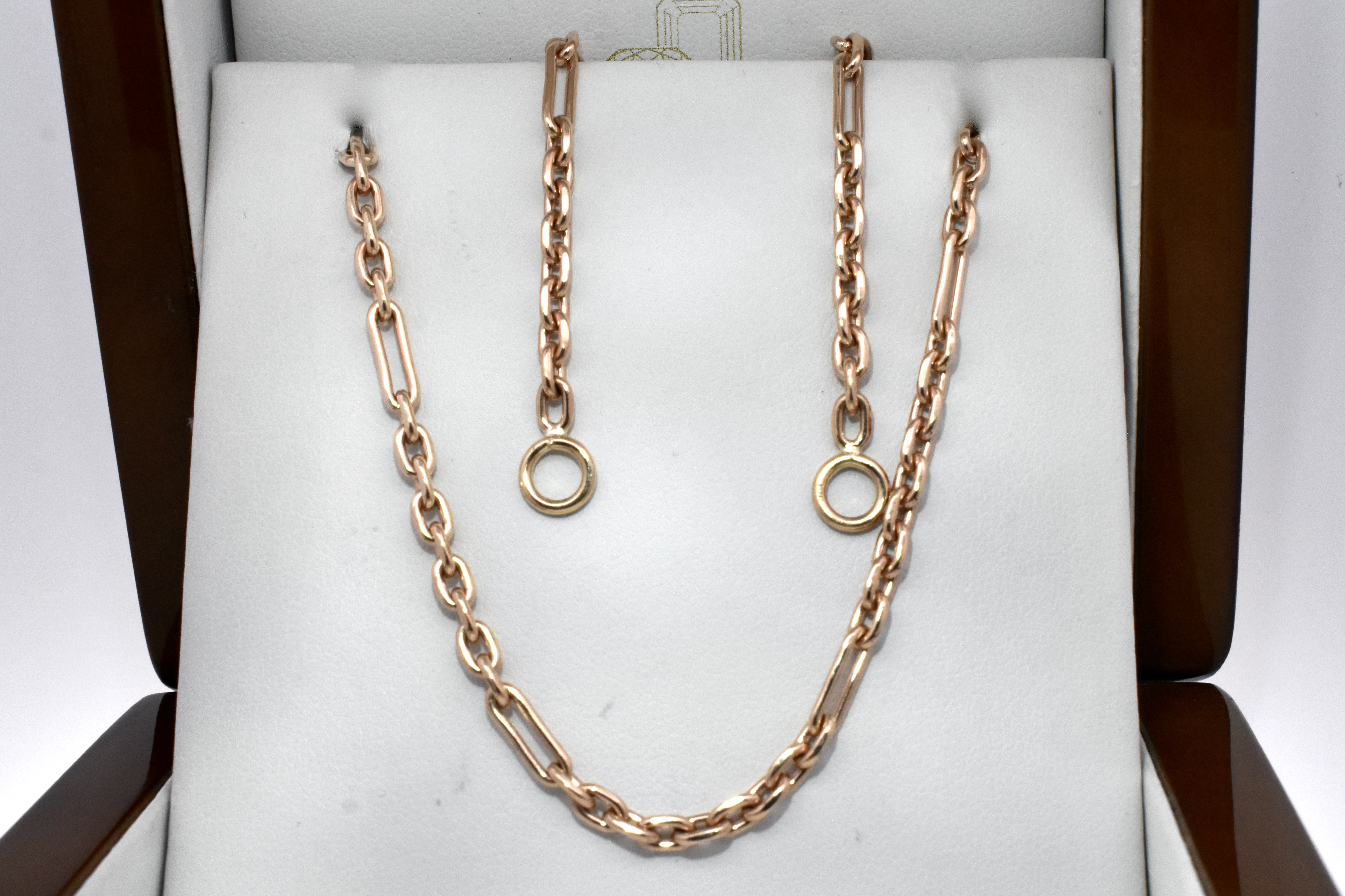 This handmade 9ct rose gold 9/1 figaro link chain has been designed to be worn especially with a carabiner as a clasp, with two gold jump ring ends which will match a rose gold carabiner perfectly. Chain weighs 14.12g and is 47.5cm long