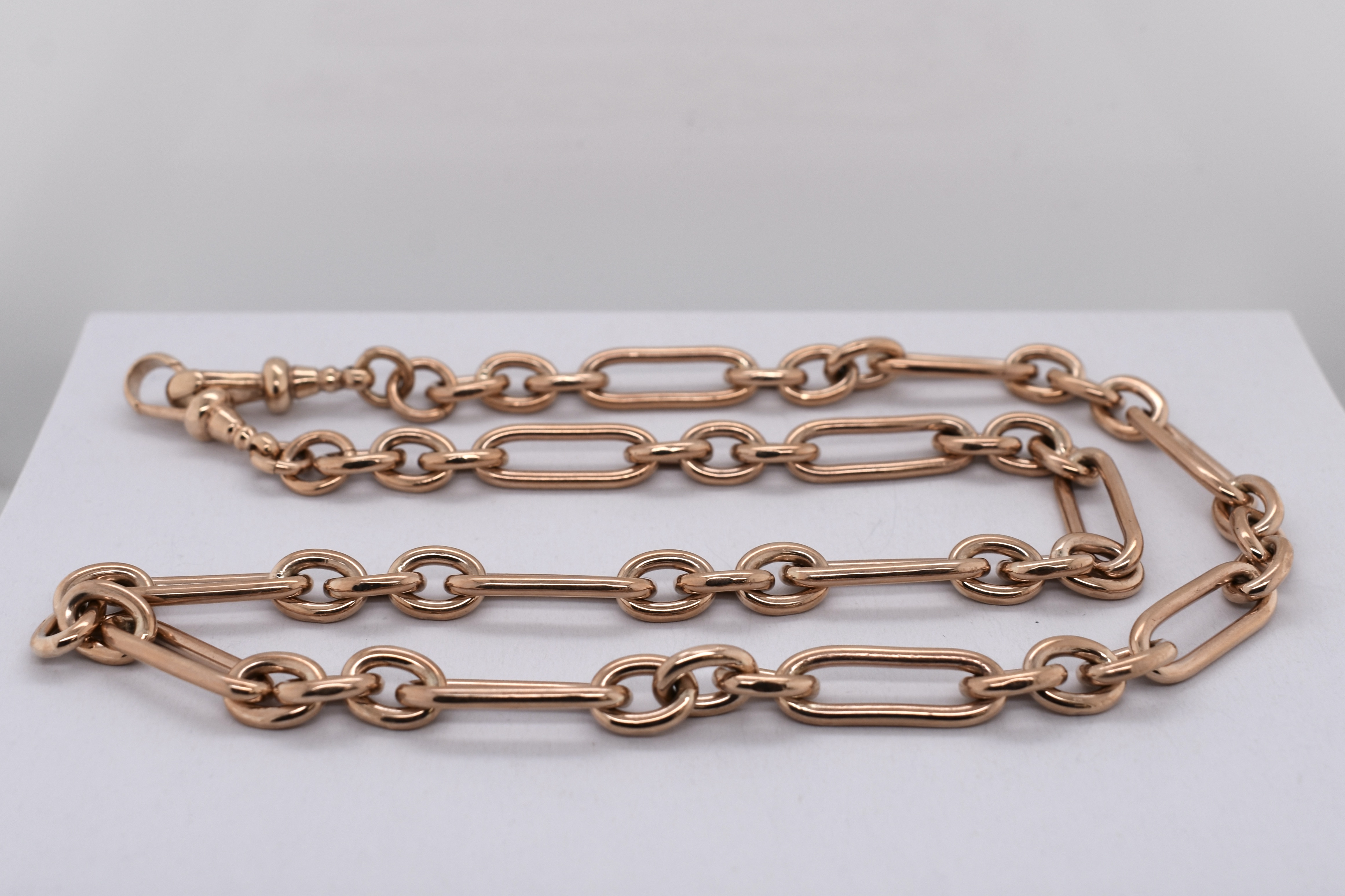 This stunning chain was handmade by our goldsmith in 9ct rose gold in this pretty 3+1 (3 short, 1 long) paperclip link. It has two 22mm swivel clasps which allow for great versatility. Chain measures 52cm long and weighs 50.99grams