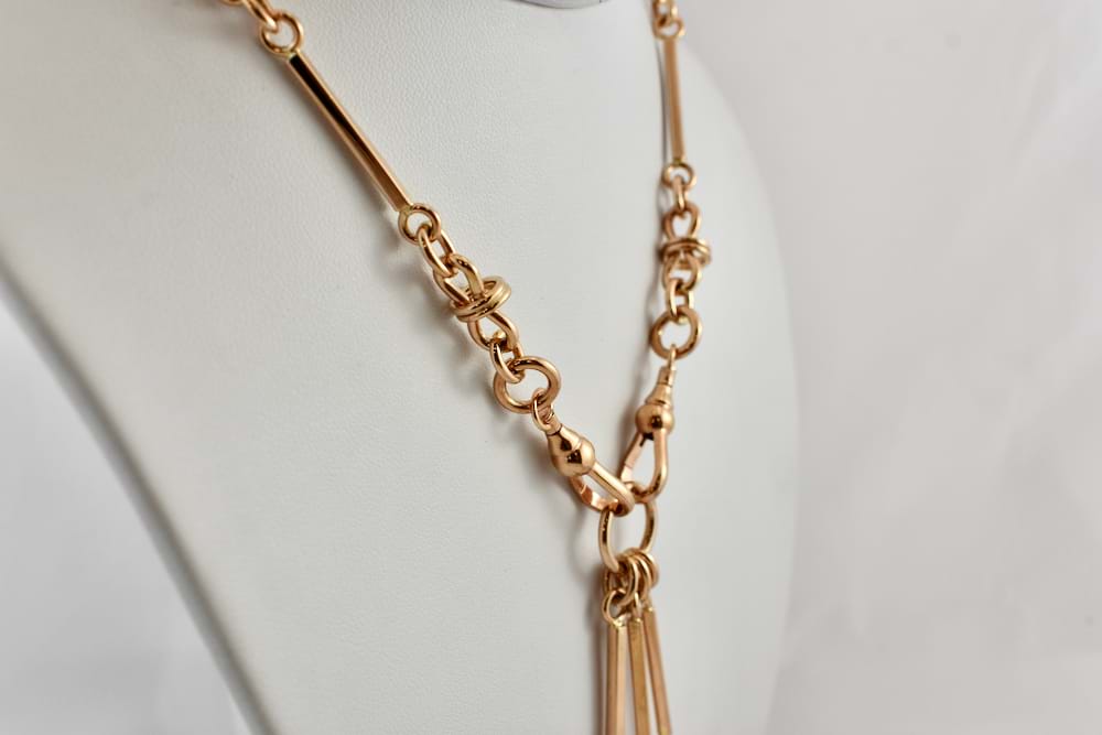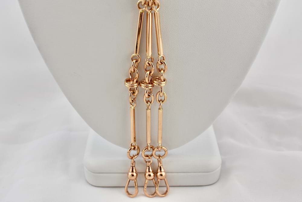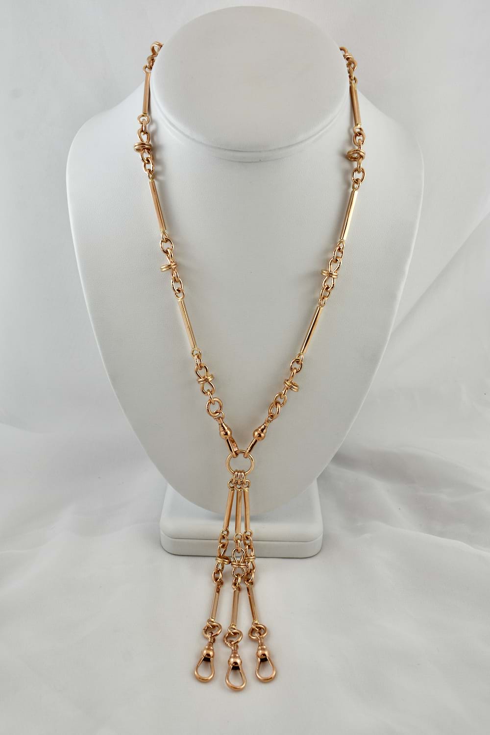 This elegantly detailed 9ct rose gold Chatelaine style chain has straight and bow style links, measuring 50cm with two swivels. There are three tassel drops all measuring 12cm long and each with its own swivel providing great versatility to hang a pendant, enhancer, seal, spinner or nothing at all from.