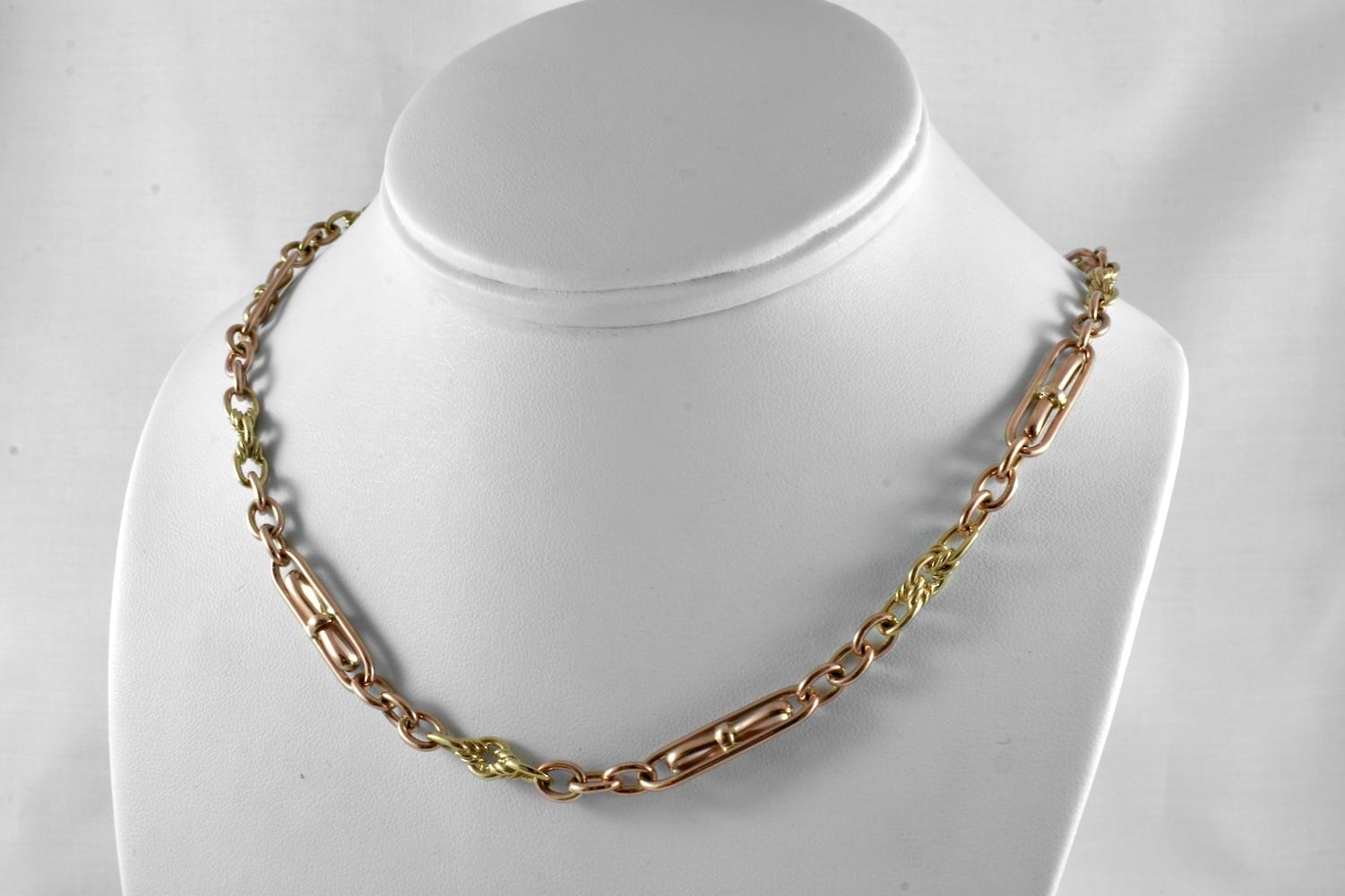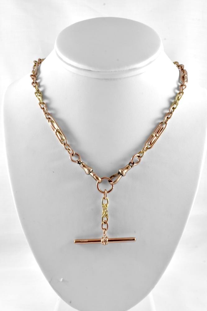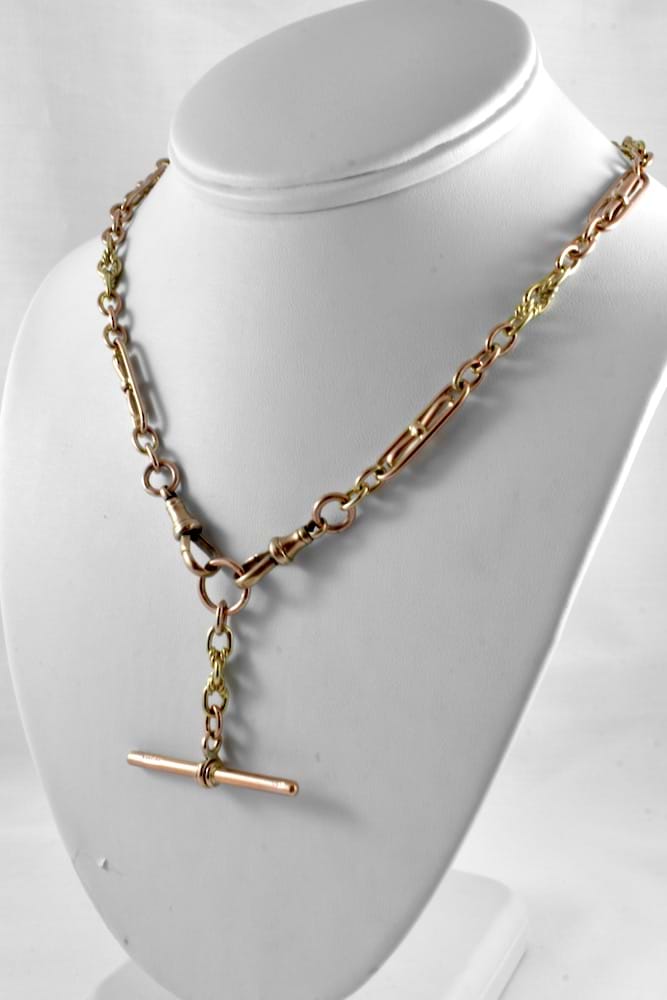 A handmade, newly crafted chain in an antique style made from 9ct yellow gold and featuring sweet Birmingham bow links and an additional sliding T-bar which can be removed. Chain weighs 41.2grams and is 55cm long with two vintage swivels