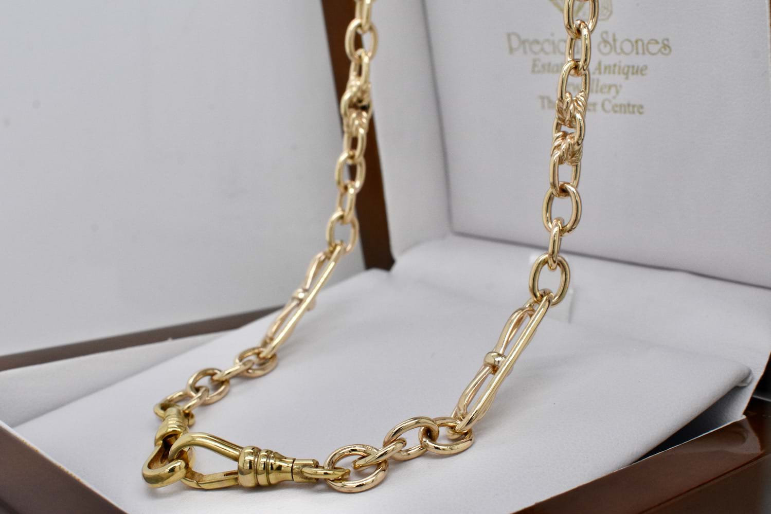 This beautiful handmade 9ct yellow gold chain is based on an antique chain link which our talented goldsmith was able to recreate for our store. Measuring 50cm with two 24mm swivels, this Birmingham bow link chain is a stunning foundation to add antique trinkets to or to wear alone. Weight: 31.70grams