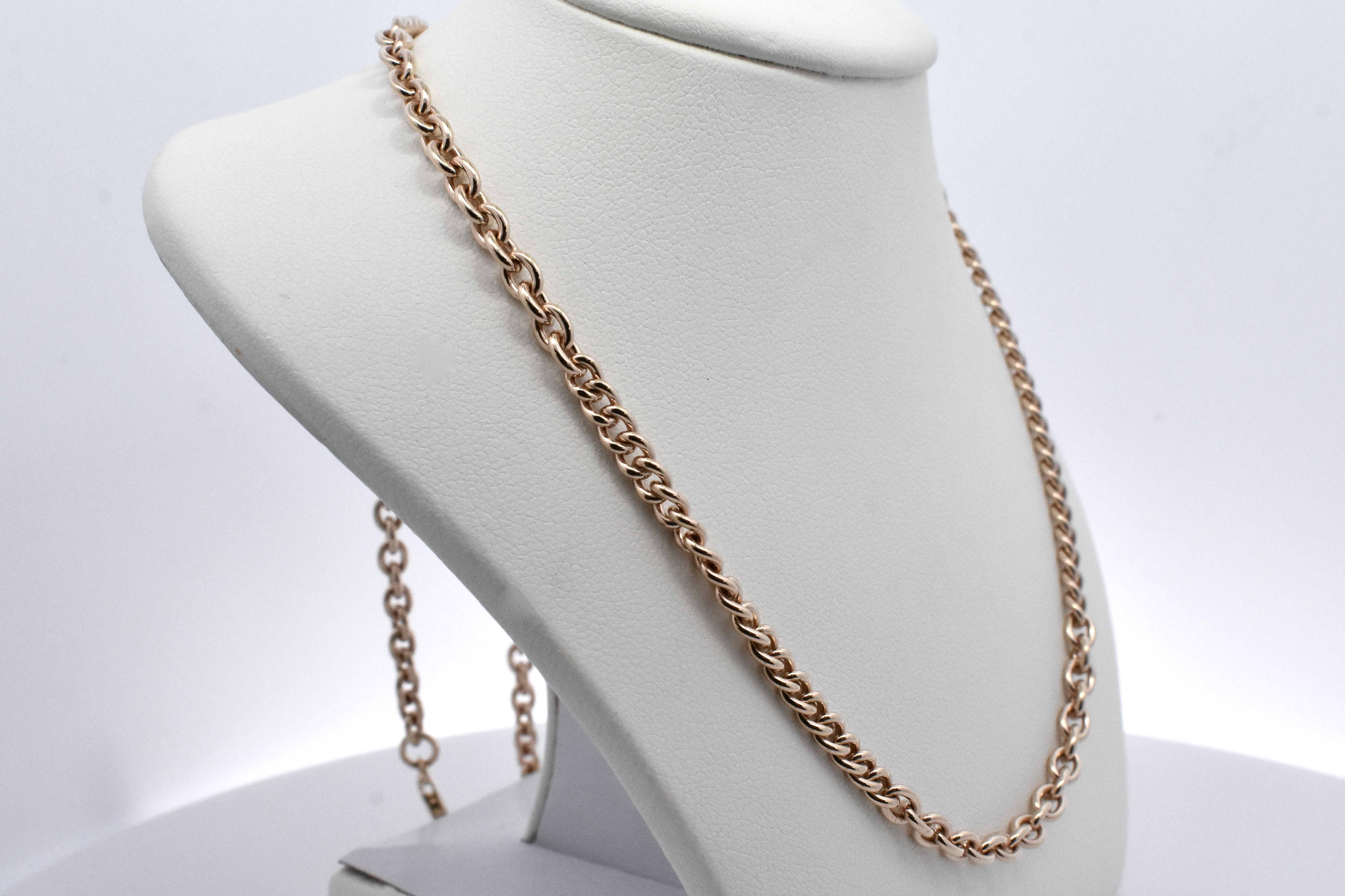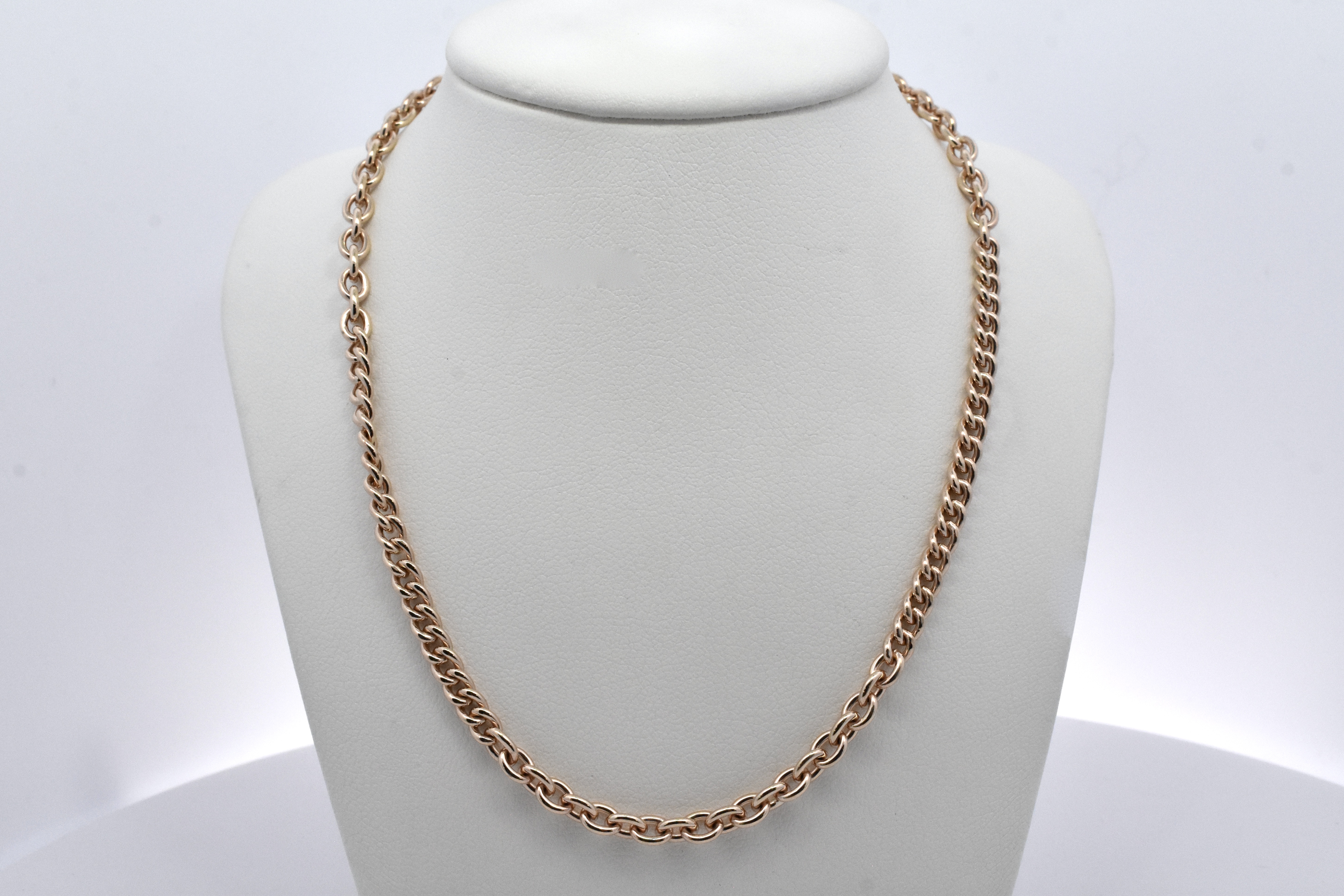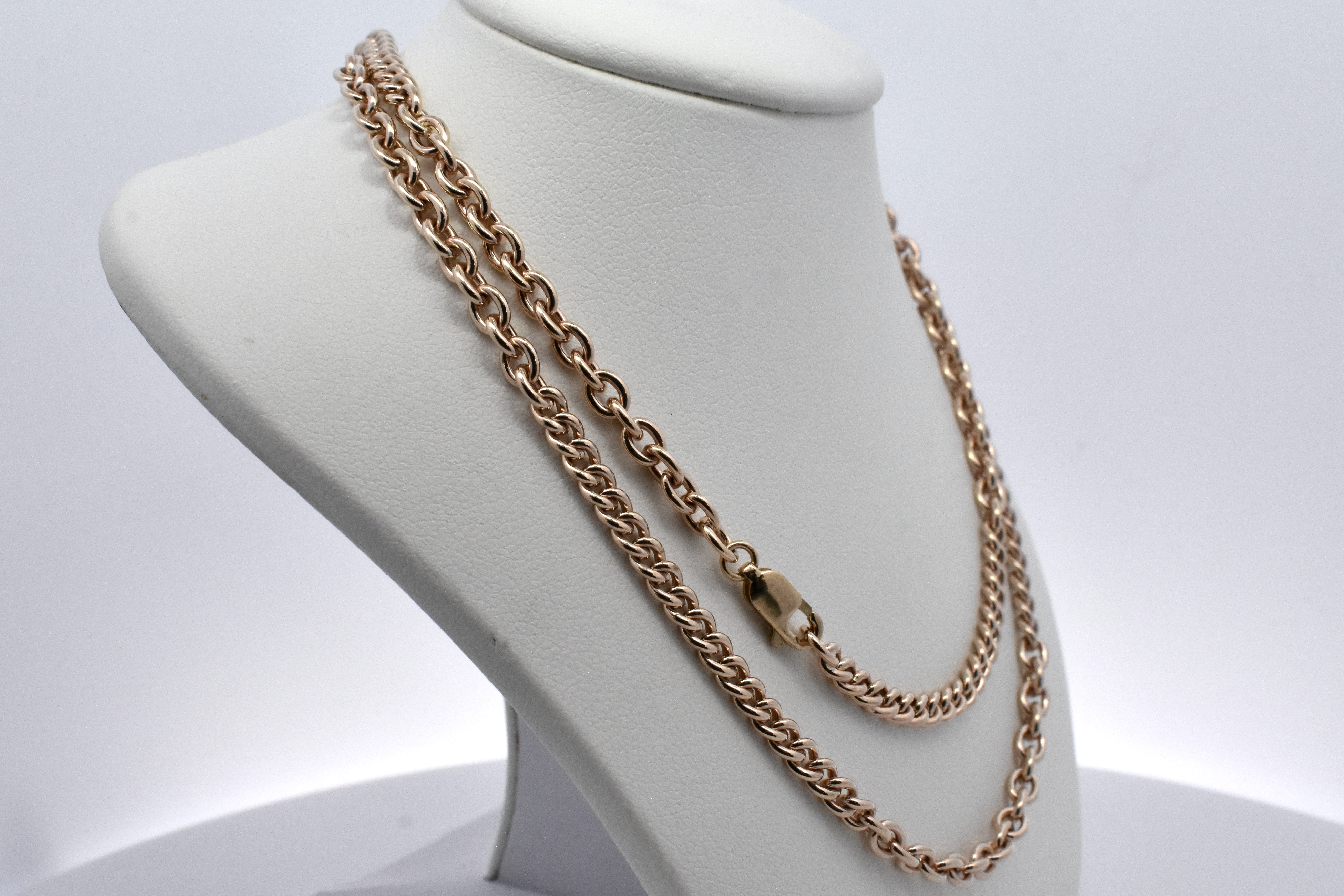 Stunning and versatile chain handmade by our goldsmith in 9ct yellow gold. The chain features alternate sections of our classic cable link and curb link with a 10x4mm parrot clasp at back. Ideal for wearing most pendants, with the beneficial strength of being handmade allowing it to carry heavy items such as pocket watches. Length: 51.5cm Weight: 17.68g.