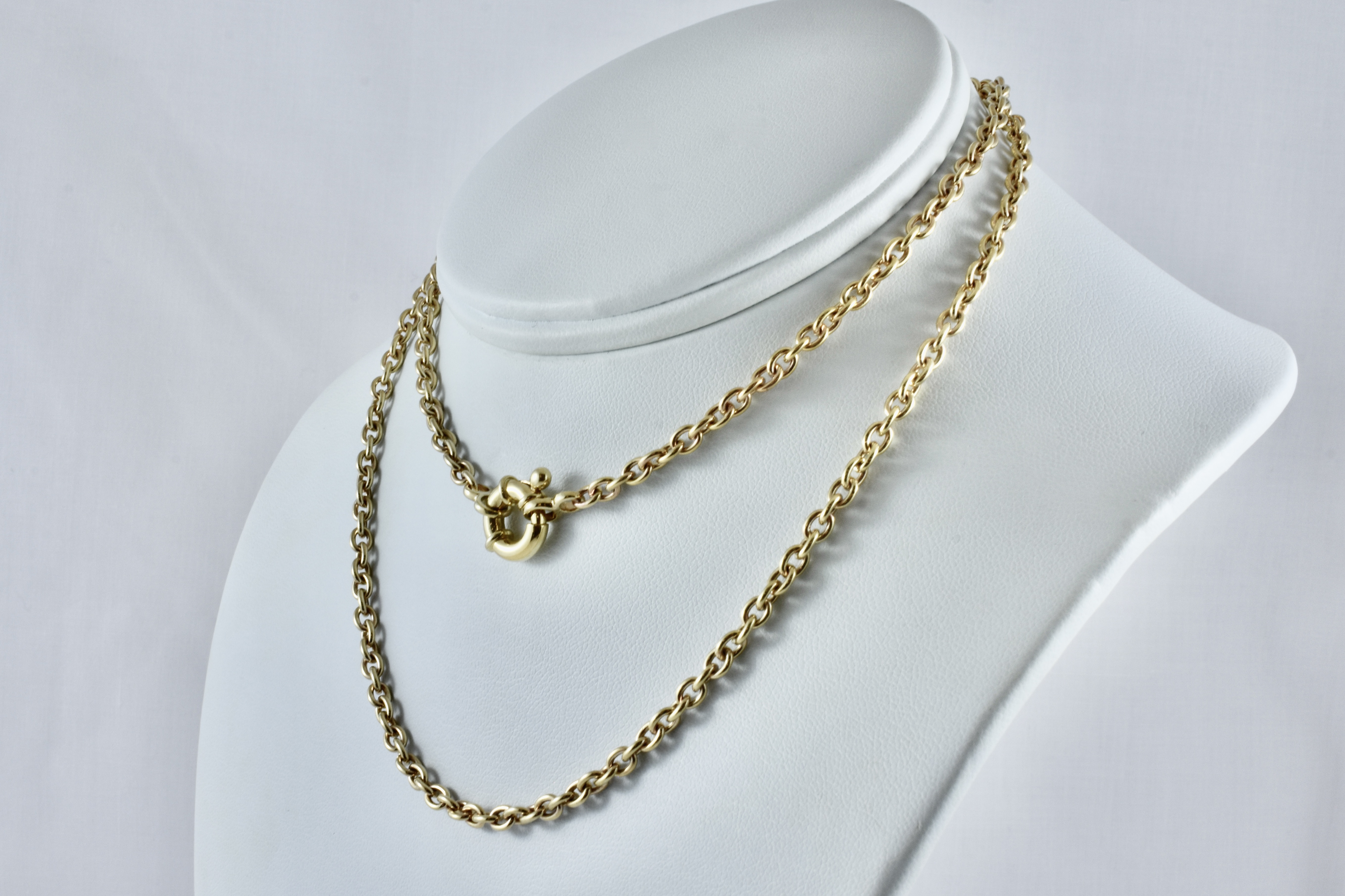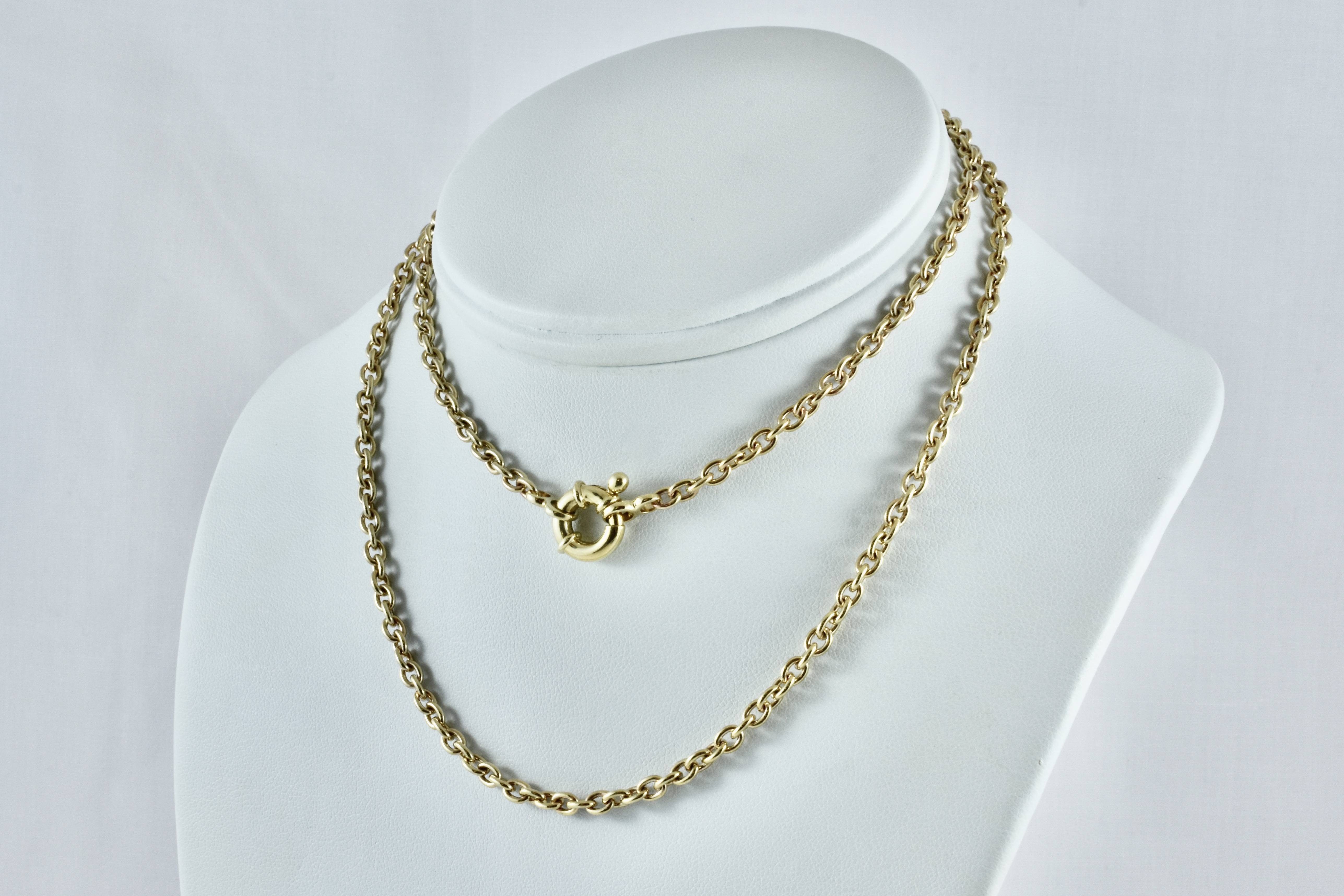 A timeless and classic solid 9ct yellow gold cable link handmade by our gold smith with a European boltring clasp. Total length is 66cm, total weight is 21.30grams (Pendant pictured is available for separate purchased)