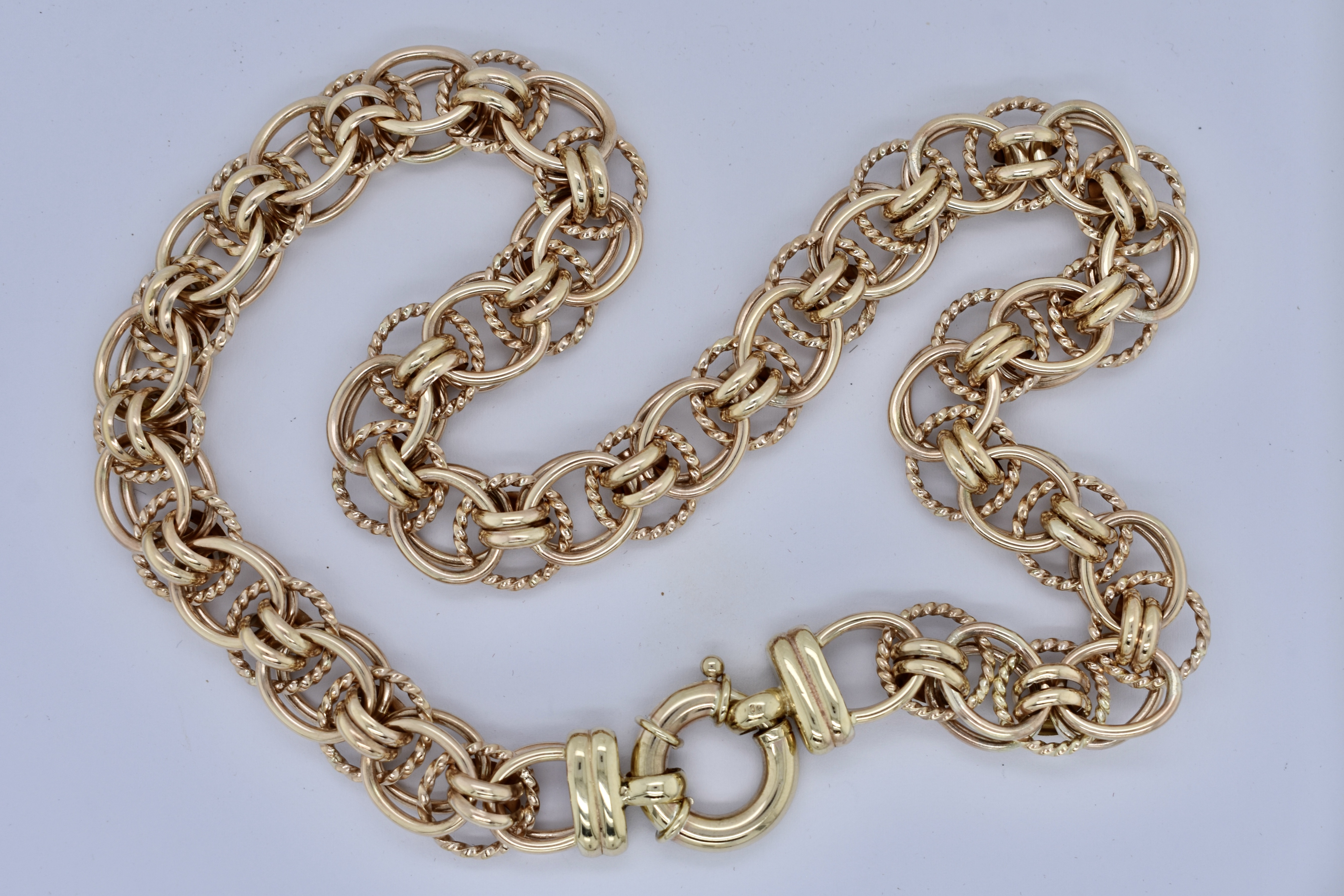 Stunning handmade 9ct yellow gold Italian link chain expertly crafted by our goldsmith and measuring 46cm with a European bolt ring clasp. The chain weighs 87.64g.