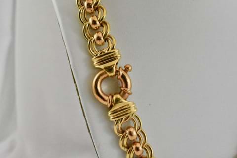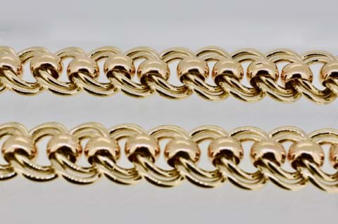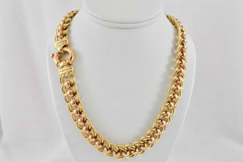 An impressive and striking, solid, 9ct yellow gold double curb link chain with 9ct rose gold belcher links between each curb link. Weighing an amazing 137.63grams and with a classic and timeless rose gold European bolt ring clasp, this chain is beautiful when worn alone or when paired with an enhancer. Independent Valuation Supplied