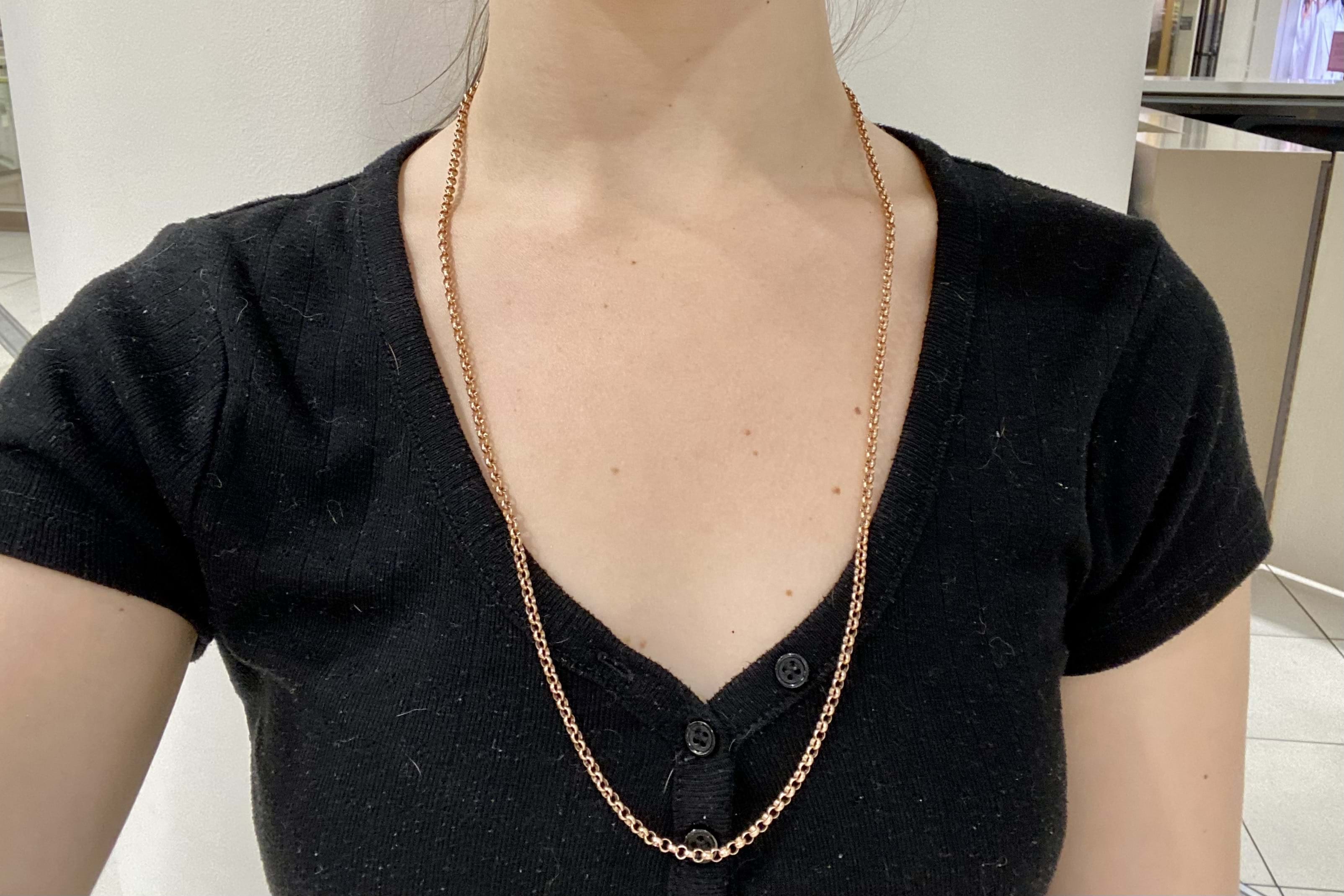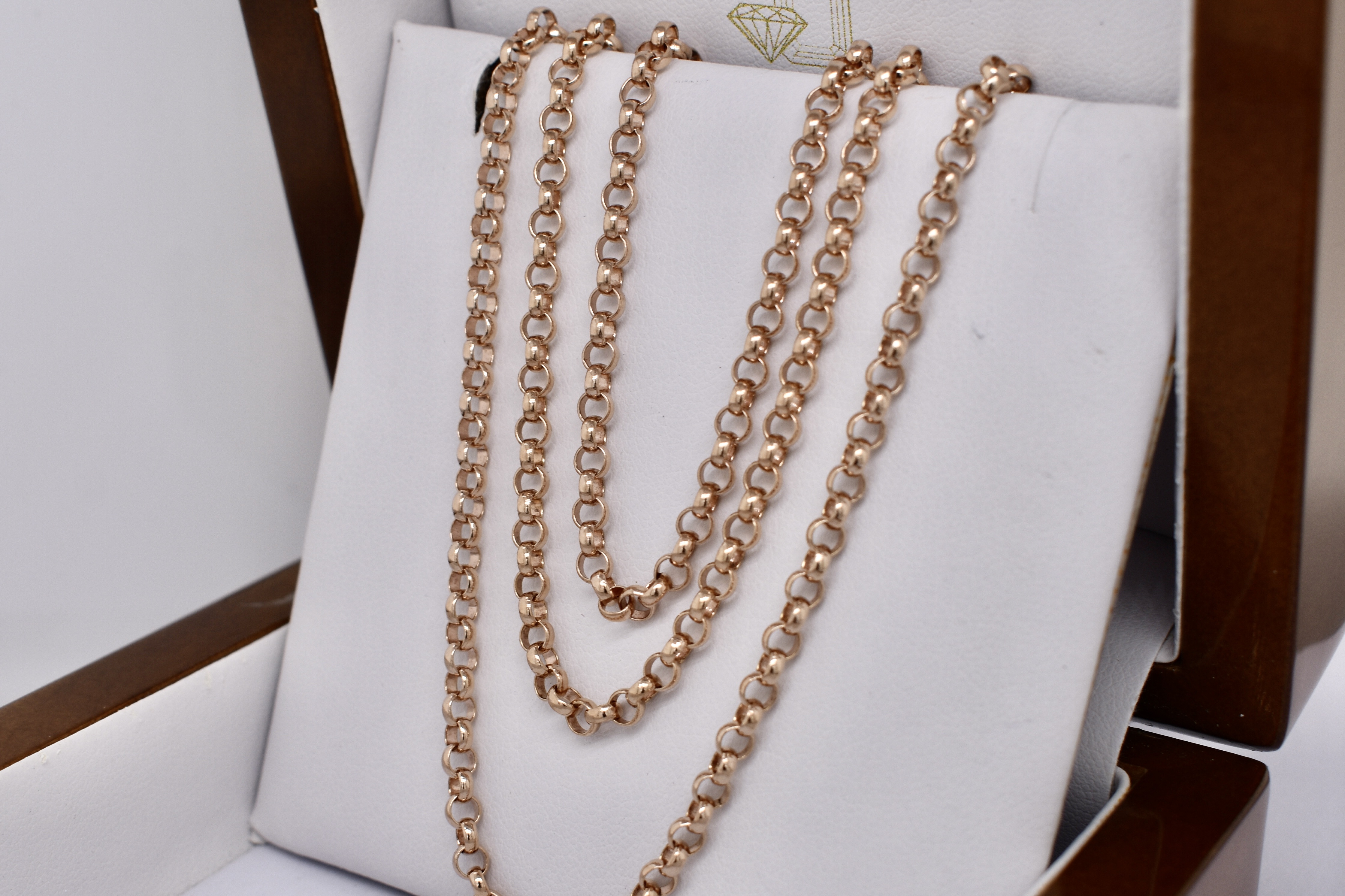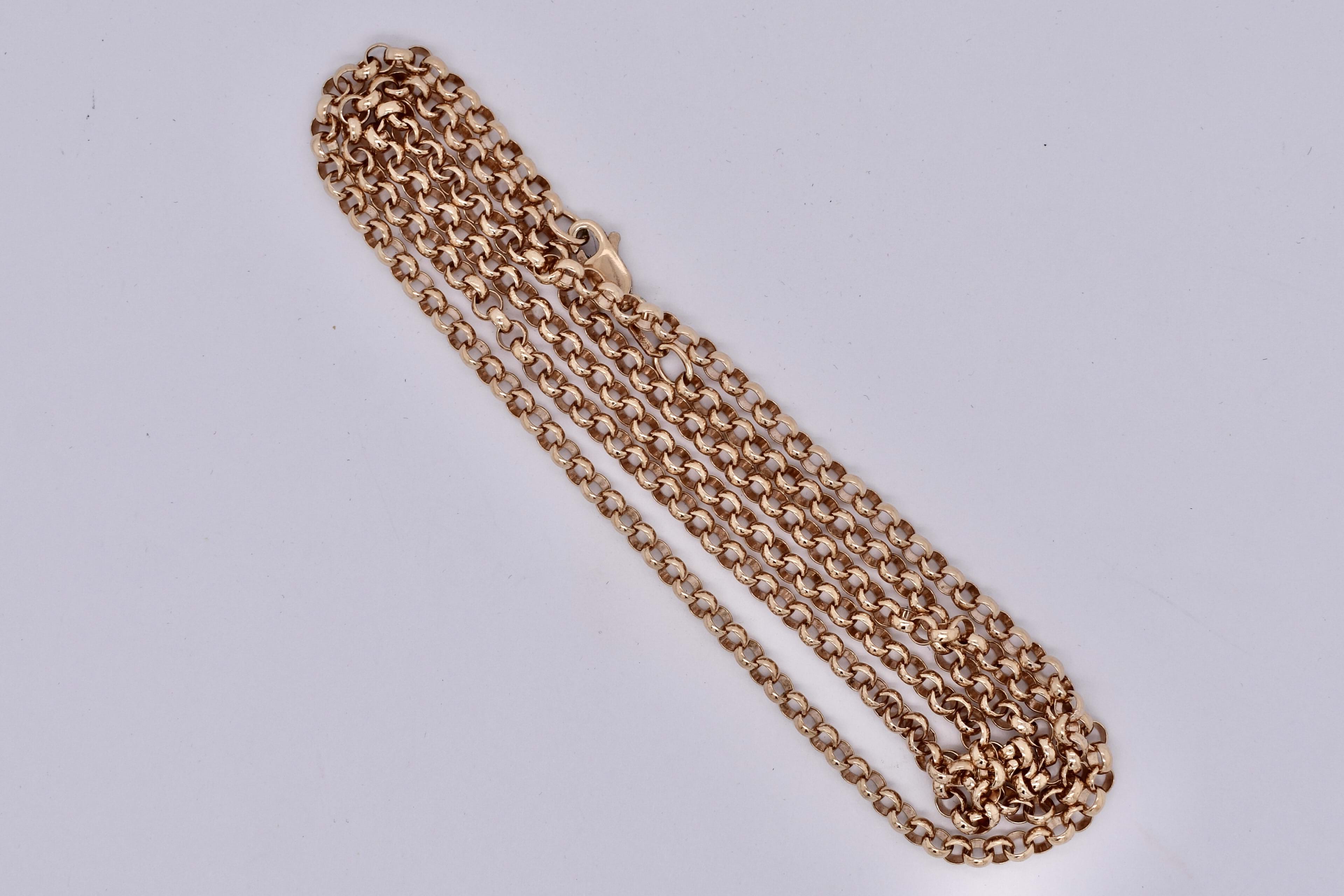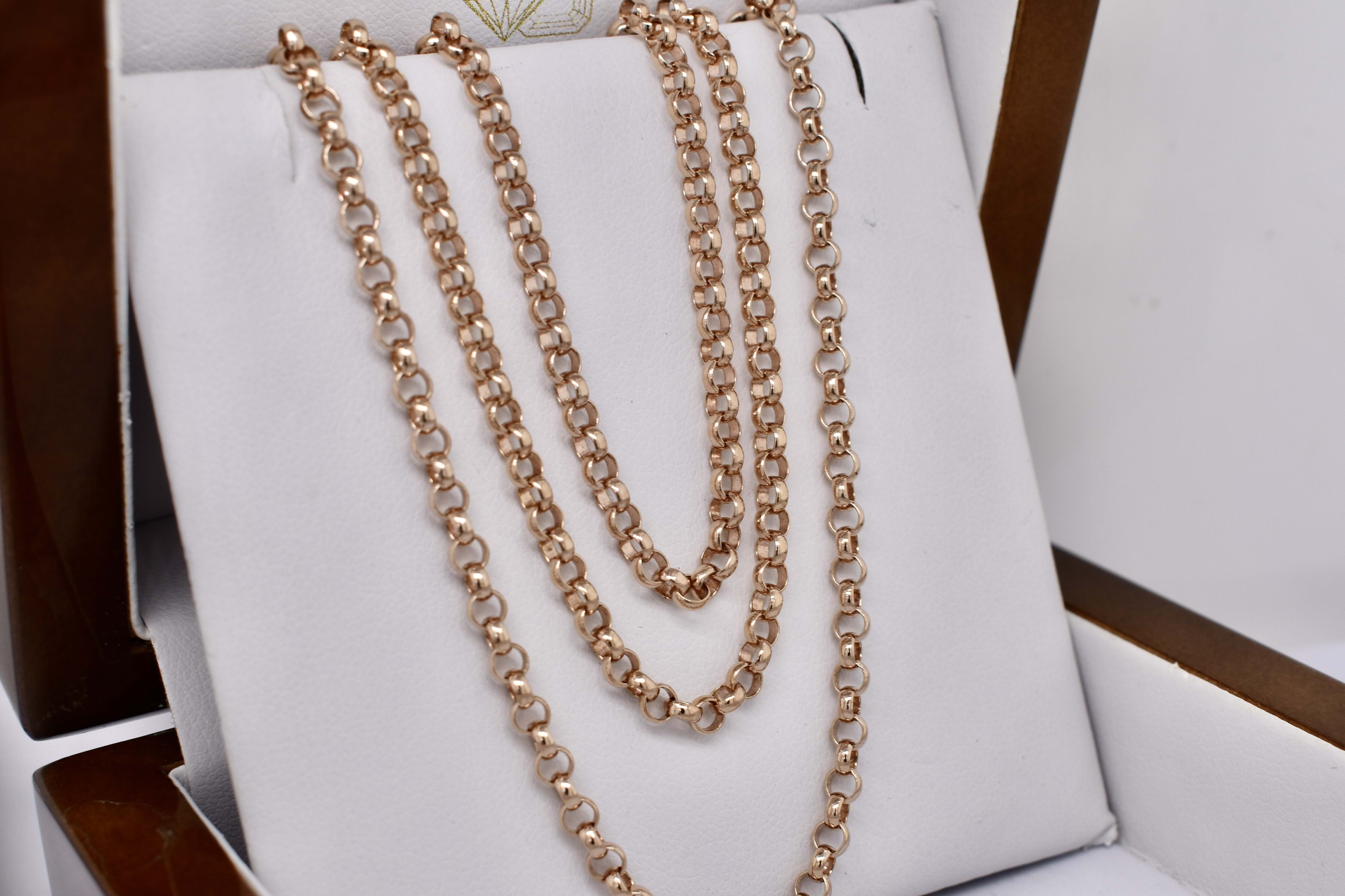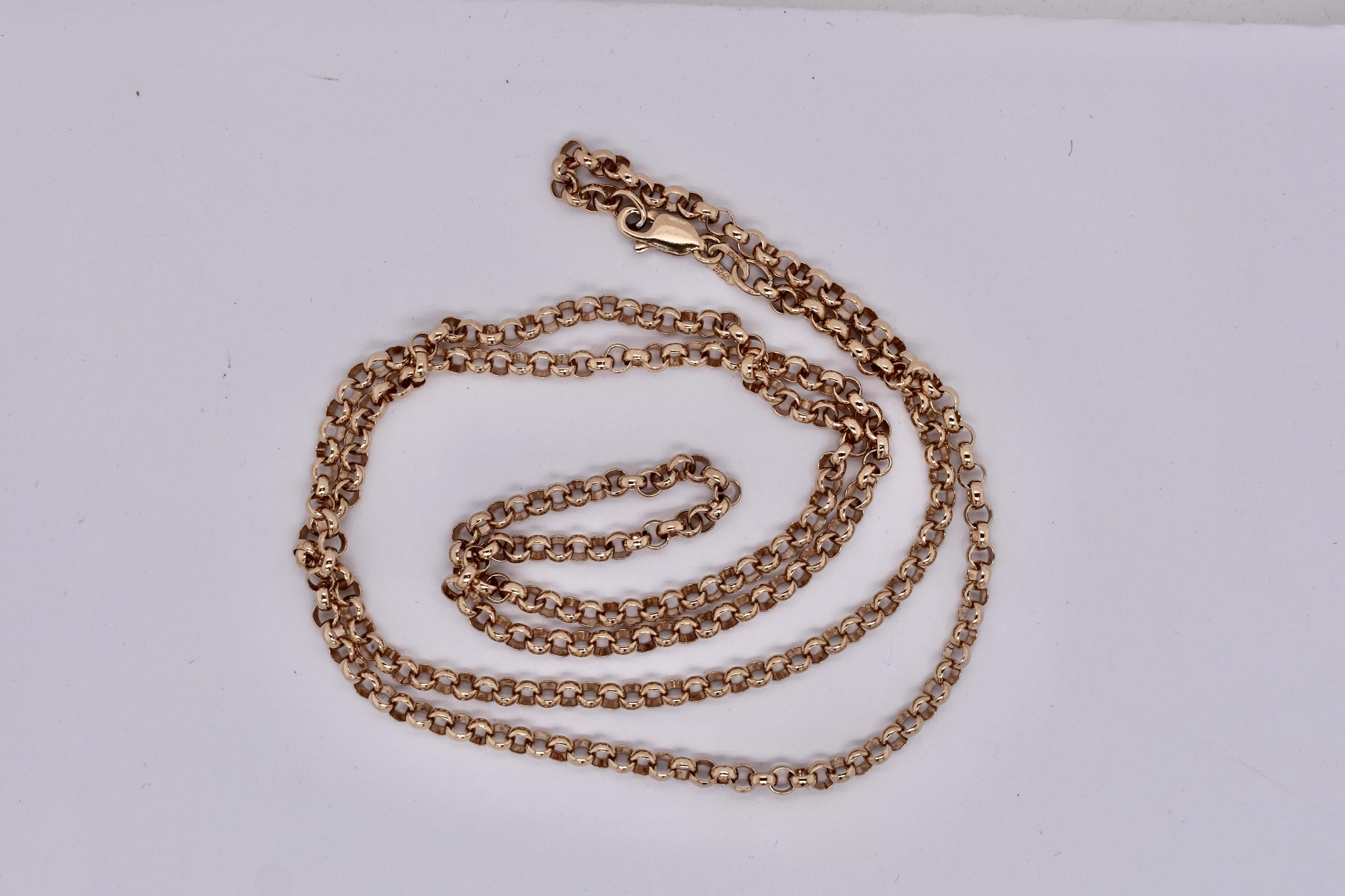 Stunning 9ct rose gold vintage chain crafted in a round belcher link, measuring 67cm long. Finished with a parrot clasp. Weighs 14.16 grams.