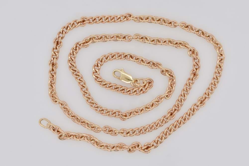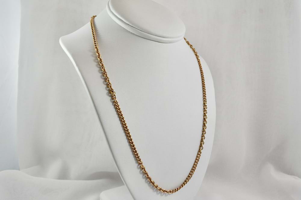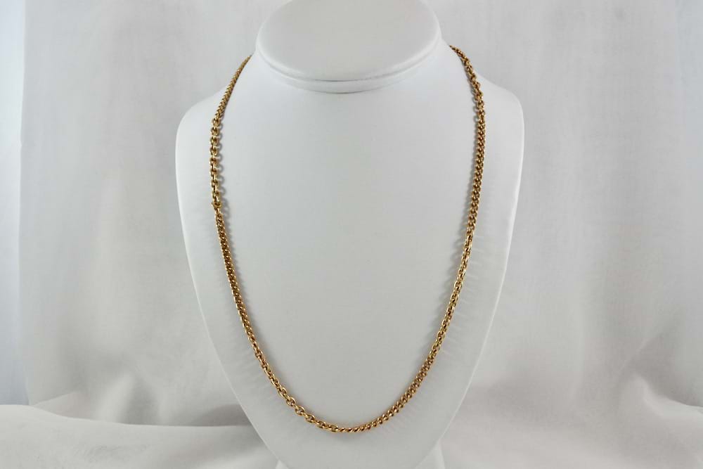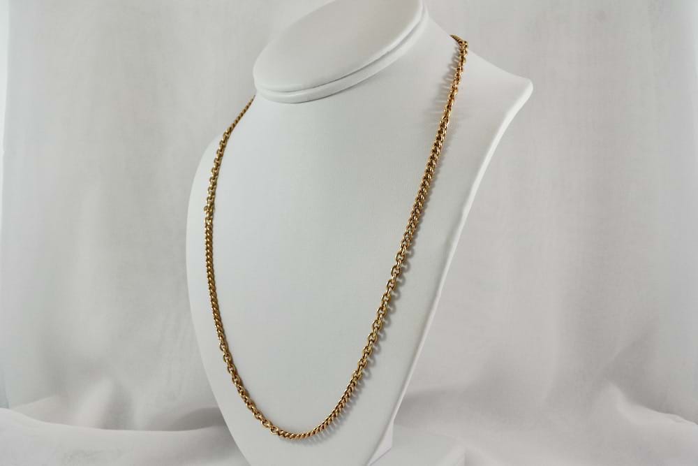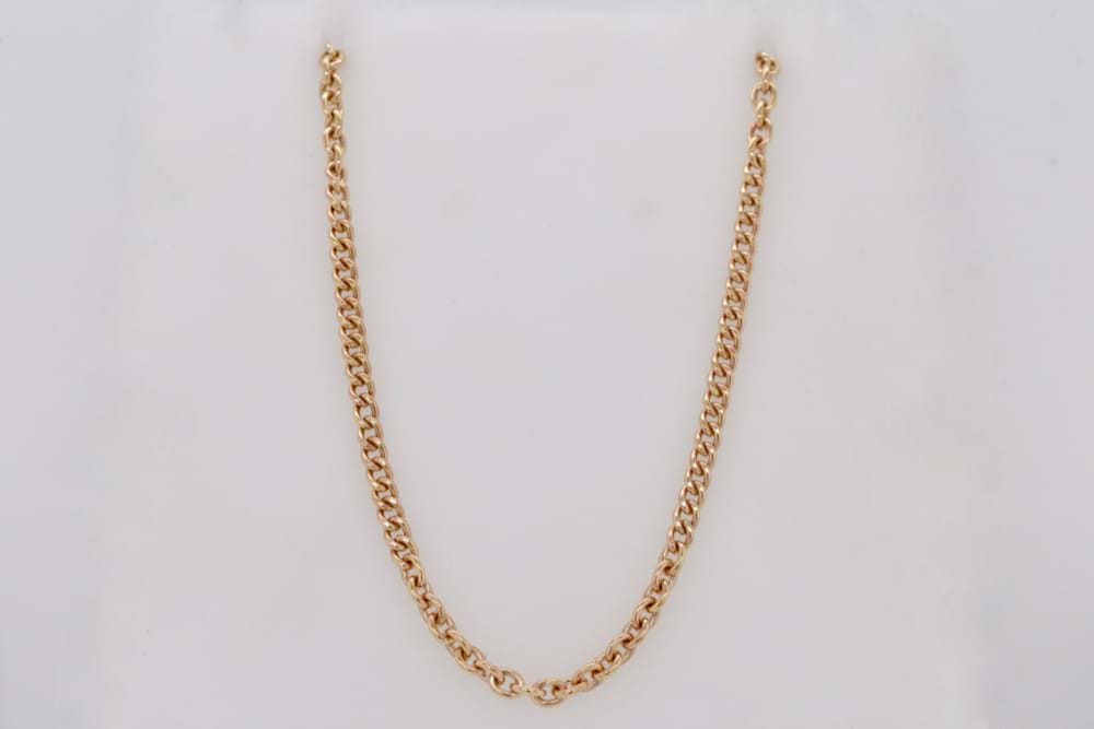 This beautiful handmade chain features alternating sections of curb link and cable link with ta parrot clasp in 9ct gold. In a warm old gold colour this chain is ideal to suspend lockets or antique trinkets! Measures 55cm, 17grams