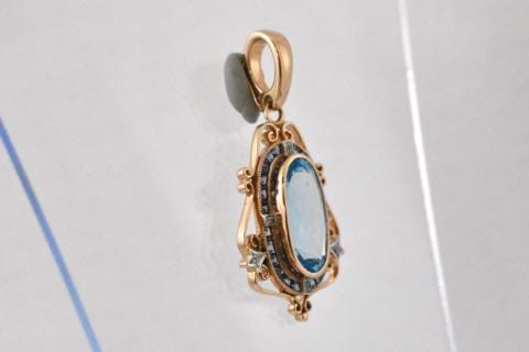 Absolutely gorgeous! This devine Victorian inspired enhancer has been crafted in 9ct rose gold and features a vivid 20.24ct blue topaz in the centre surrounded by a channel set halo of Ceylon blue sapphires equaling 1.75cts and separated in four places by 2 shimmering round brilliant cut diamonds with a combined total of 0.03cts. A stunning addition to a rose gold fob chain or strand of pearls. Independent Valuation Supplied
