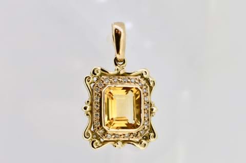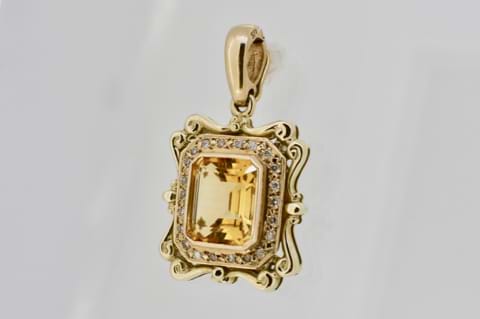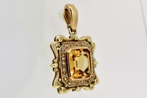 A stunning 5.10ct emerald cut citrine, bezel set in yellow gold with a rose gold grain set diamond halo surrounding it and a scalloped yellow gold outer surround. This classic, yet different enhancer has been crafted in 9ct gold and contains 22 round brilliant cut diamonds in the halo totalling 0.22cts. Independent Valuation Supplied