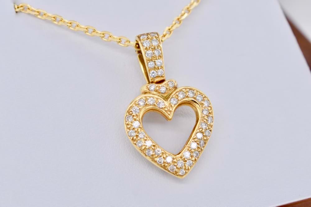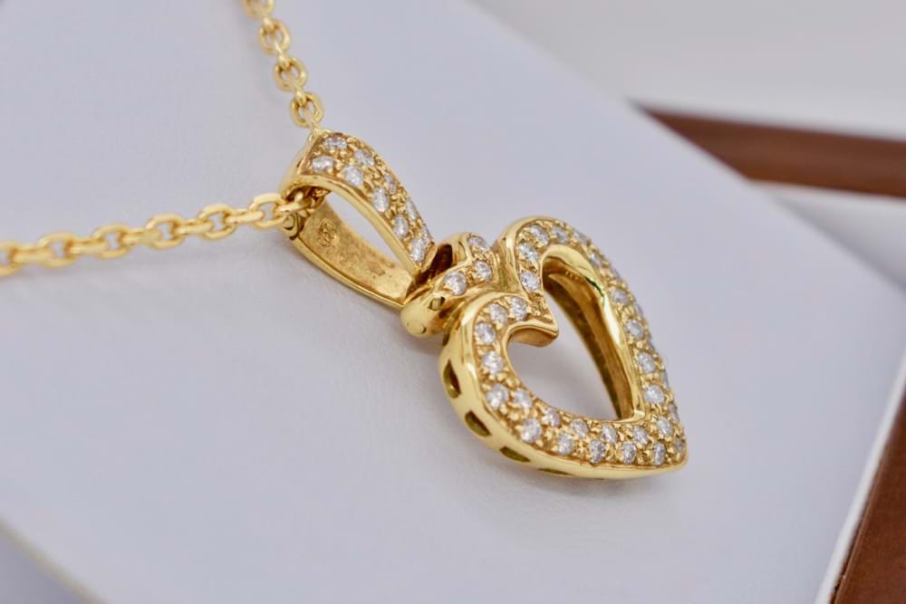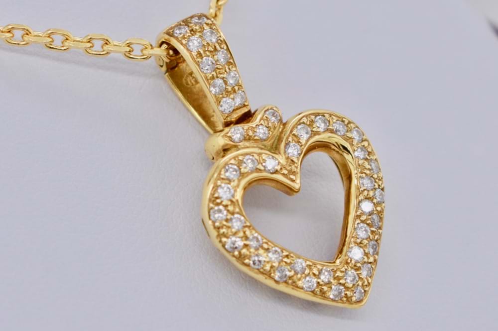 Elegant 18ct yellow gold diamond heart enhancer. The heart is set with 45 round brilliant cut diamonds pave set totaling 0.45ct. The enhancer bail is also pave set with diamonds.