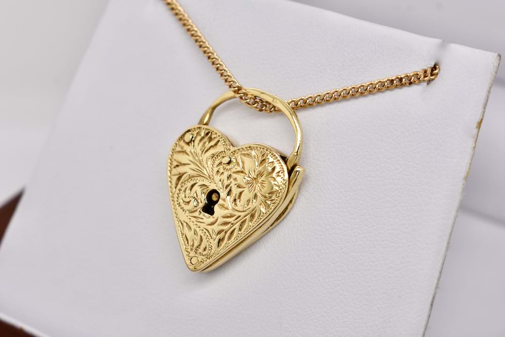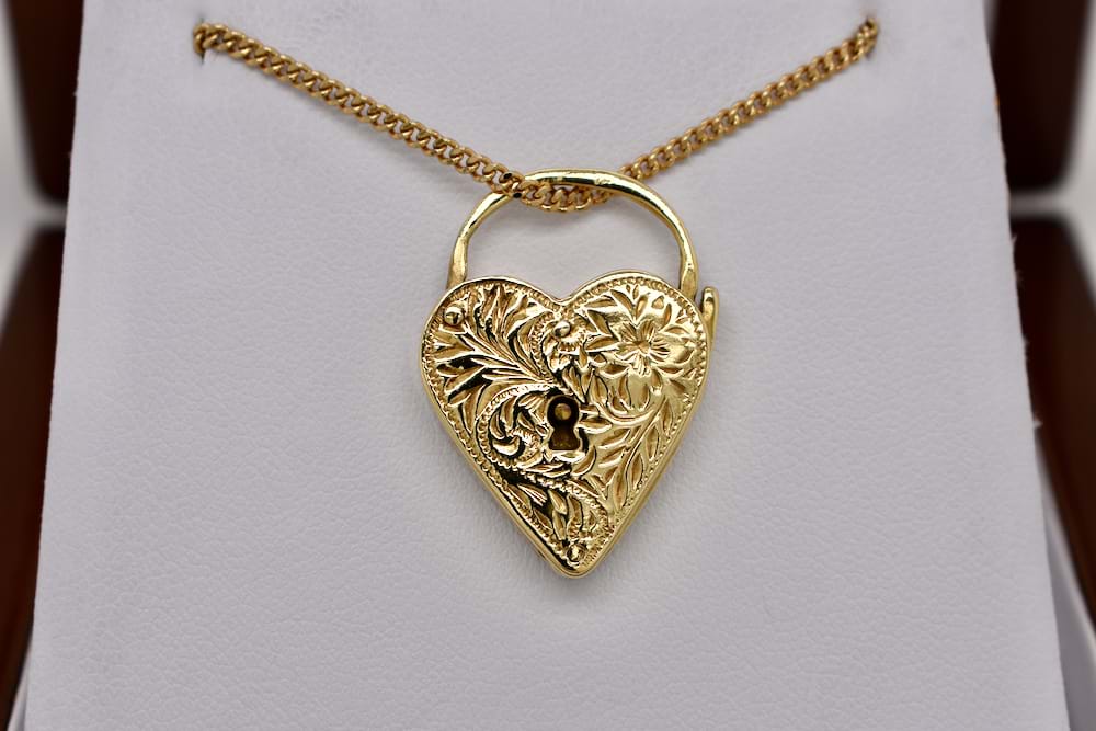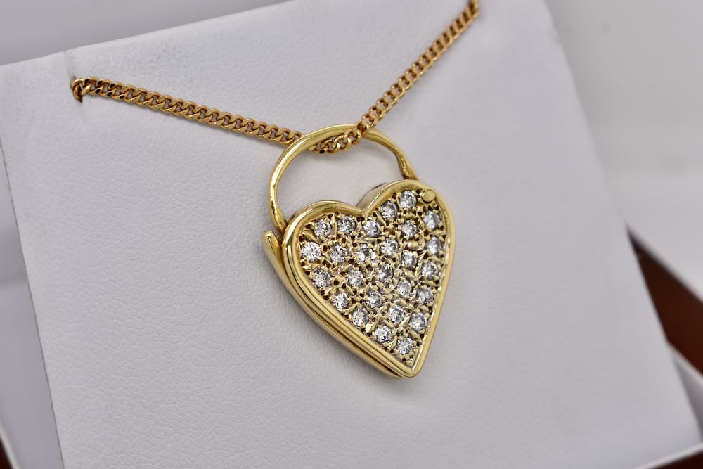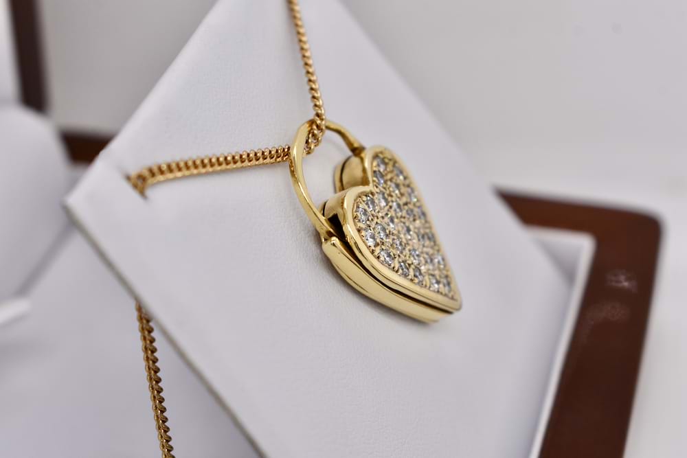 This sparkling and stunning 18ct yellow gold heart padlock is encrusted with 28 round brilliant cut G/SI diamonds totalling 0.78ct on one side and beautiful plain engraved floral detail on the other side. The padlock measures 19 x 20mm, and would be beautiful on a bracelet or suspended as a pendant from a chain as pictured. Chains are available for separate purchase. Independent Valuation Supplied