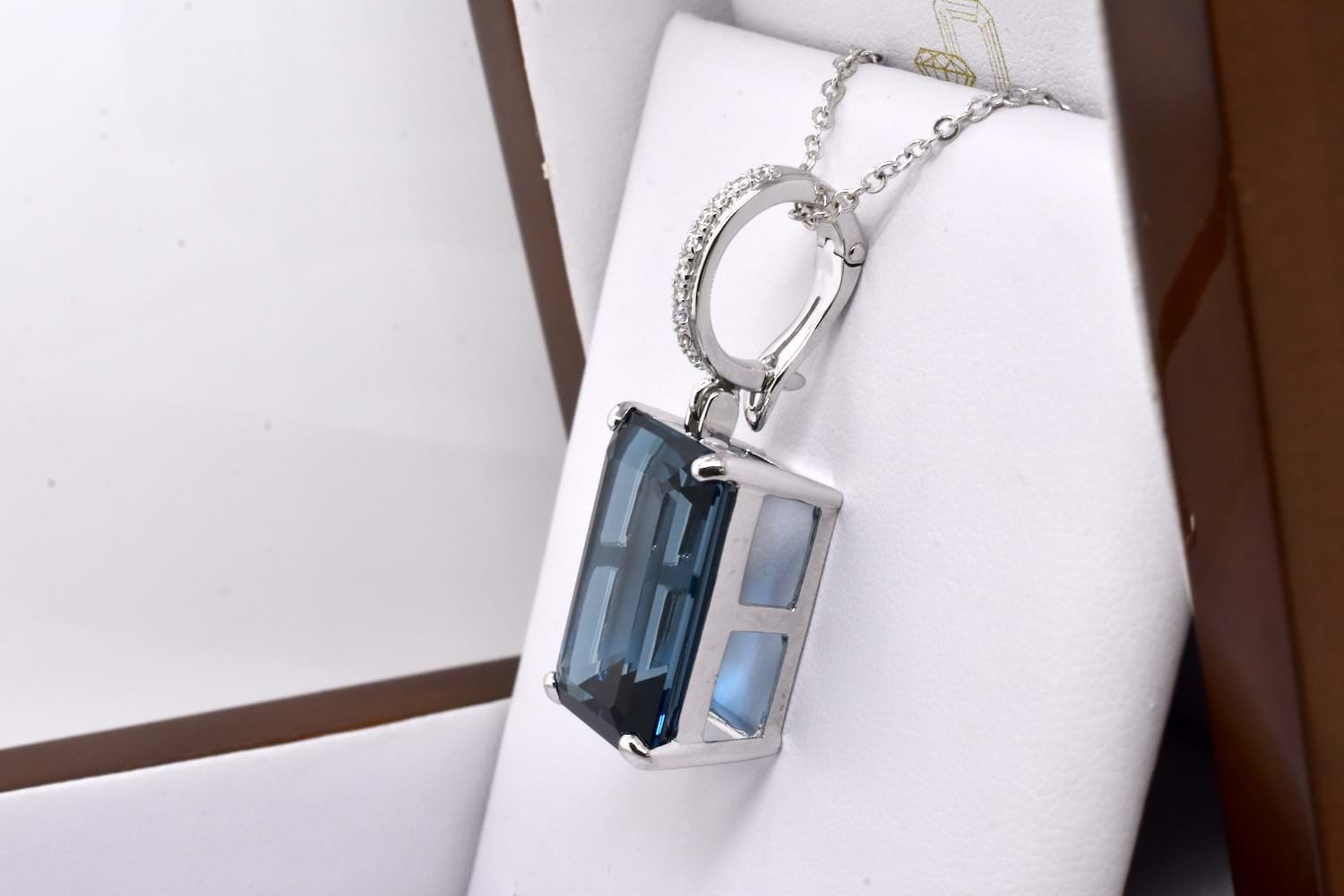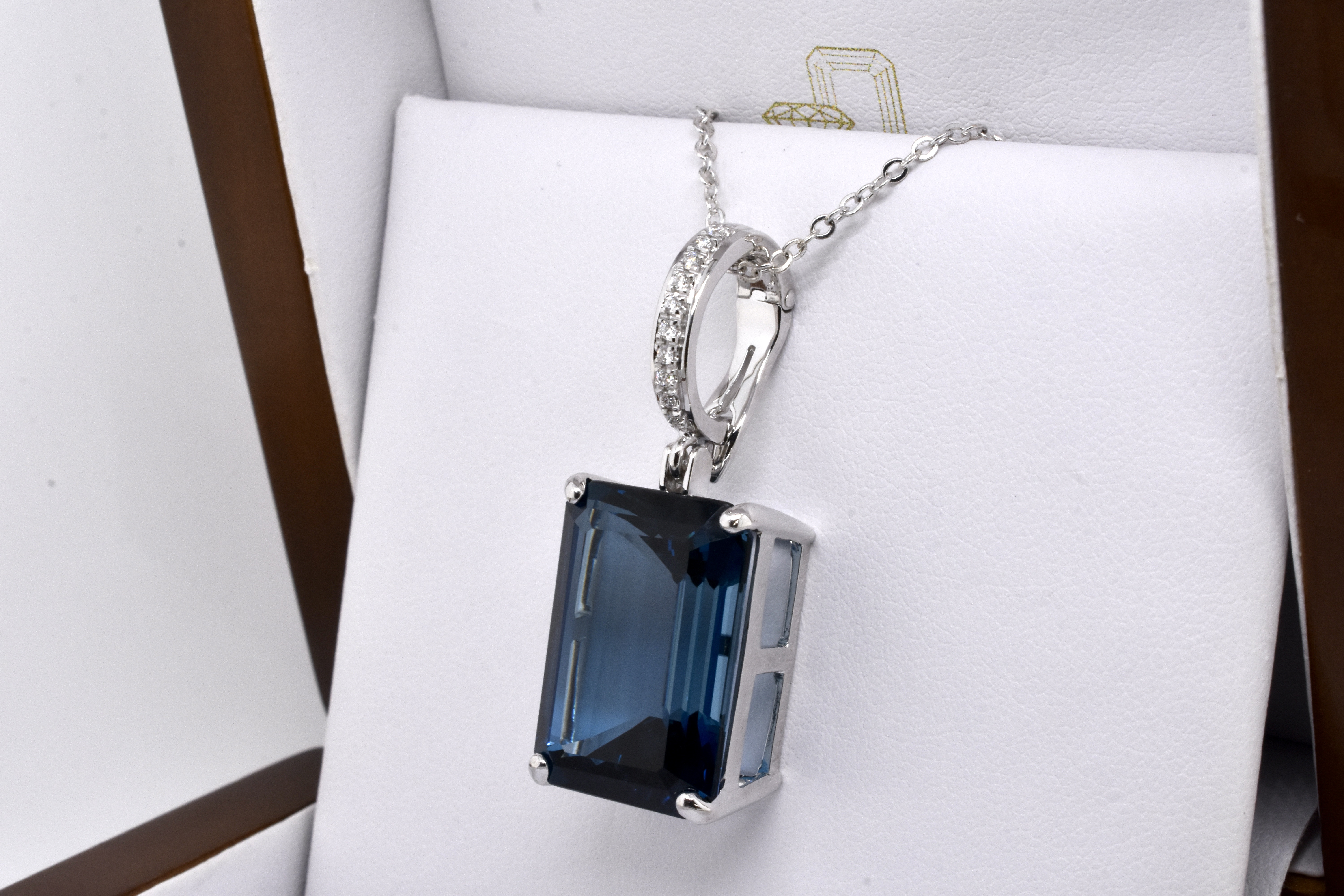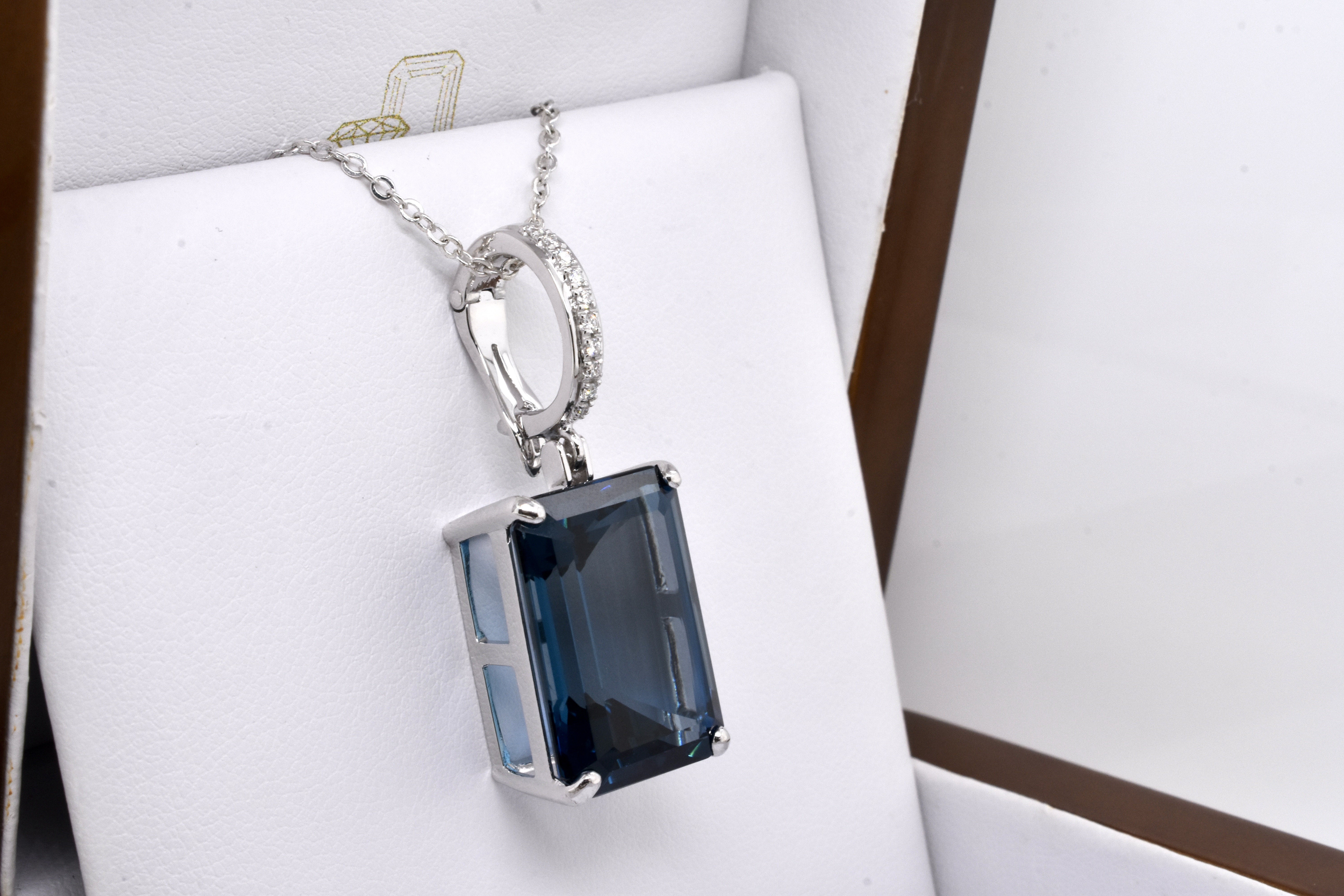 This 9ct white gold enhancer features a magnificent and sizeable London Blue topaz of 32.17ct, emerald cut in a 4 claw setting with a sparkling and elegant diamond bail accent for a total of ten equalling 0.09ct GH/VS. Chains available for separate purchase