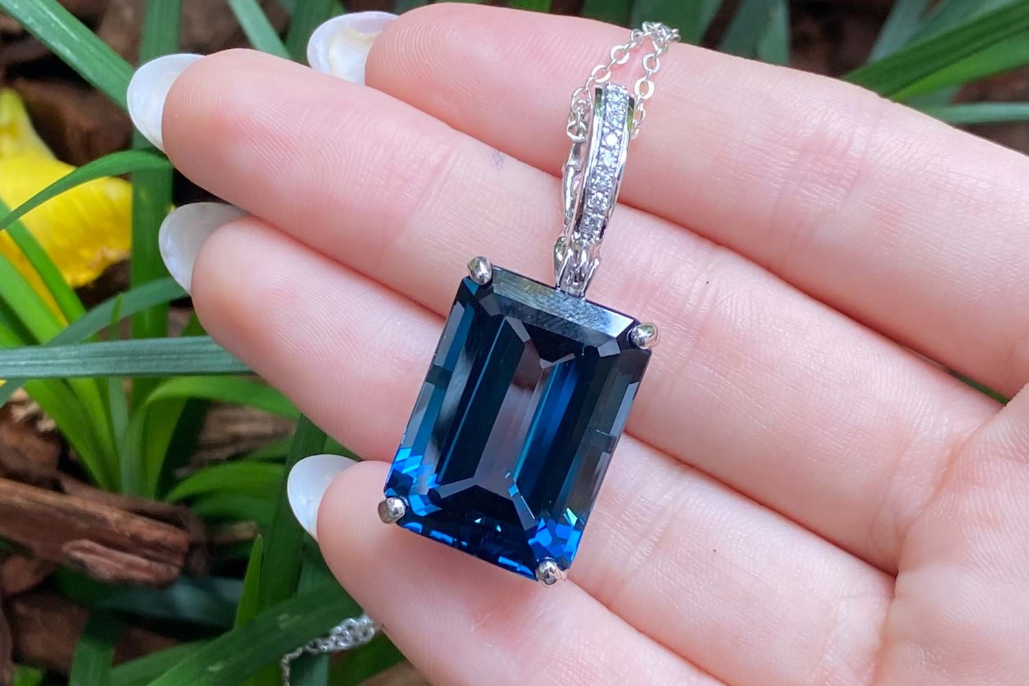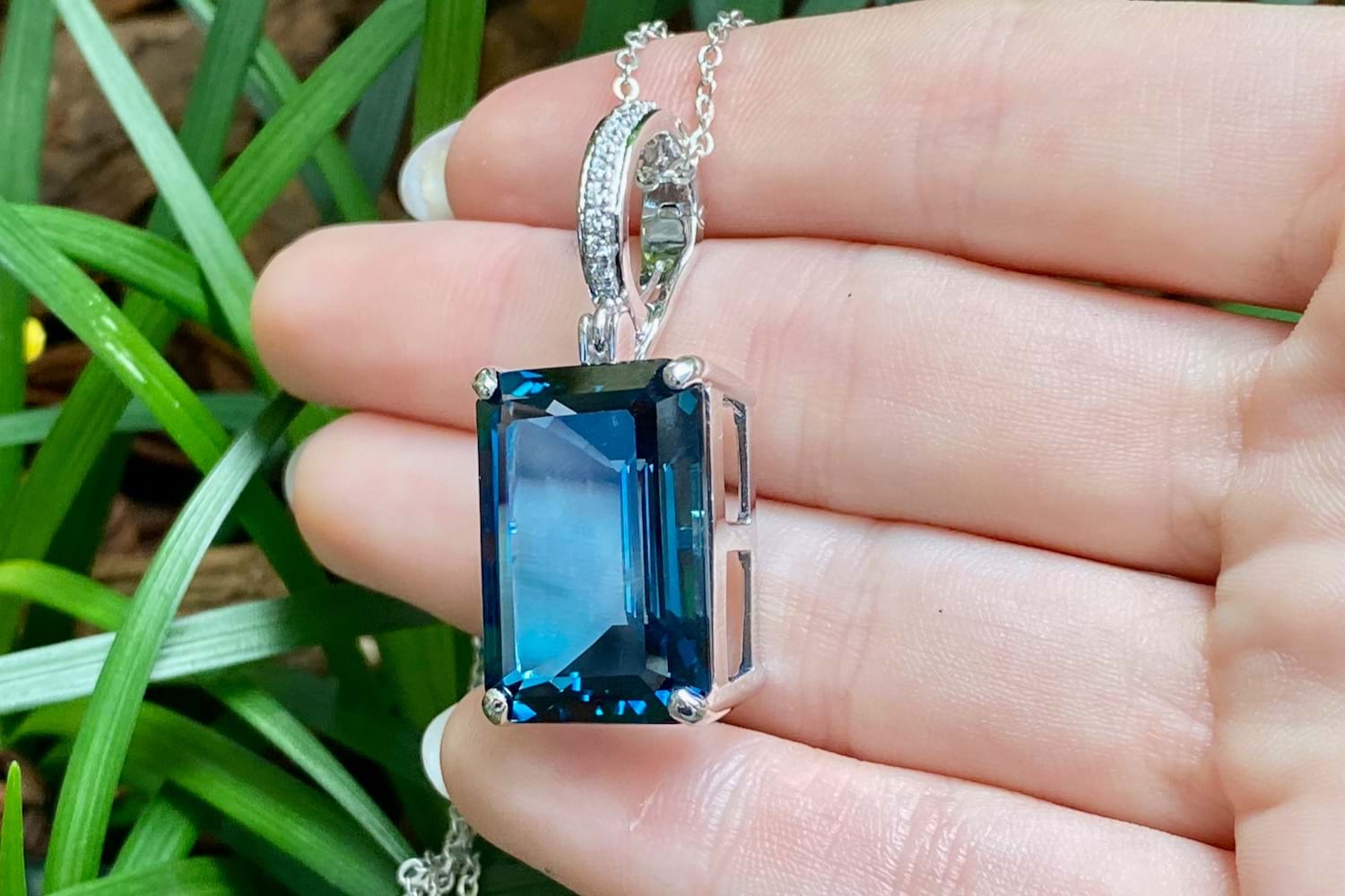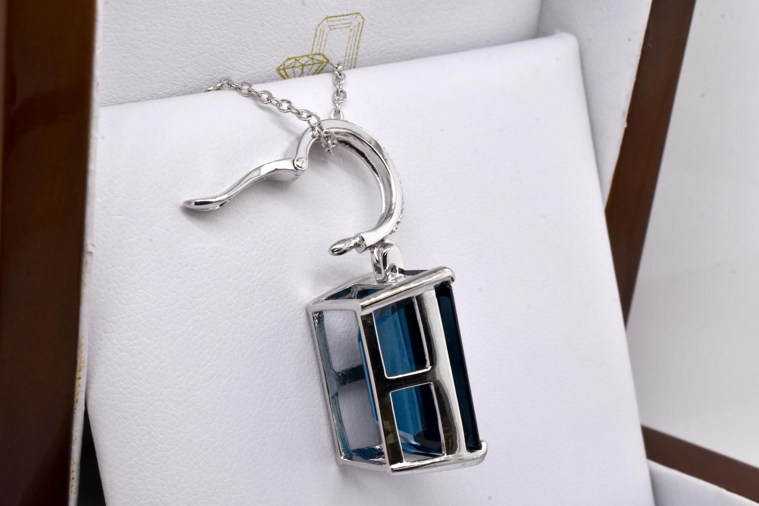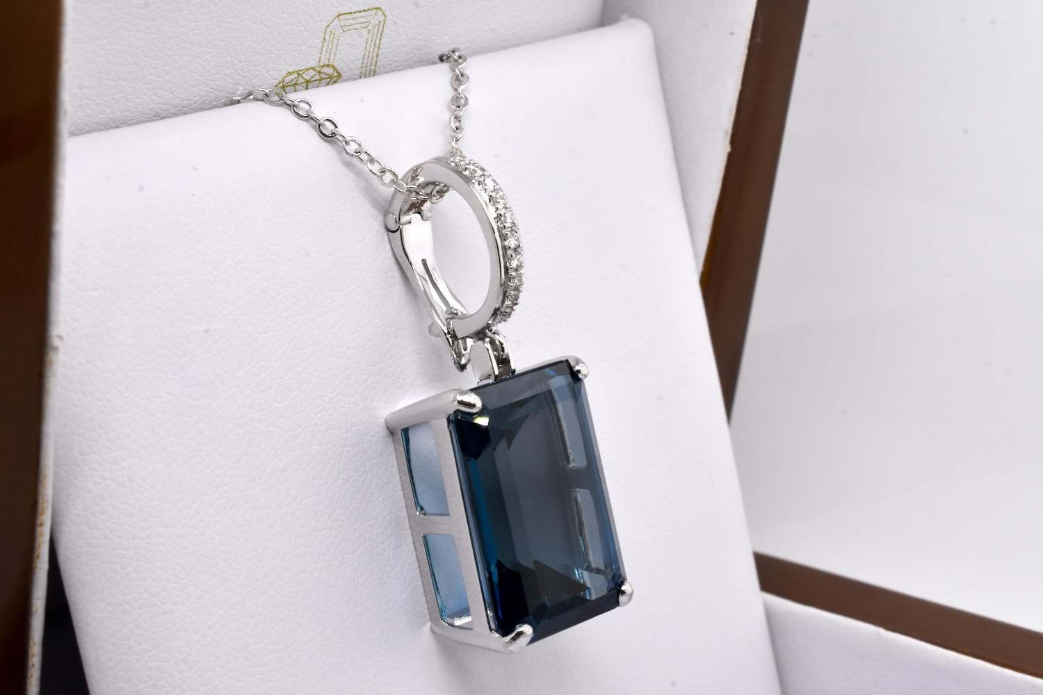 This 9ct white gold enhancer features a magnificent and sizeable London Blue topaz of 32.17ct, emerald cut in a 4 claw setting with a sparkling and elegant diamond bail accent for a total of ten equalling 0.09ct GH/VS. Chains available for separate purchase