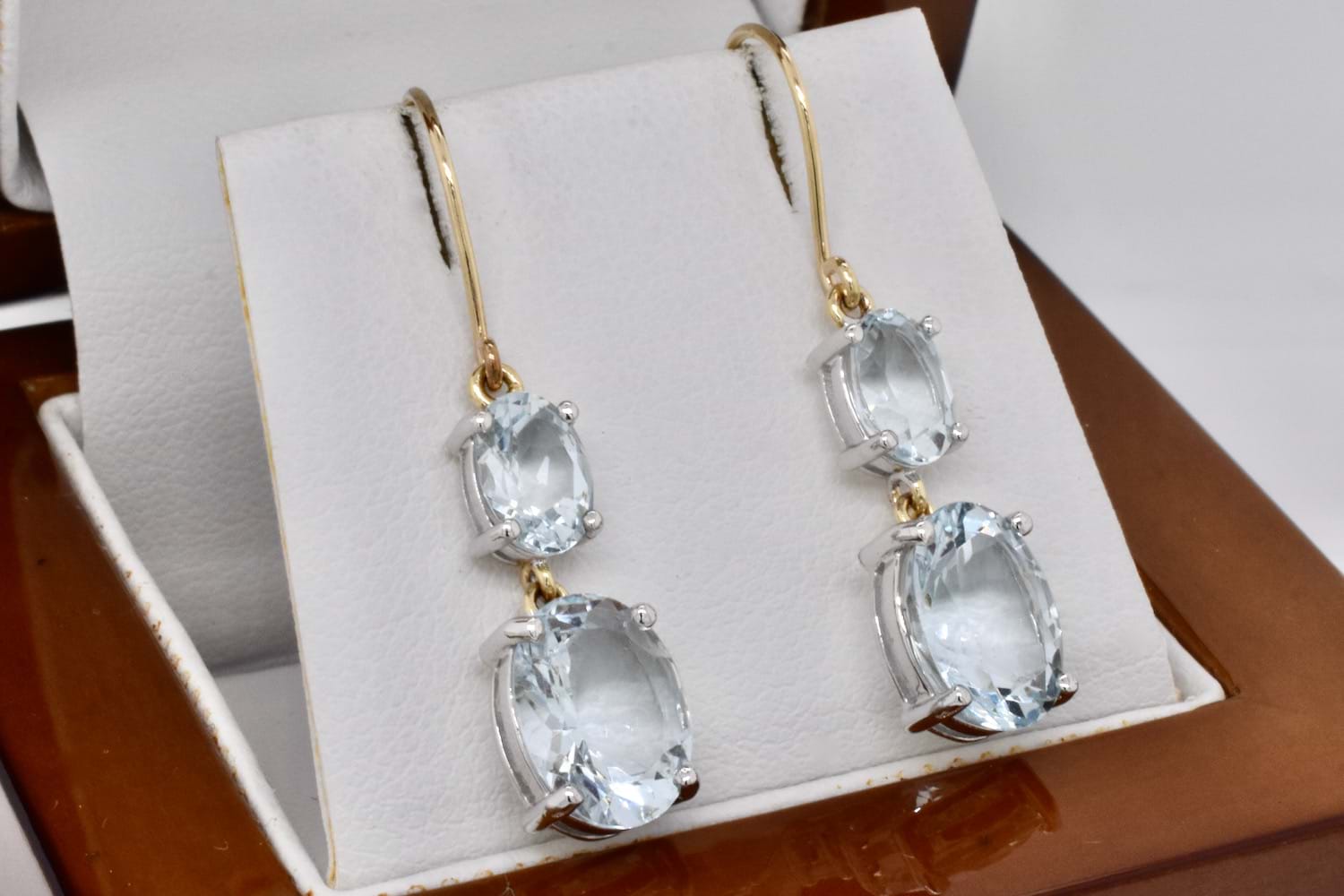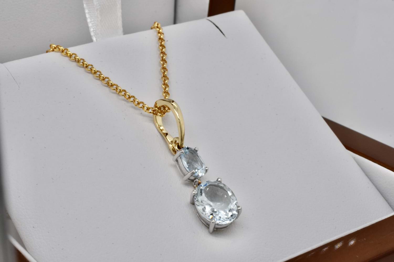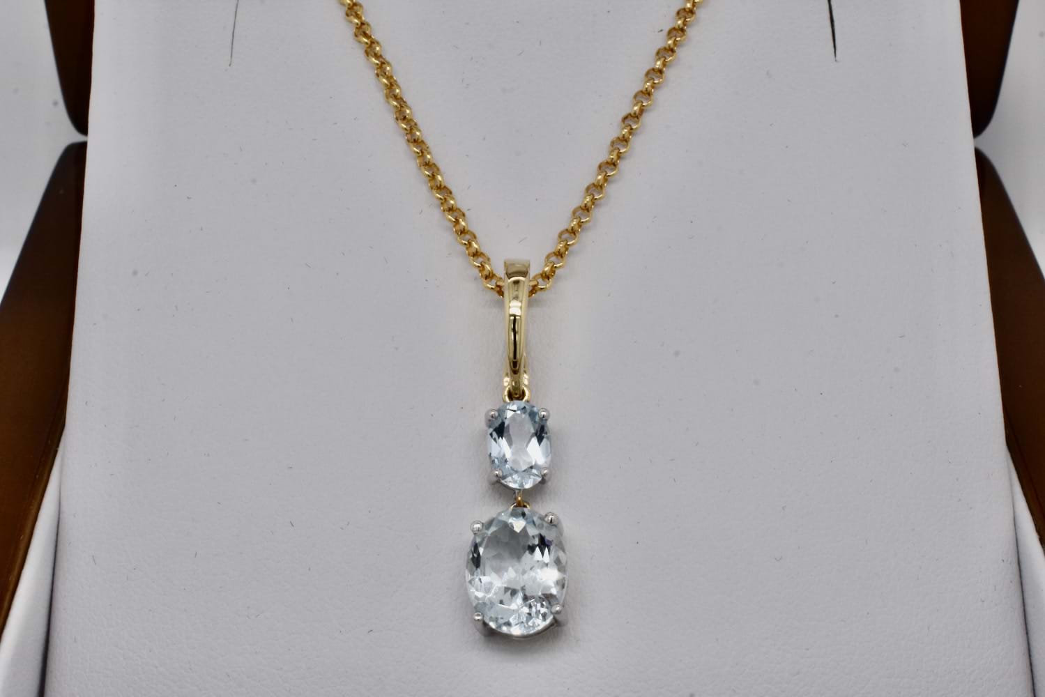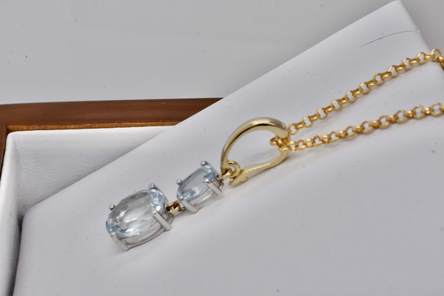 A beautiful 9ct yellow gold enhancer pendant featuring two oval faceted aquamarine four claw set in white gold and suspended one below the other. The two aquamarines total 2.75cts. Independent Valuation Supplied.