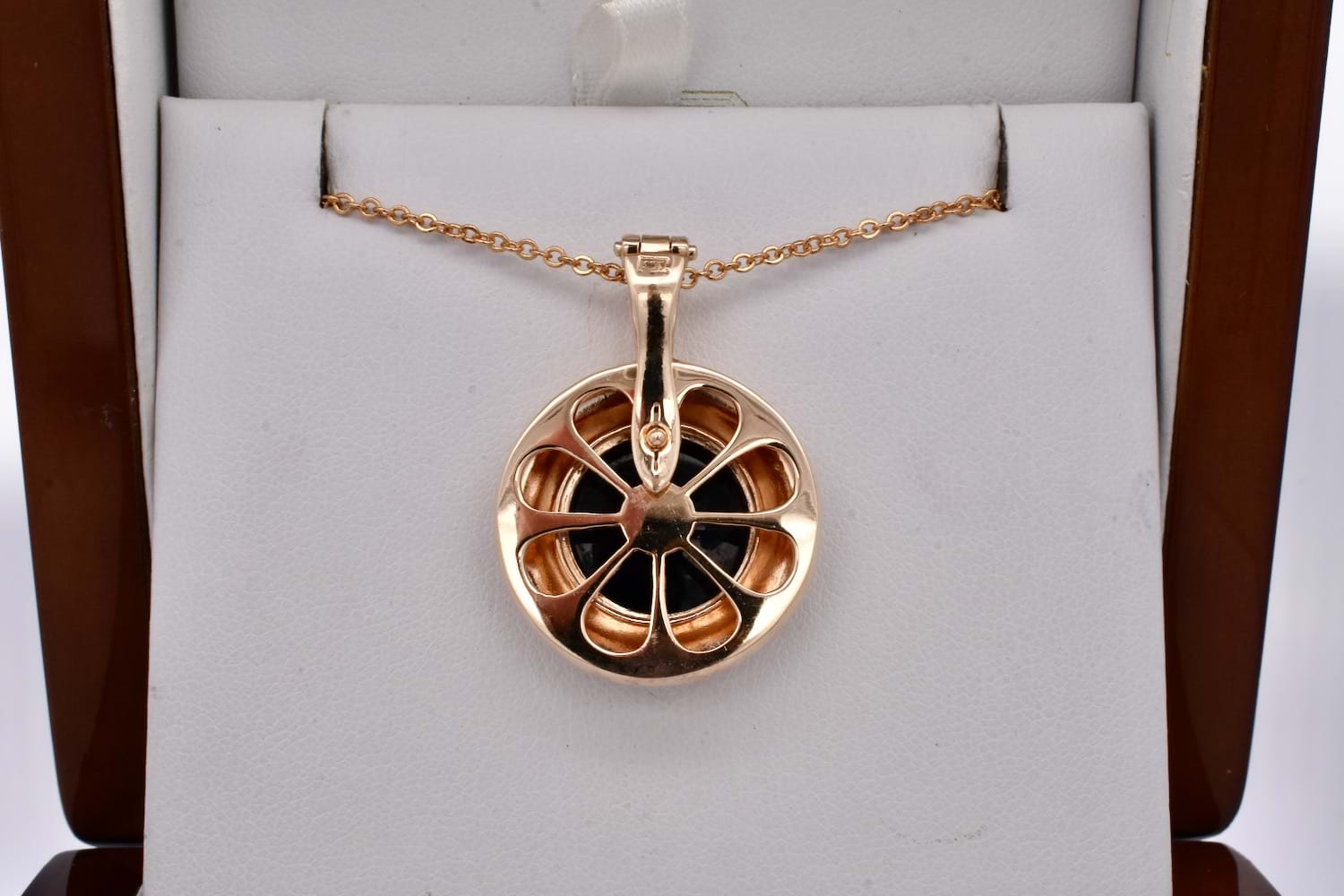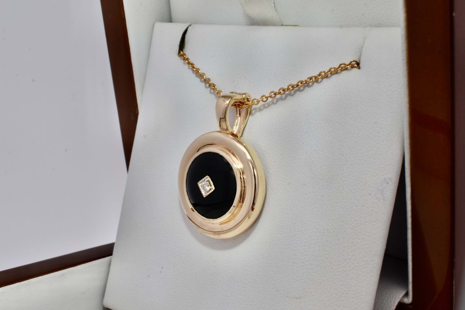 A striking 9ct yellow gold pendant with double grooved bezel detail, set with a piece of round shiny onyx with a centre shimmering RBC diamond of approx. 2.2mm in a millgrain detail diamond shaped setting, with plain bail enhancer clip. Chains available for separate purchase