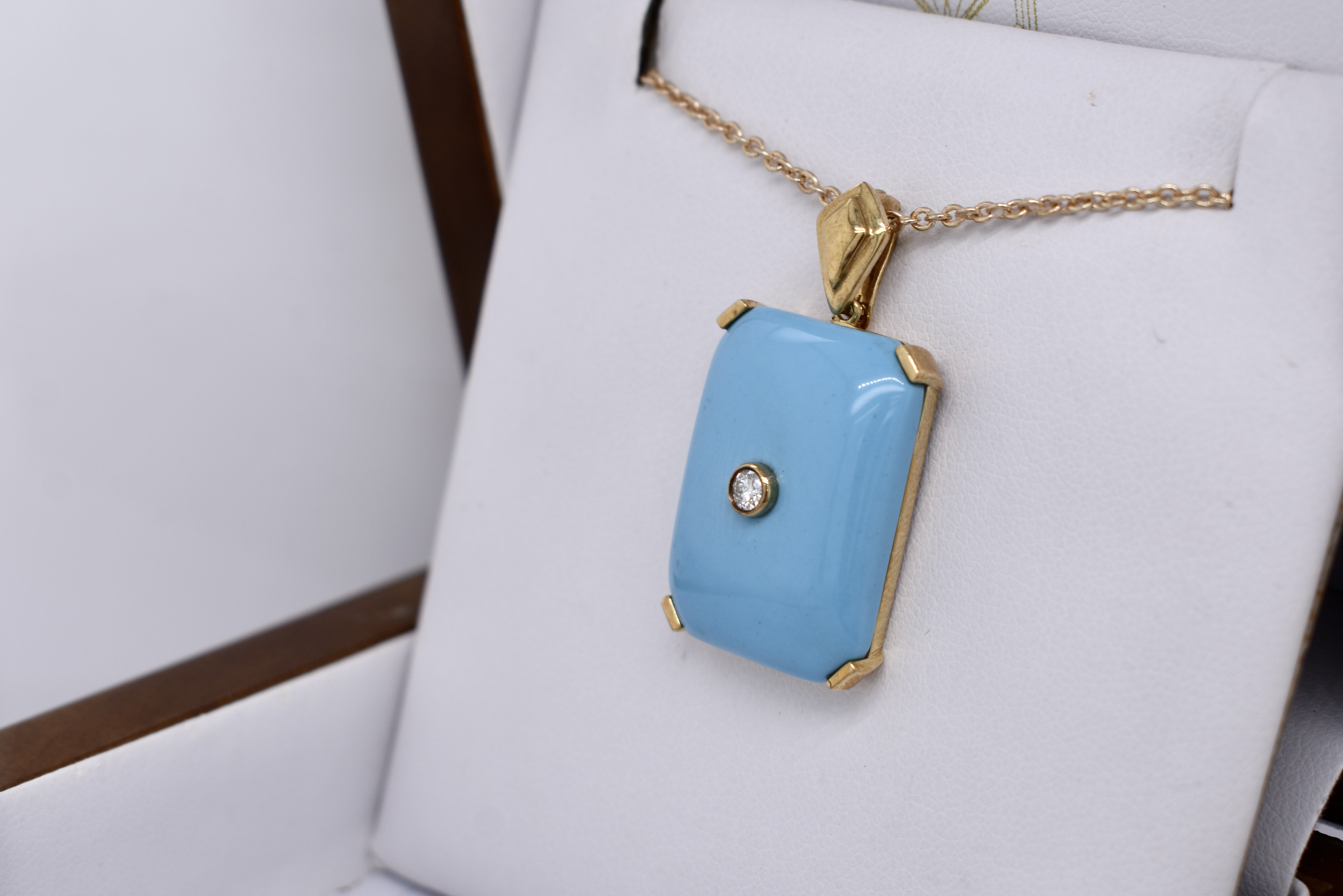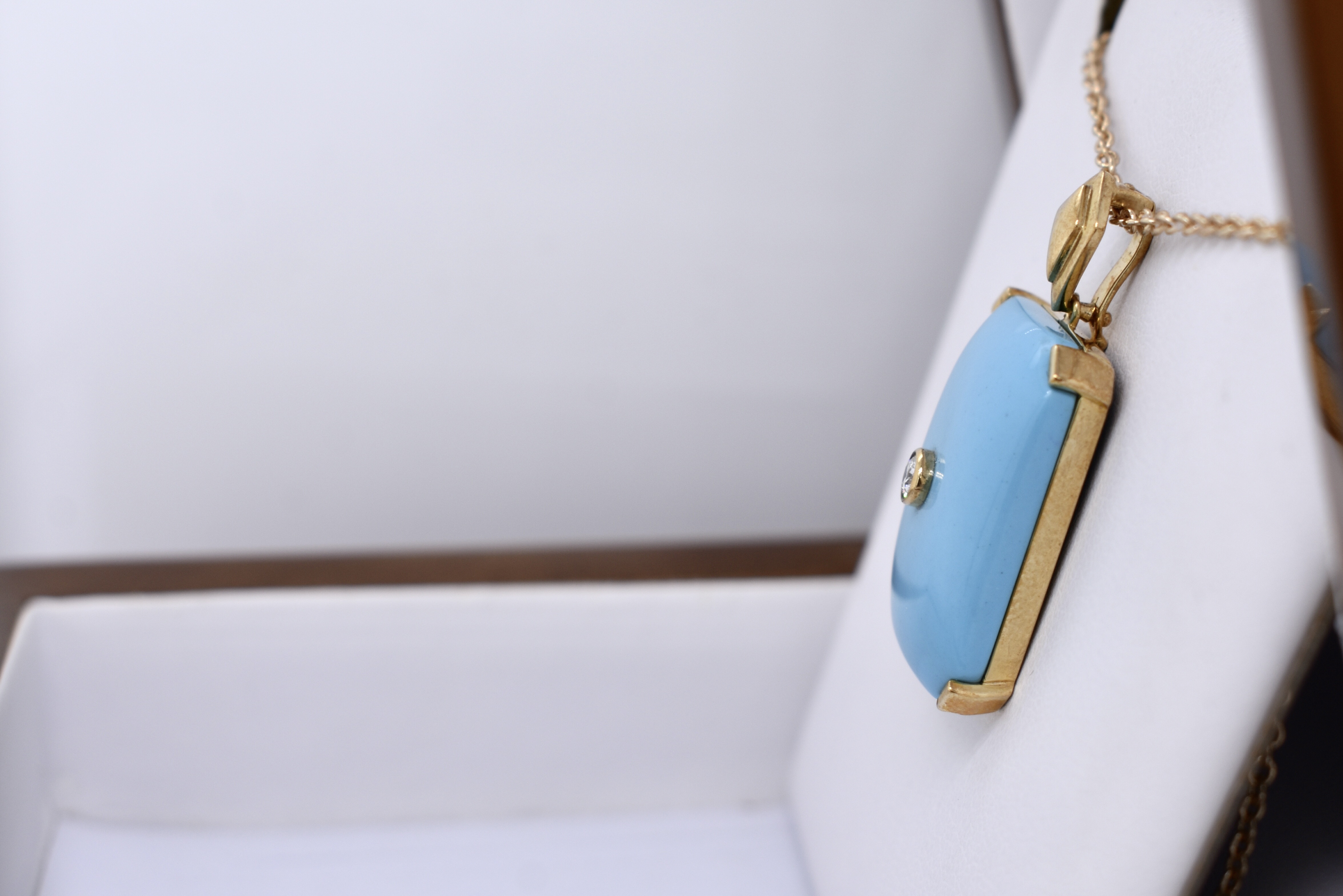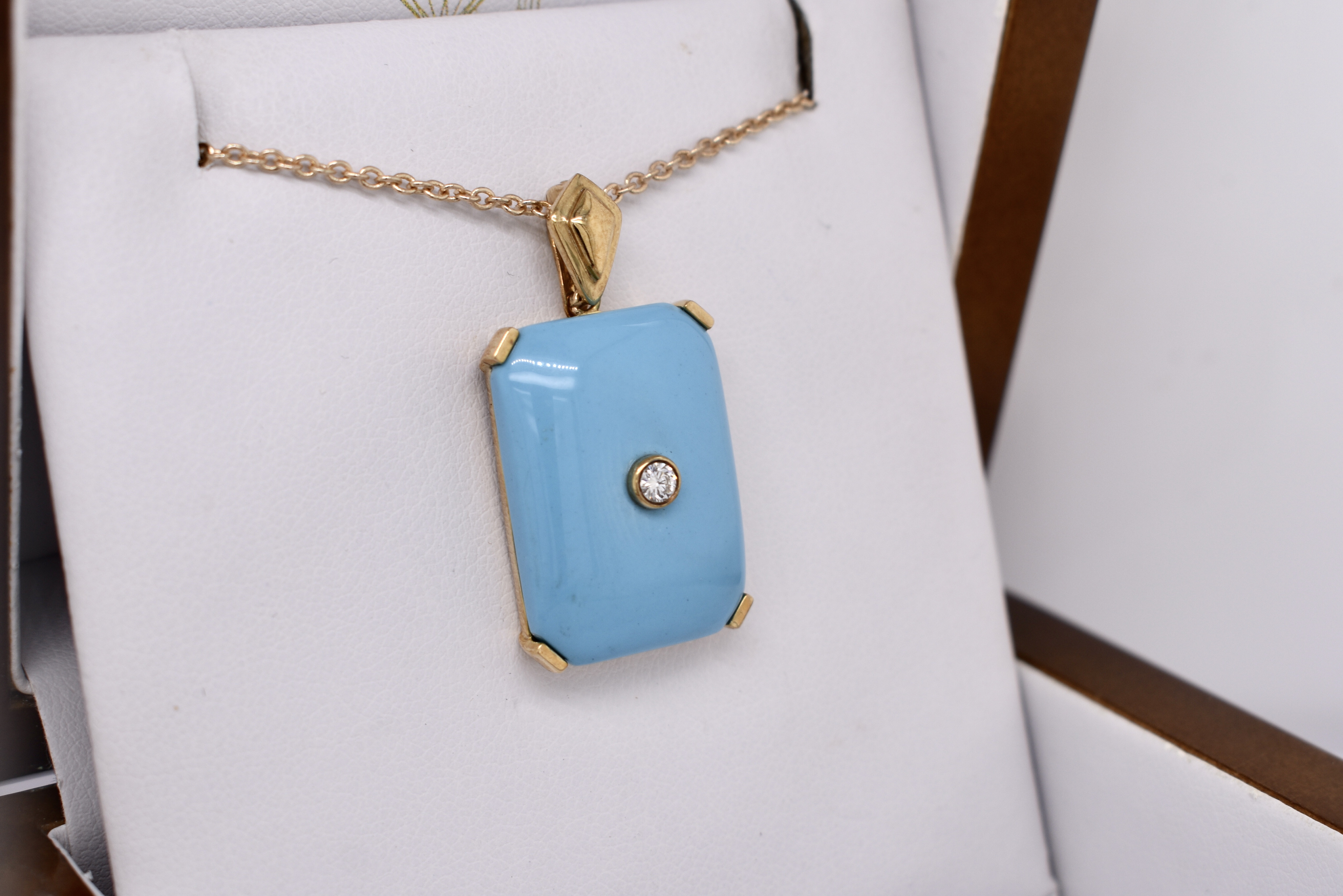 Unique and bright. 9ct yellow gold enhancer featuring an emerald cut panel of bright blue turquoise, four claw set with a sparkling round 0.10ct diamond, white gold bezel set, in the centre. Finished with a gold bale and enhancer clip. Complete the matching set with the ring: 20376581 and earrings: 20376536.