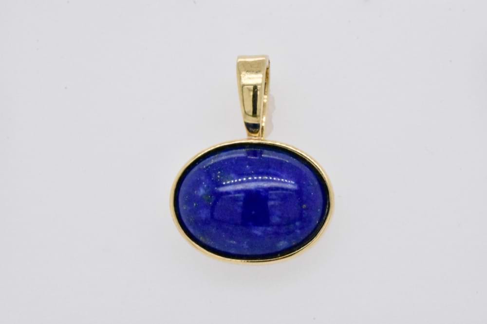 Set into a simple 9ct yellow gold bezel is an oval cabochon piece of lapis set horizontally with a plain enhancer bale. Lapis measure 19x14mm