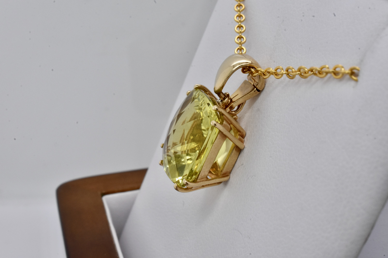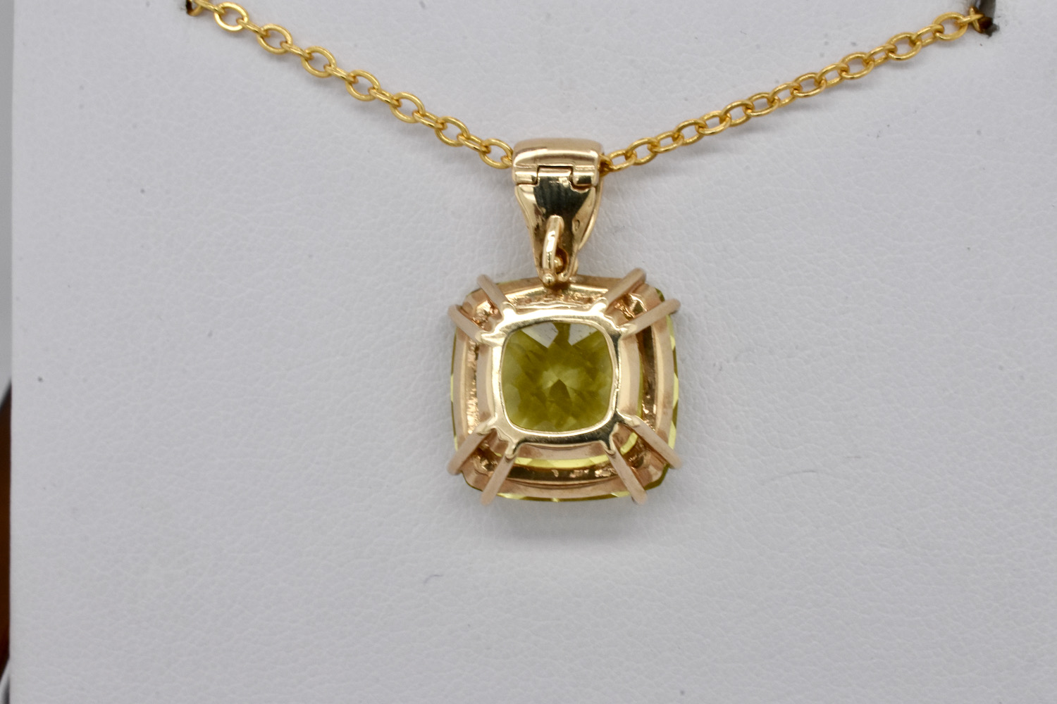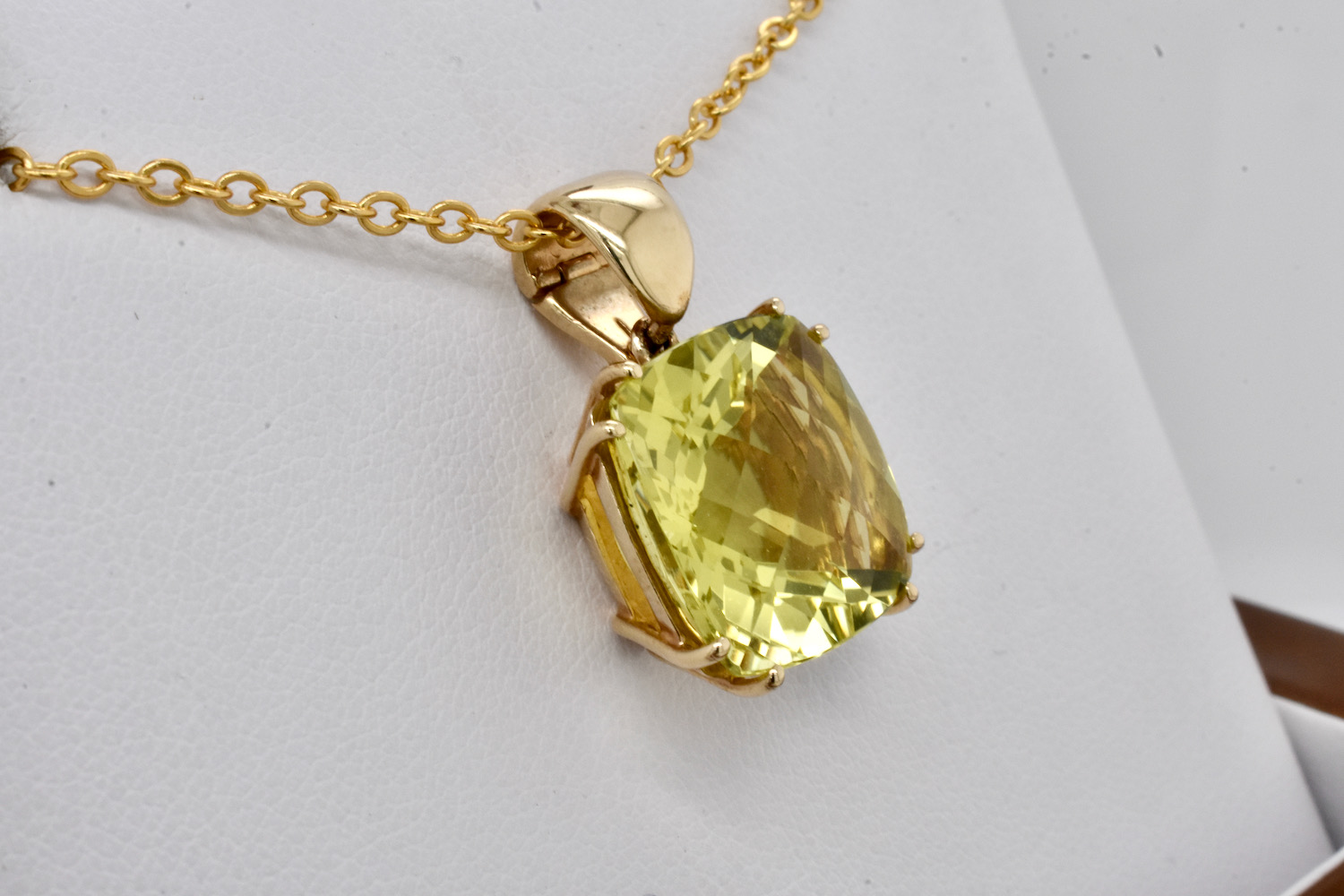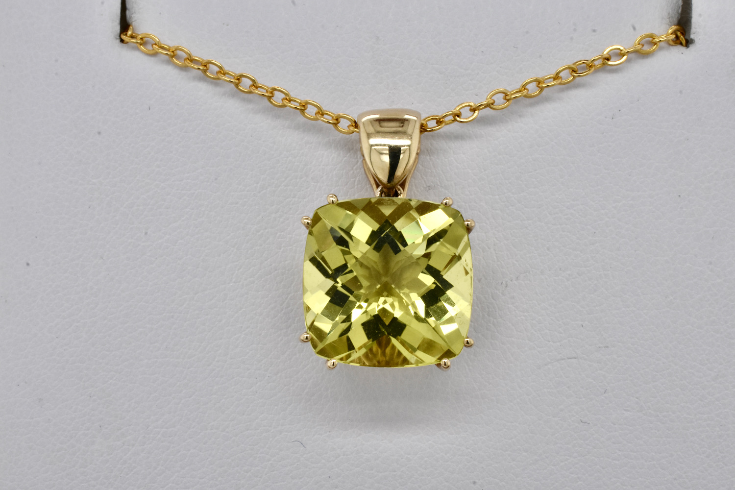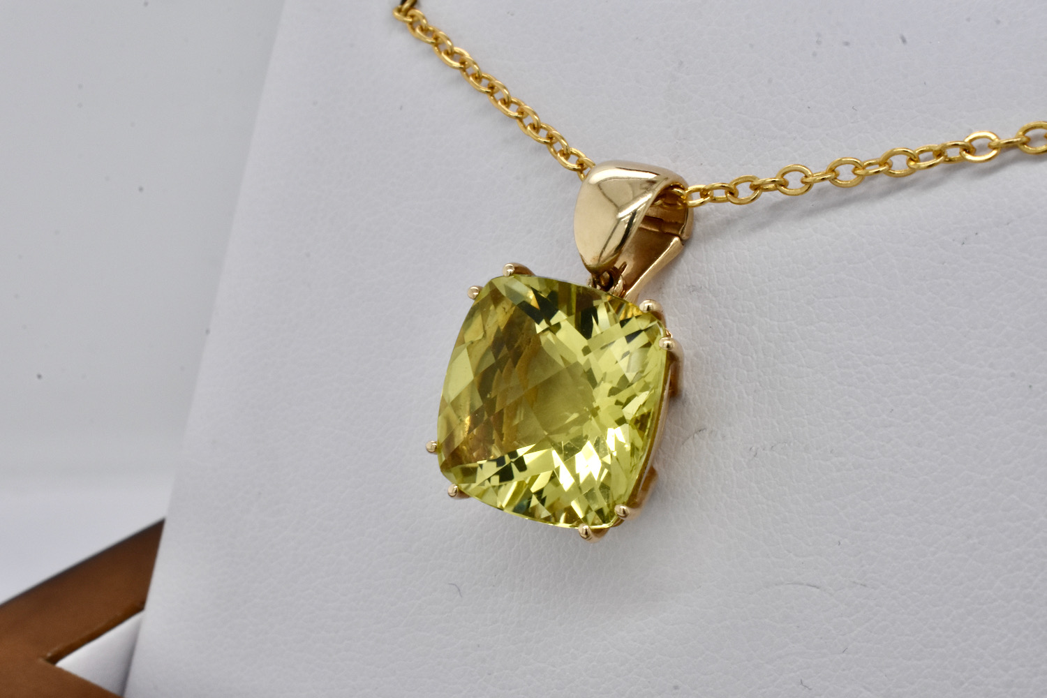 Stunning cushion cut lemon quartz with a checkerboard finish measuring 15.5mm set into a 9ct yellow gold four double talon setting with an enhancer bale. Chains are available for separate purchase