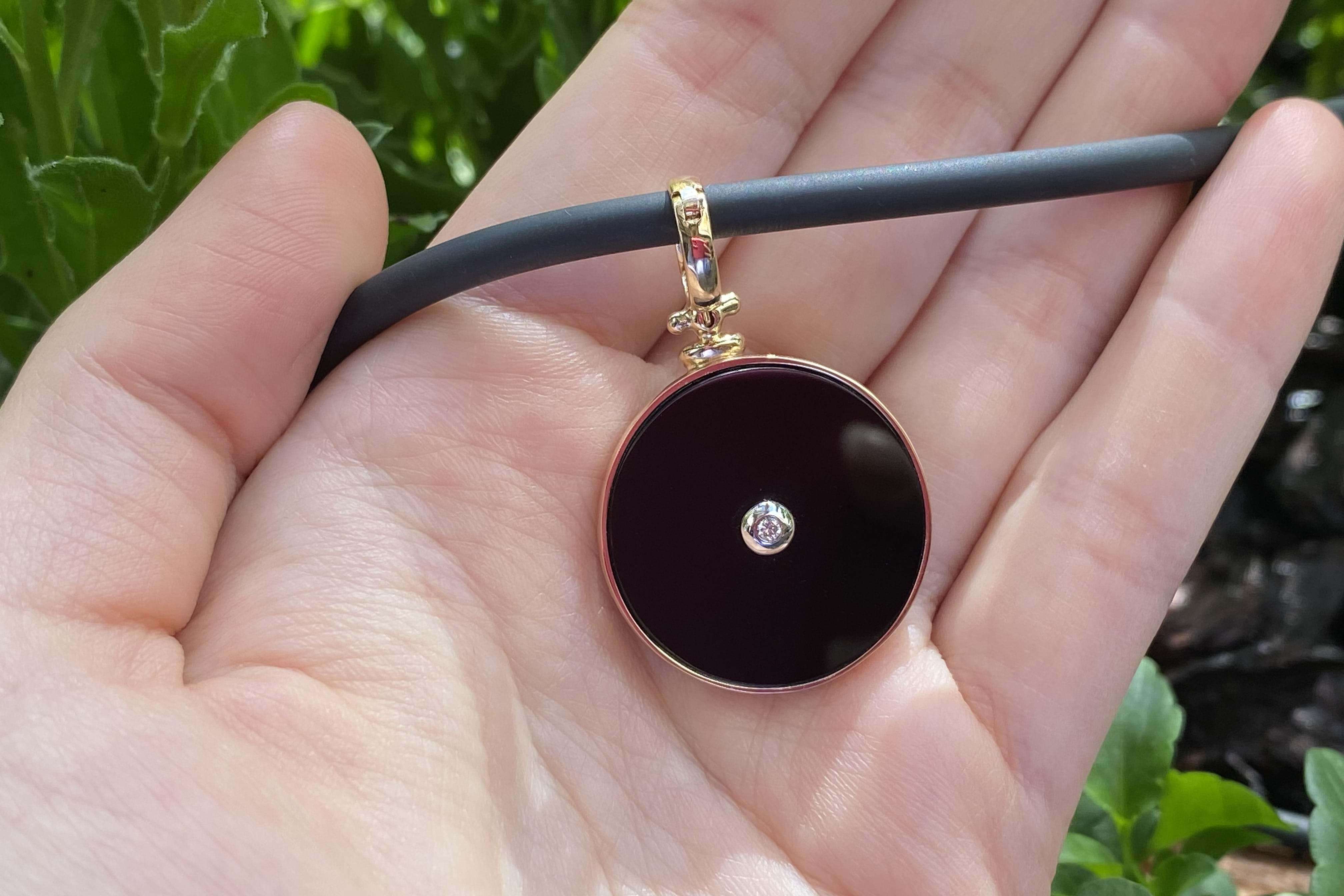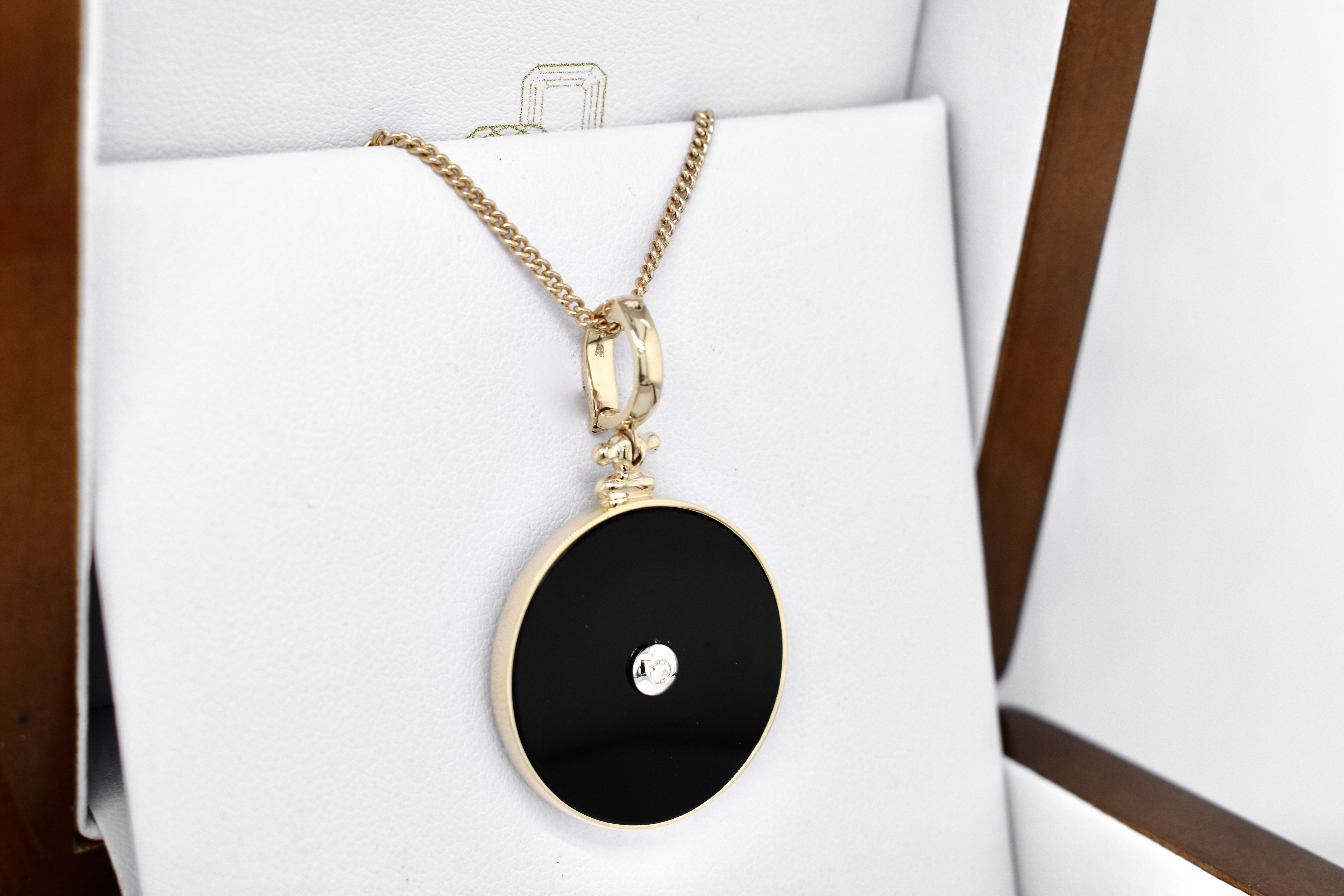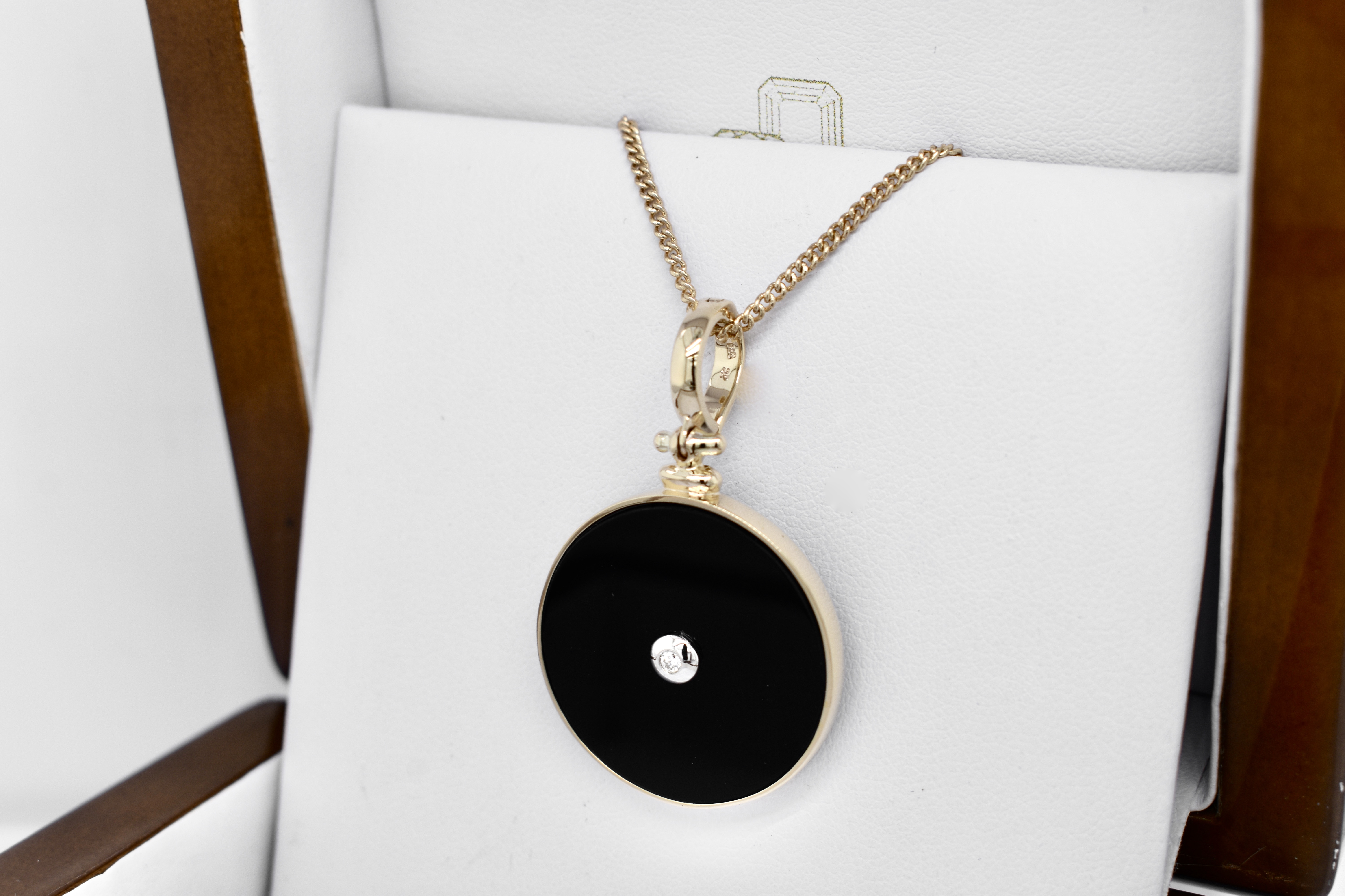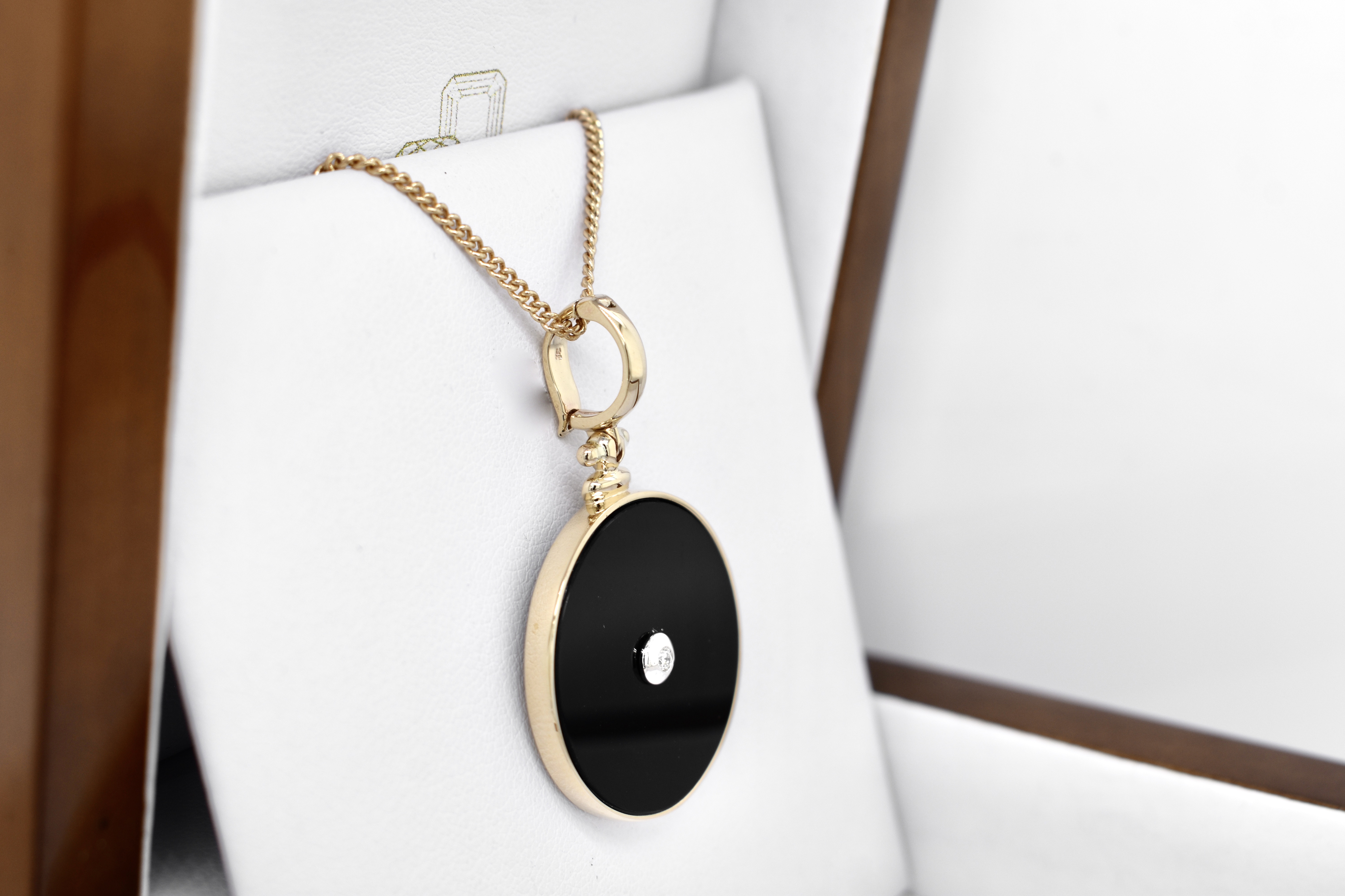 This striking enhancer is crafted in 9ct yellow gold with a generous, shiny piece of round onyx measuring approximately 25mm and is set with a sparkling white diamond bezel set in white gold at the centre. Finished with an enhancer clip and safety clasp for added security. Chains available for separate purchase.