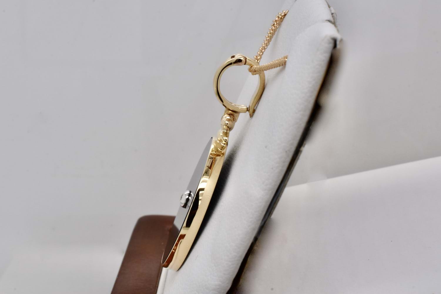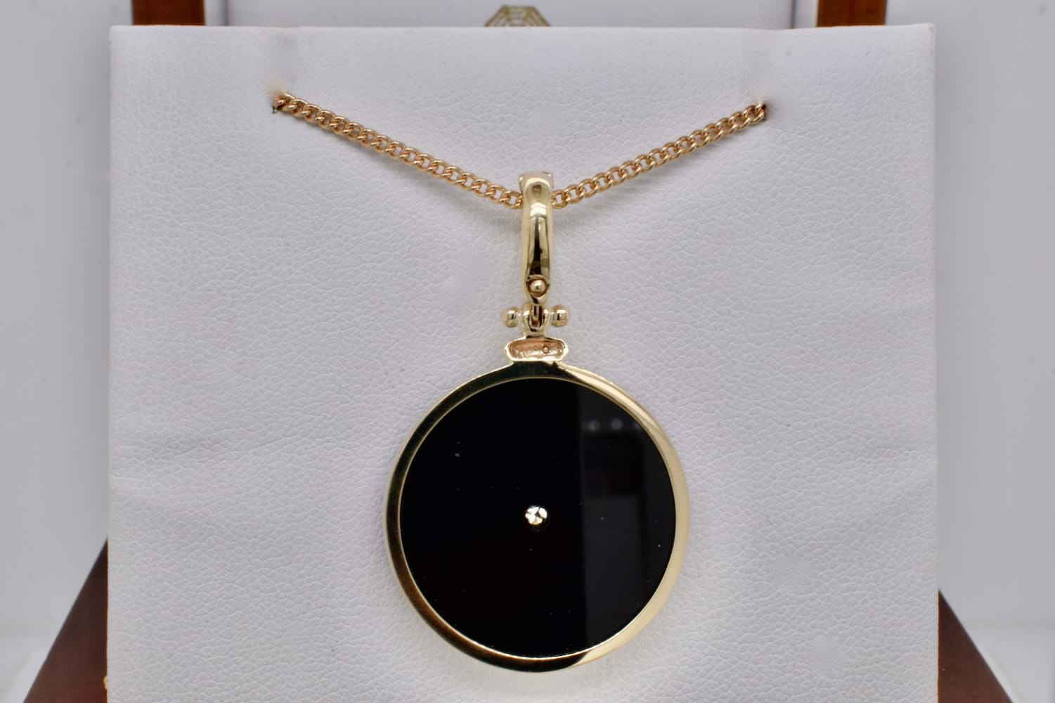 This striking enhancer is crafted in 9ct yellow gold with a generous, shiny piece of round onyx measuring approximately 26mm and set with a sparkling white diamond bezel set in white gold at the centre, with enhancer clip and safety clasp for added security. Chains available for separate purchase