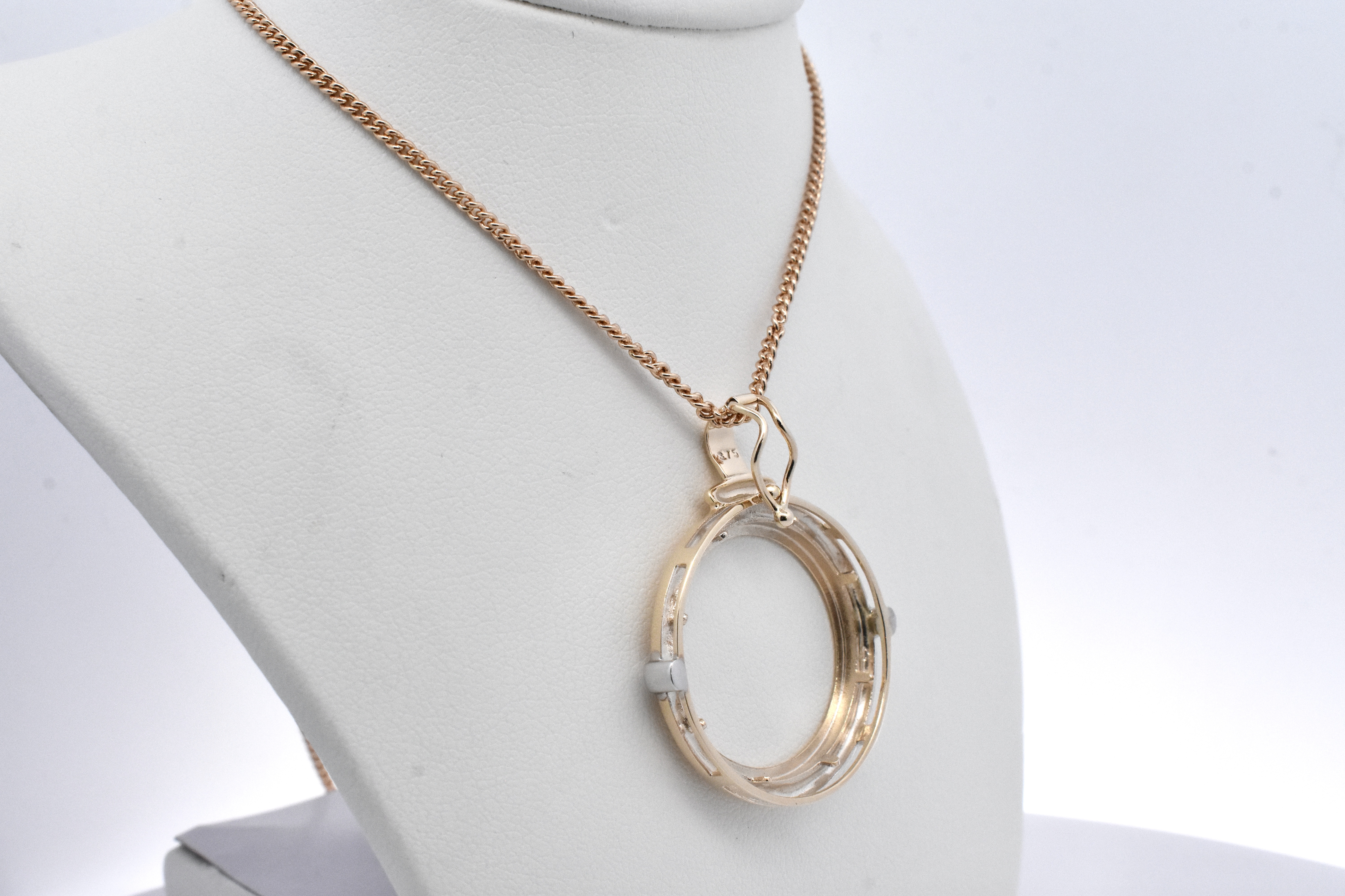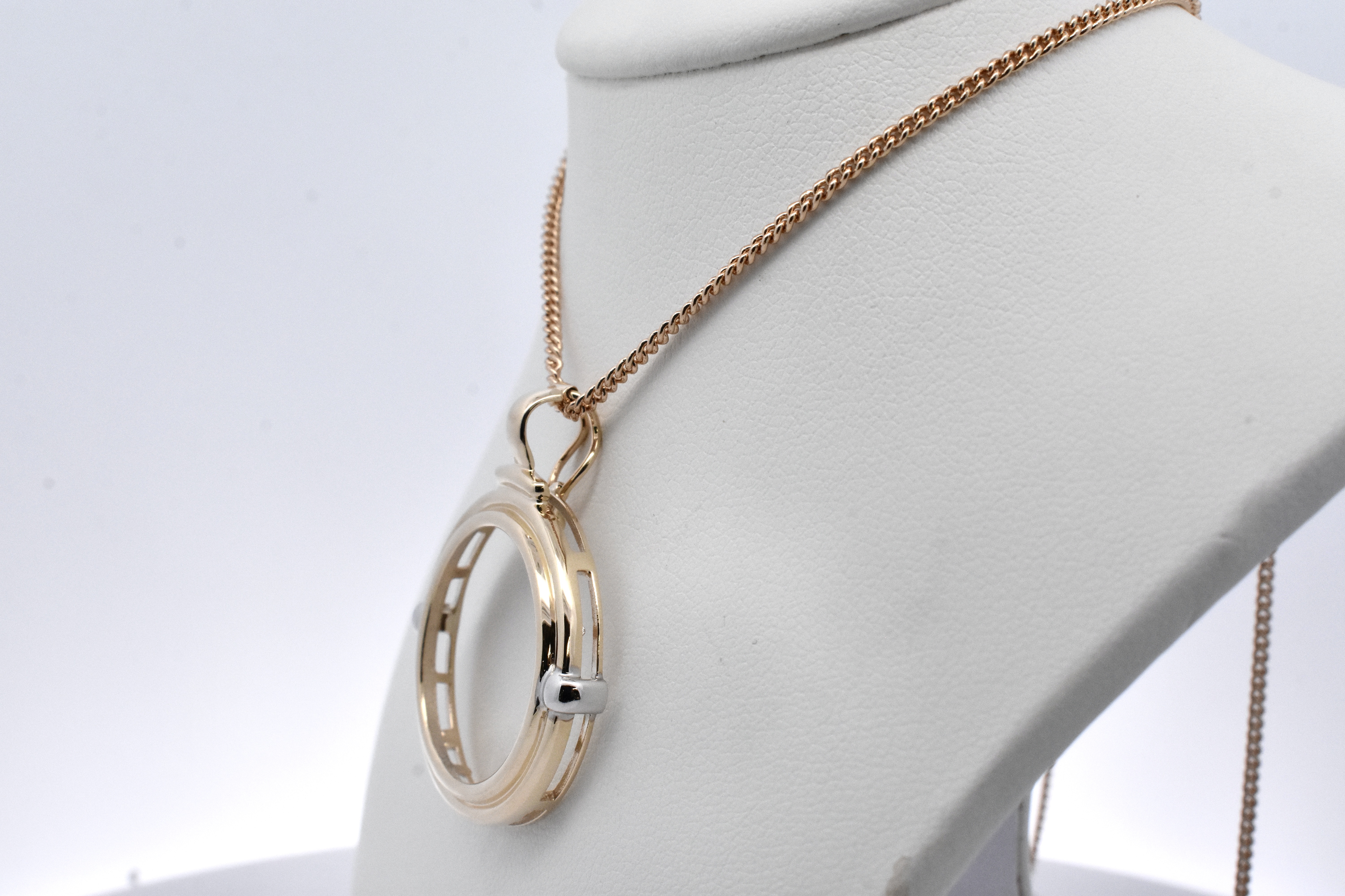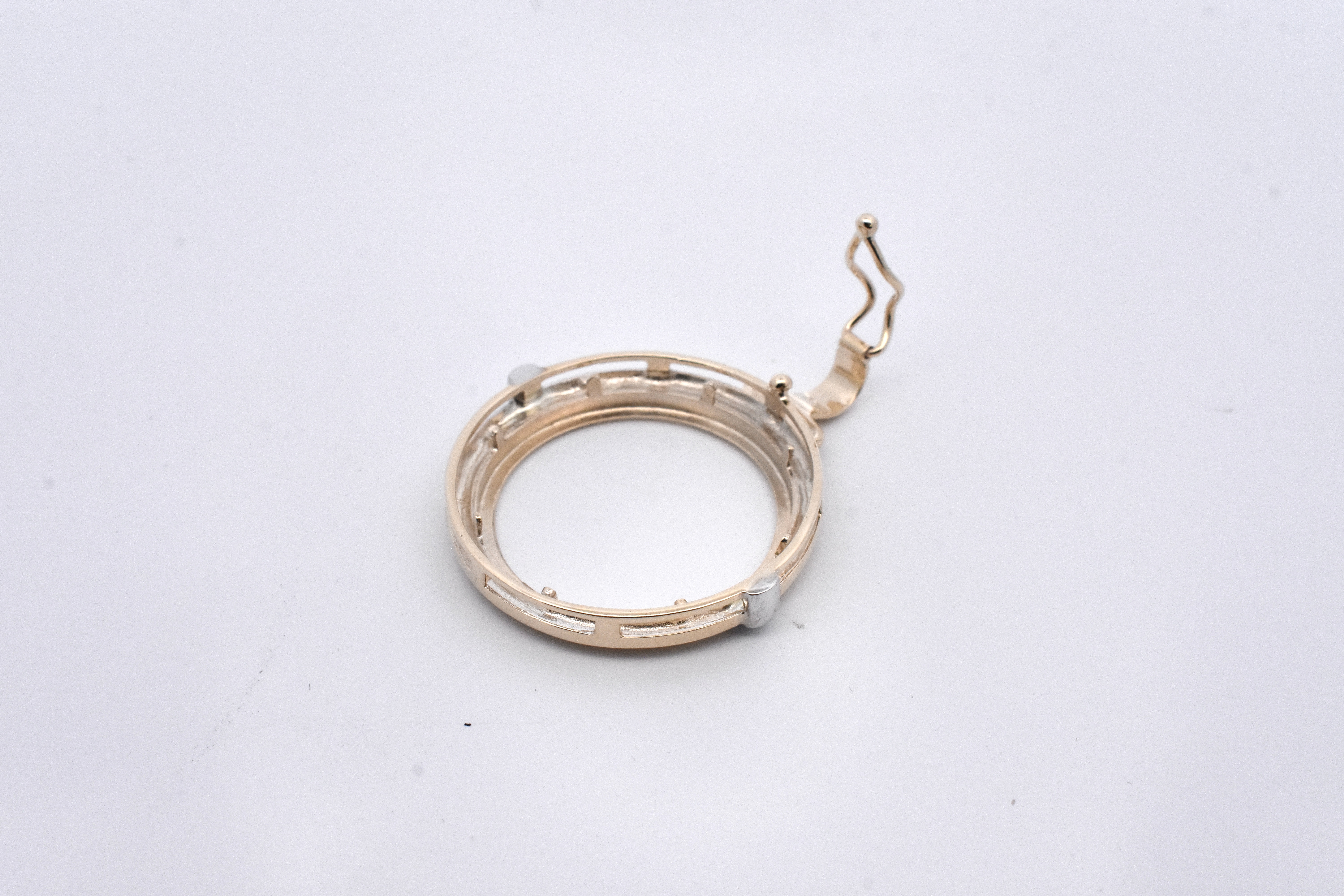 A contemporary coin mount made to fit a full sovereign coin, crafted in two tone 9ct yellow gold with white gold accents and double bezel detail, with an enhancer clip for added versatility to clip over thick chains or pearls, plus figure 8 catch for additional security
