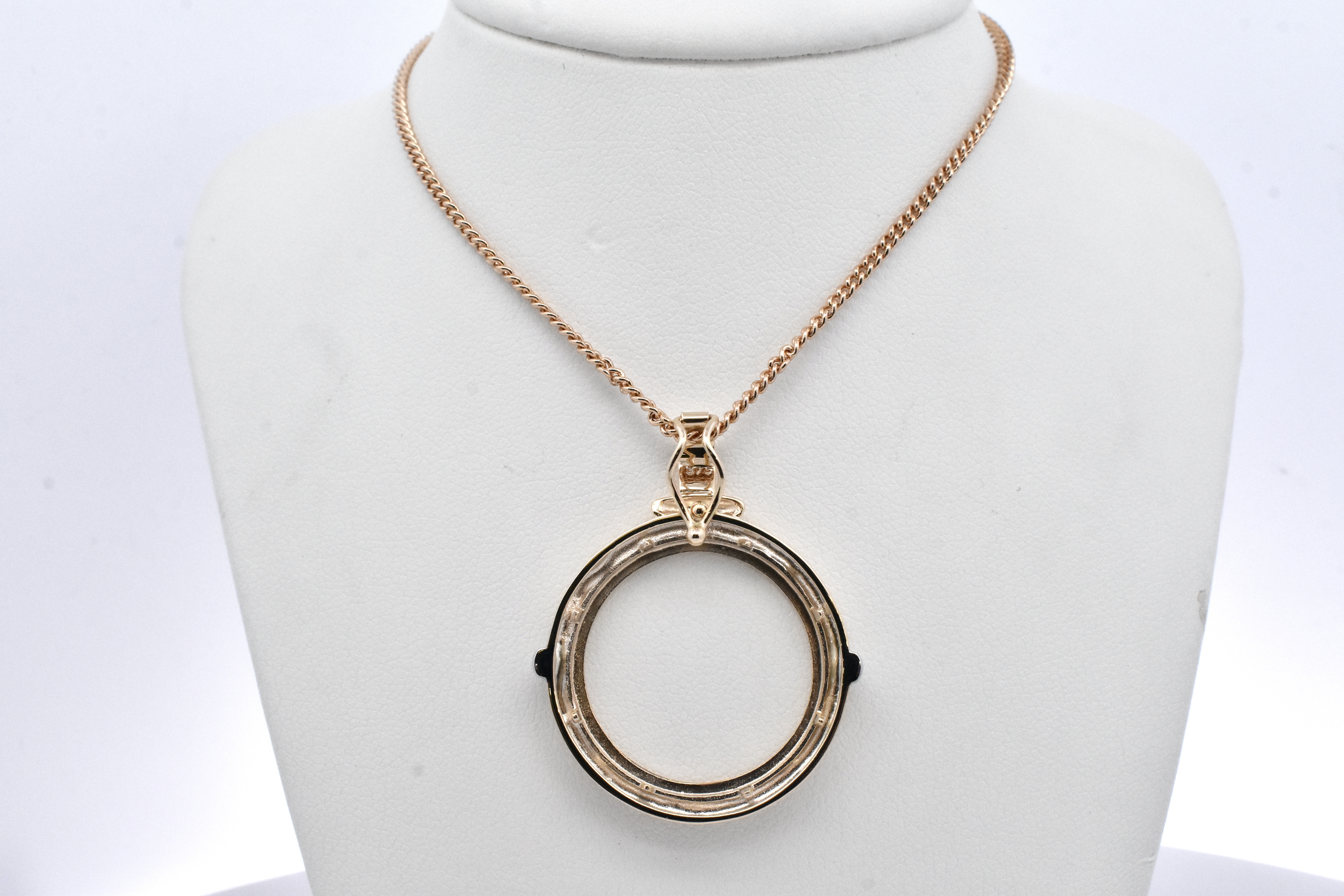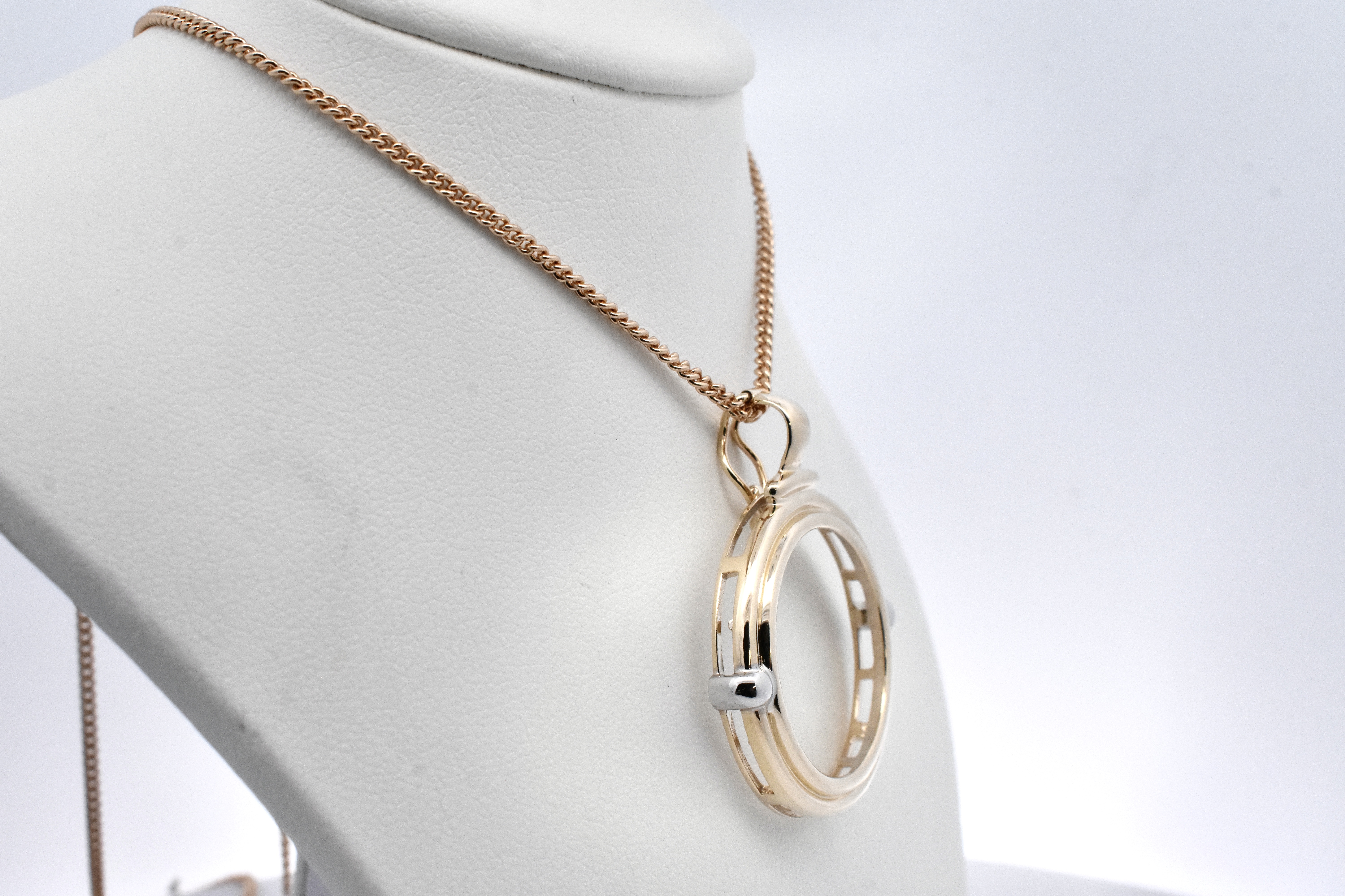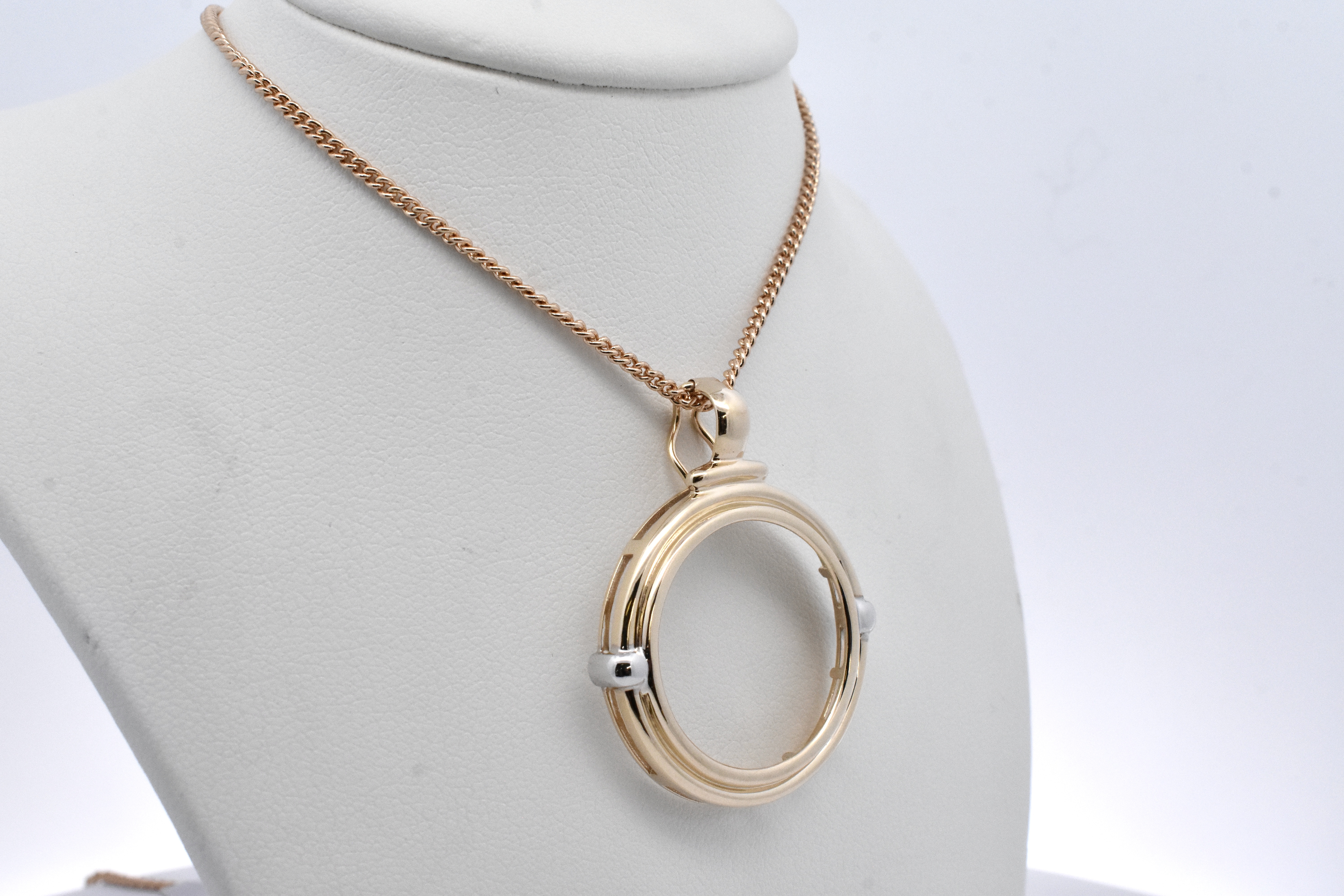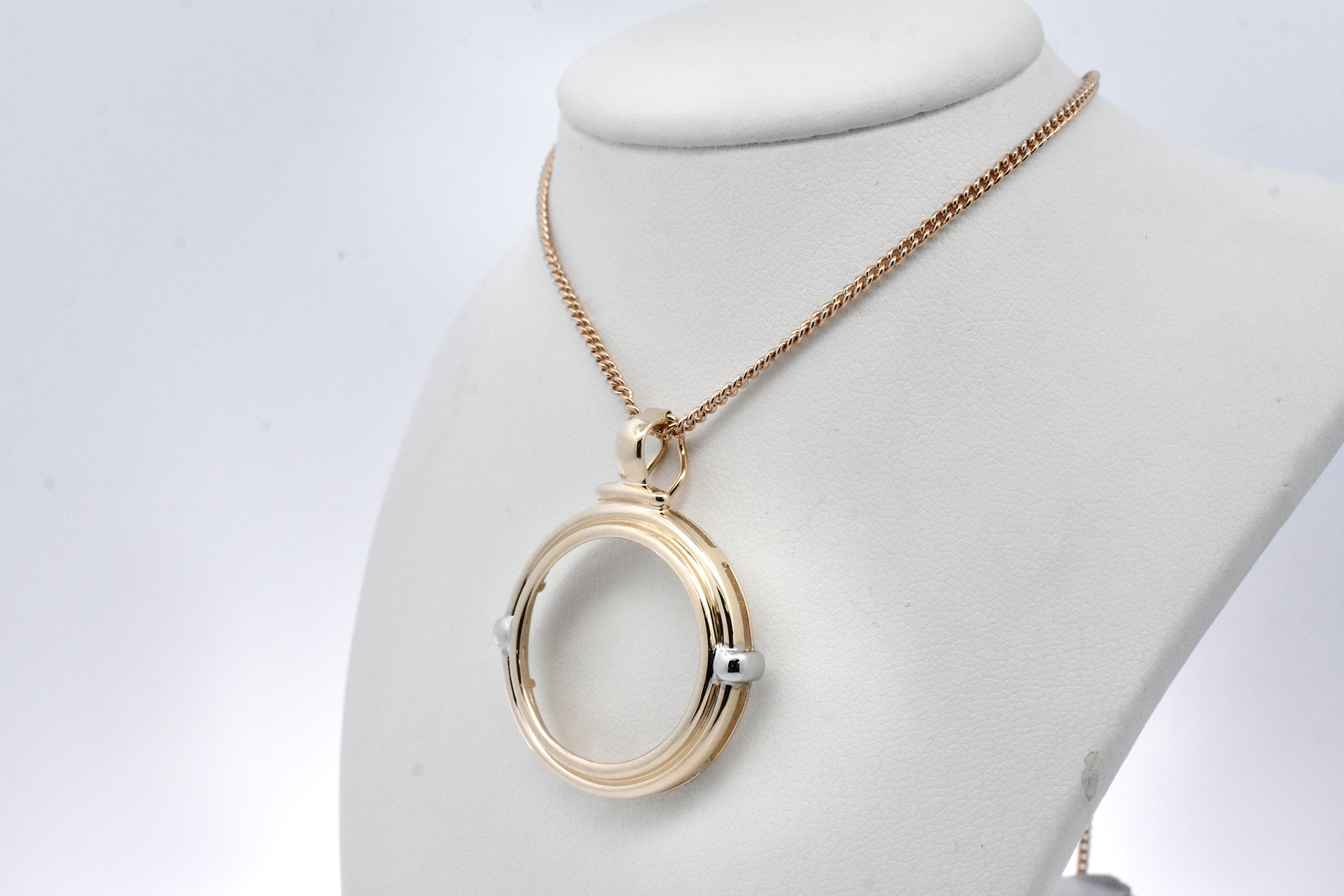A contemporary coin mount made to fit a full sovereign coin, crafted in two tone 9ct yellow gold with white gold accents and double bezel detail, with an enhancer clip for added versatility to clip over thick chains or pearls, plus figure 8 catch for additional security