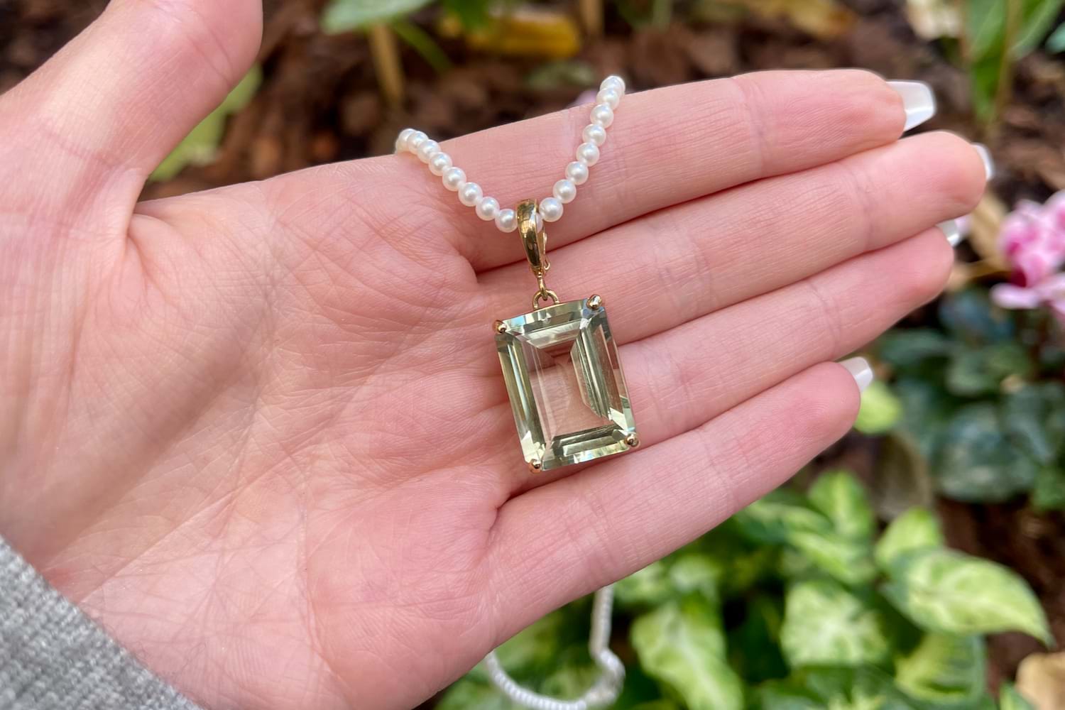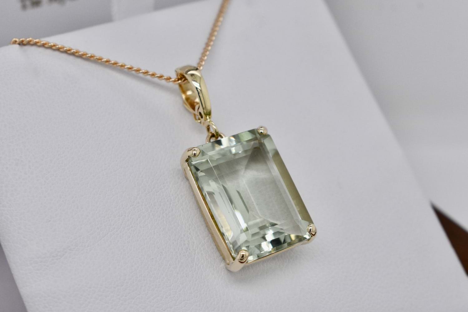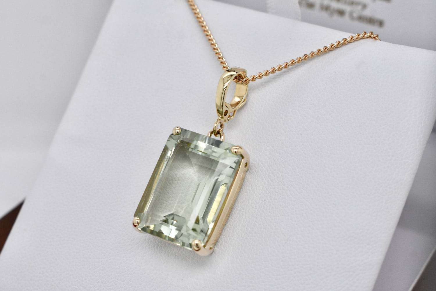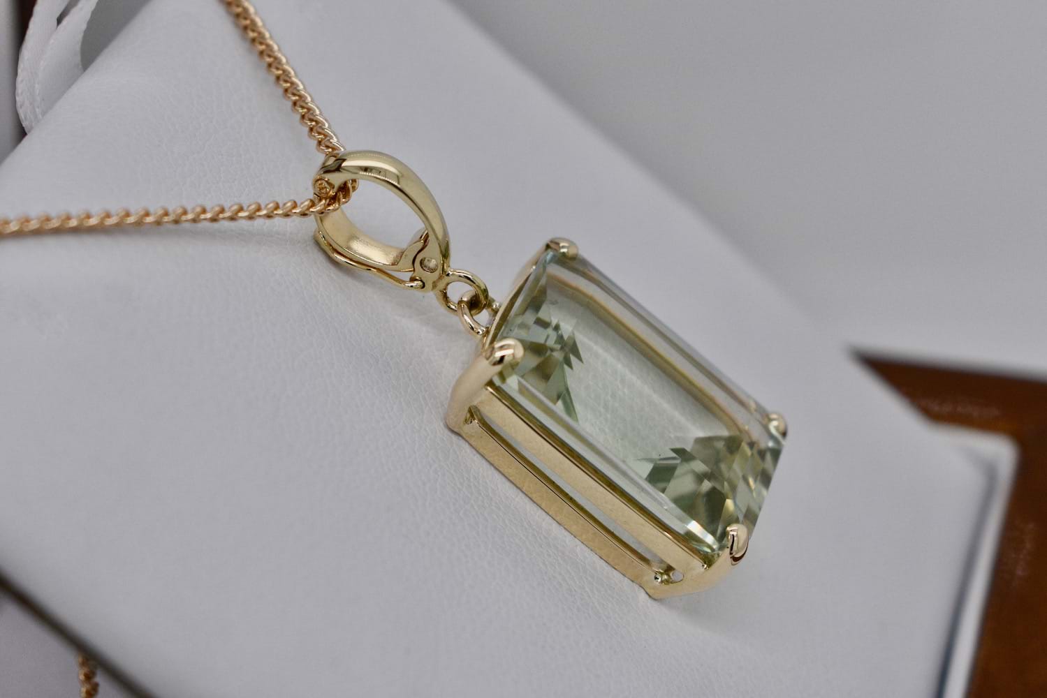 An impressive and striking 18ct emerald cut prasiolite measuring approximately 20 x 15mm, in a handmade 9ct yellow gold setting with 4 claws and a plain enhancer clasp. The enhancer bale includes a figure 8 safety catch. Chains are available for separate purchase