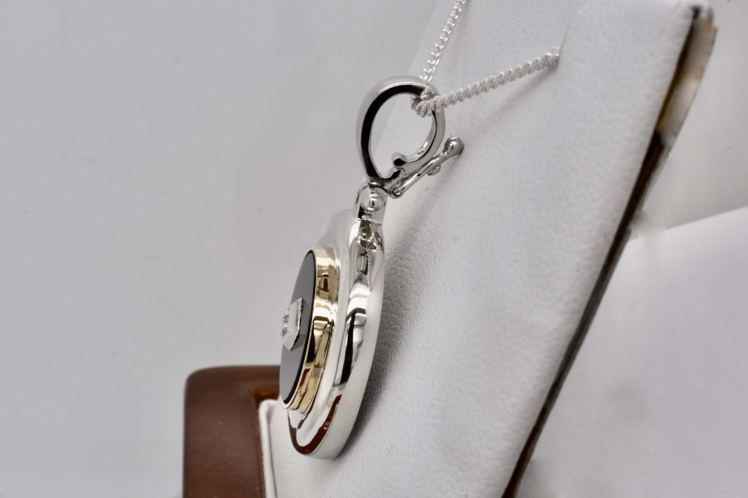 A contemporary sterling silver enhancer with a piece of round onyx measuring approx 15.5mm and a shimmering white diamond in the centre bezel set, with another bezel of 9ct yellow gold and a final outer bezel of silver, with an enhancer clip and security clasp. Chains available for separate purchase