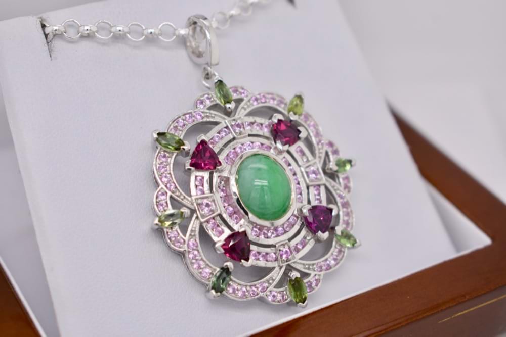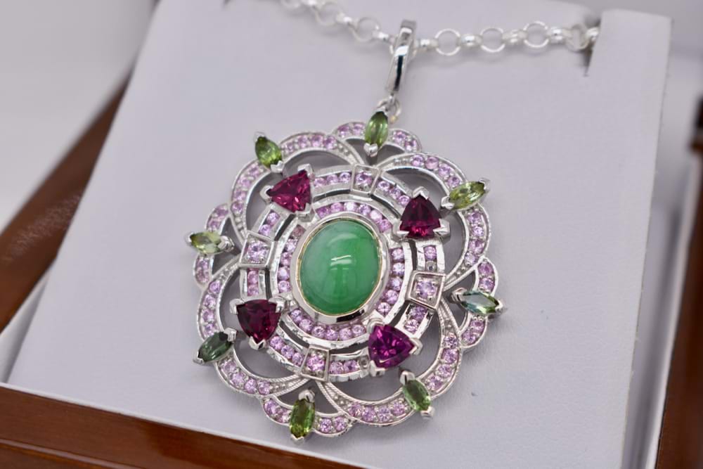 Sterling Silver Jadeite, Rhodolite Pink Garnet, Sapphire & Green Tourmaline Enhancer