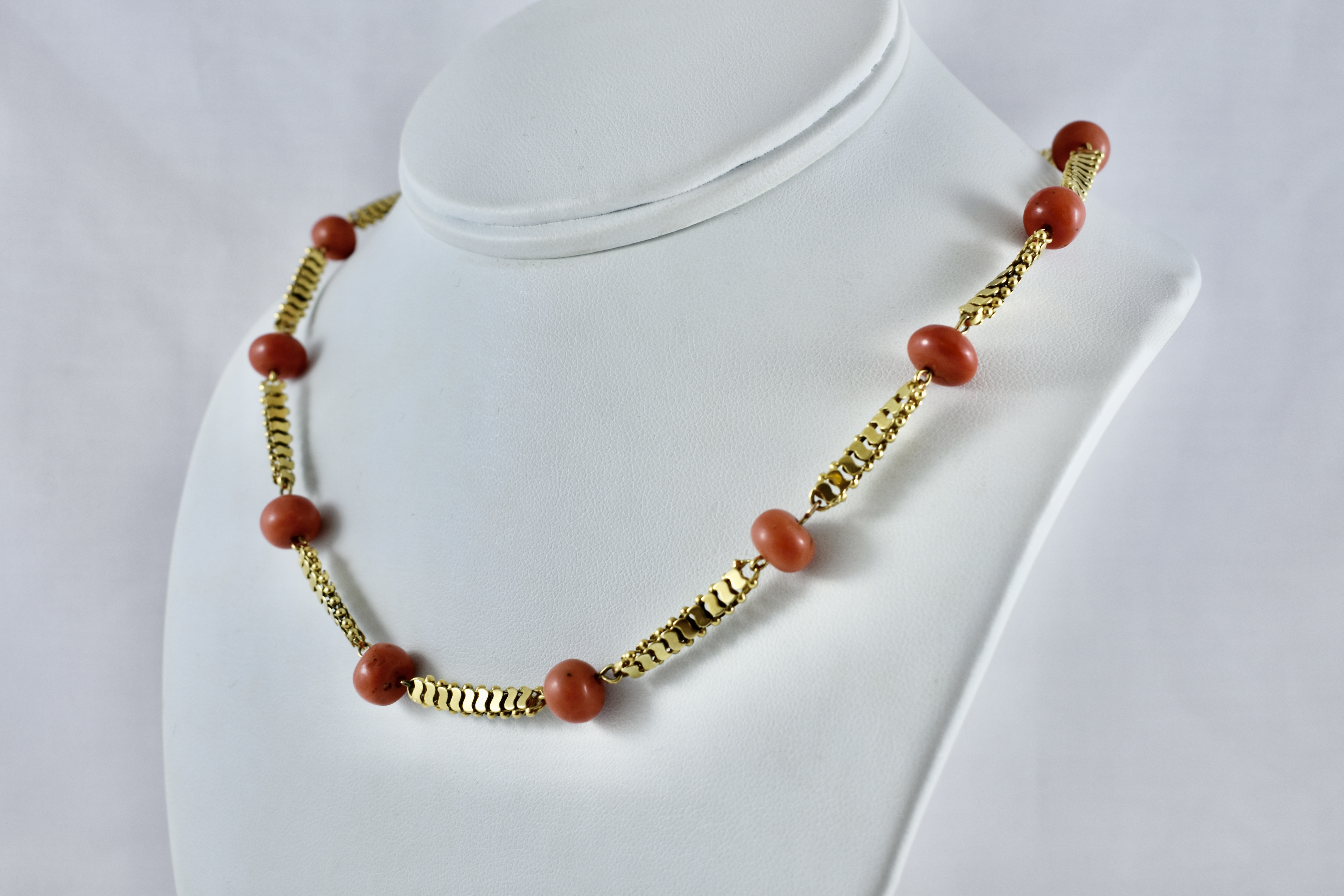 SOLD 14ct & 18ct Yellow Gold Fancy Link Necklet with Coral Beads Circa 1915