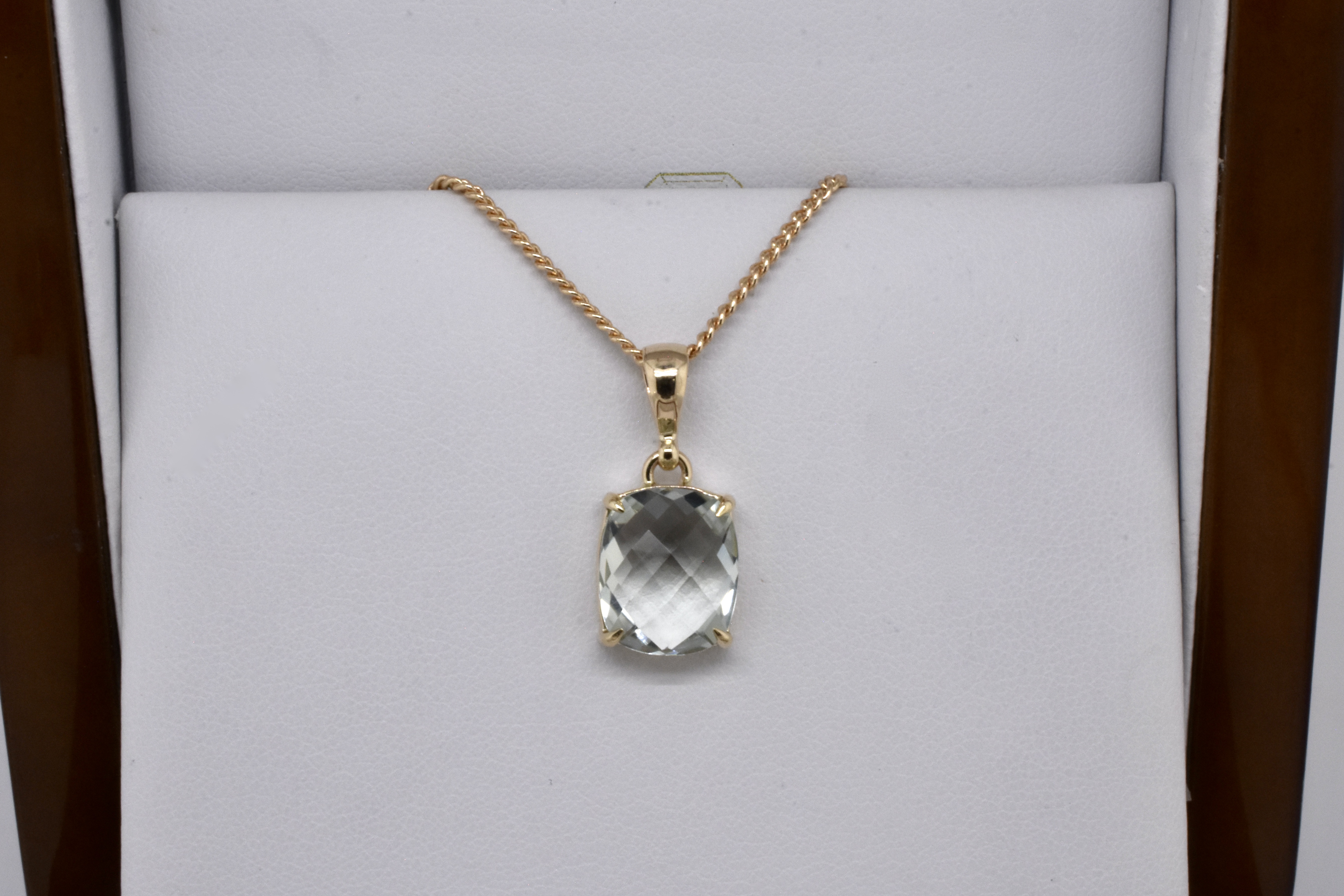 HOLD Handmade 9ct Yellow Gold 10mm Cushion Prasiolite Pendant