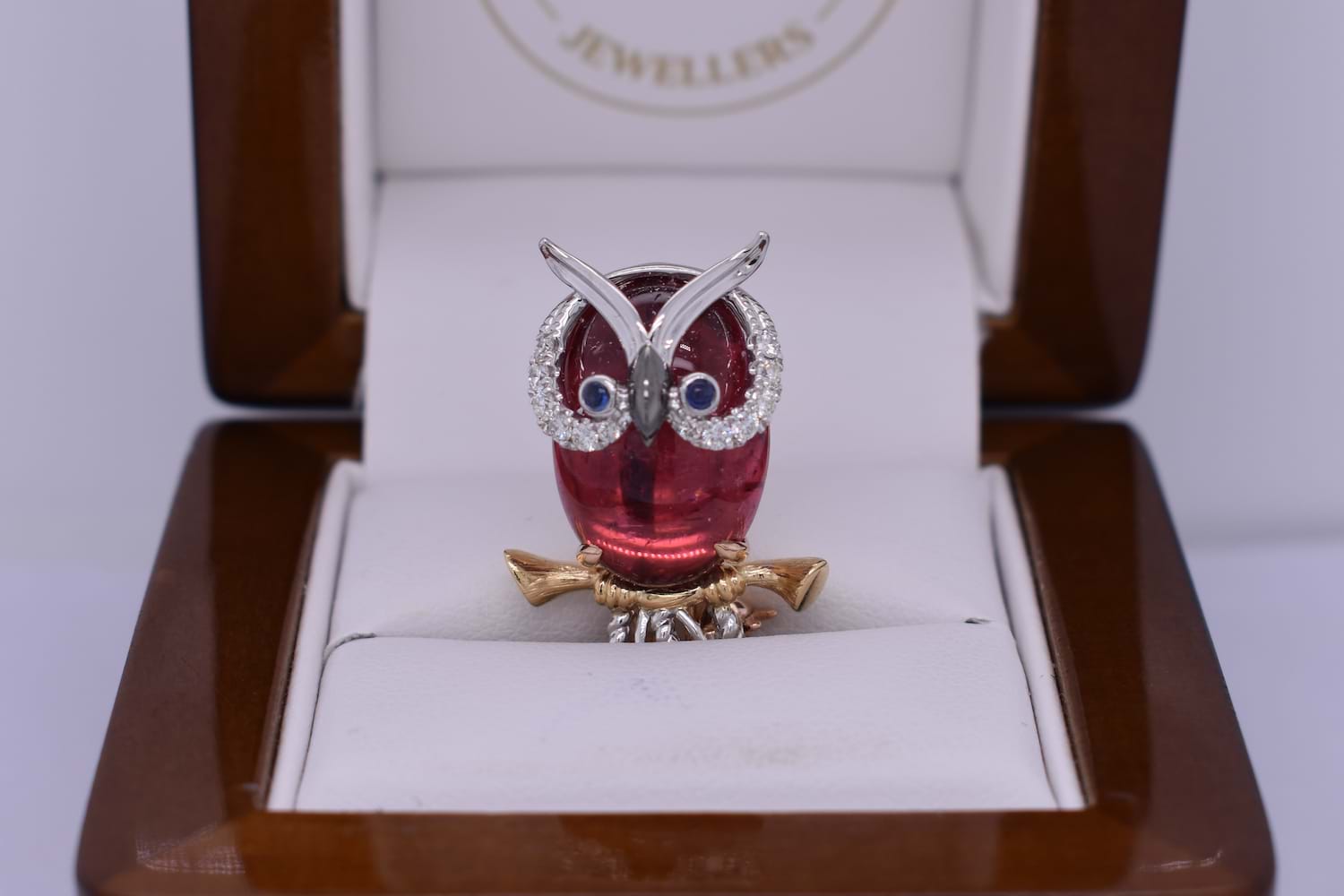 SOLD 18ct Gold 10.57ct Pink Tourmaline & 0.18ct Diamond & 0.06ct Blue Sapphire Owl Pendant/Brooch
