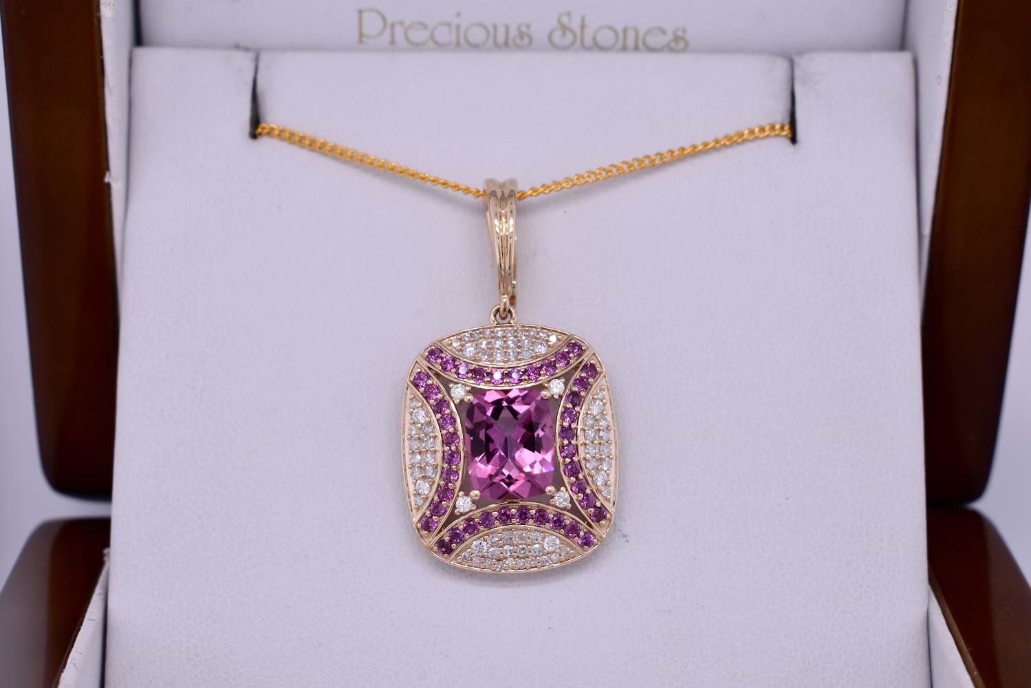 SOLD 9ct Yellow Gold Pink Topaz, Rhodolite Garnet & 0.41ct GH SI Diamond Enhancer