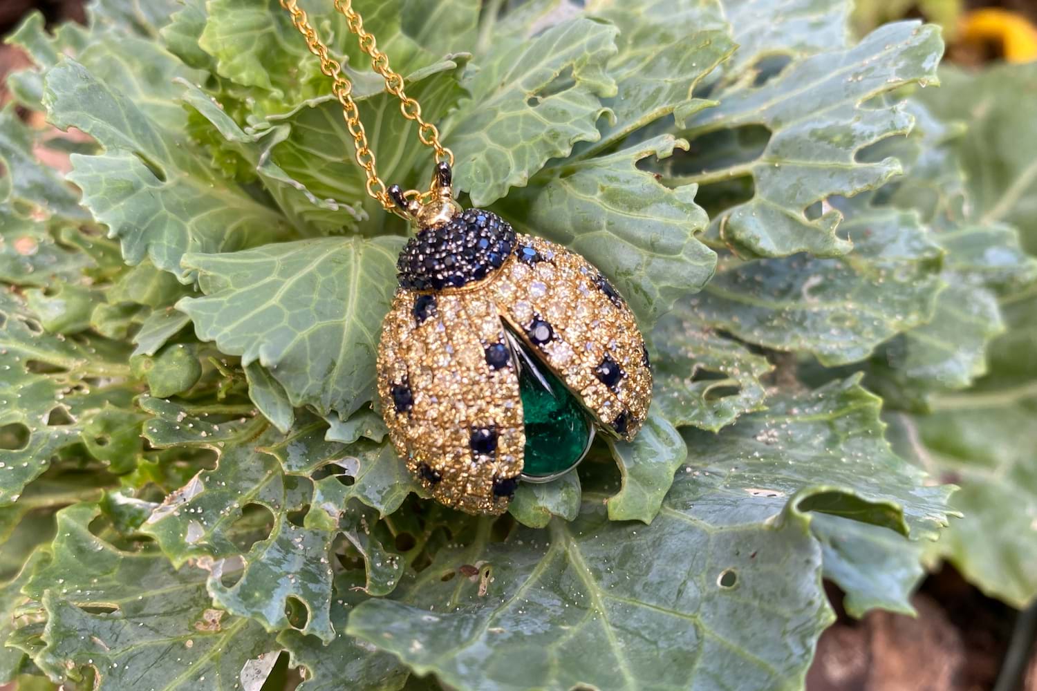 SOLD 18ct Yellow Gold 5.89ct Emerald, 0.96ct Sapphire & 2.93ct Fancy Yellow Diamond Ladybird Brooch/Pendant