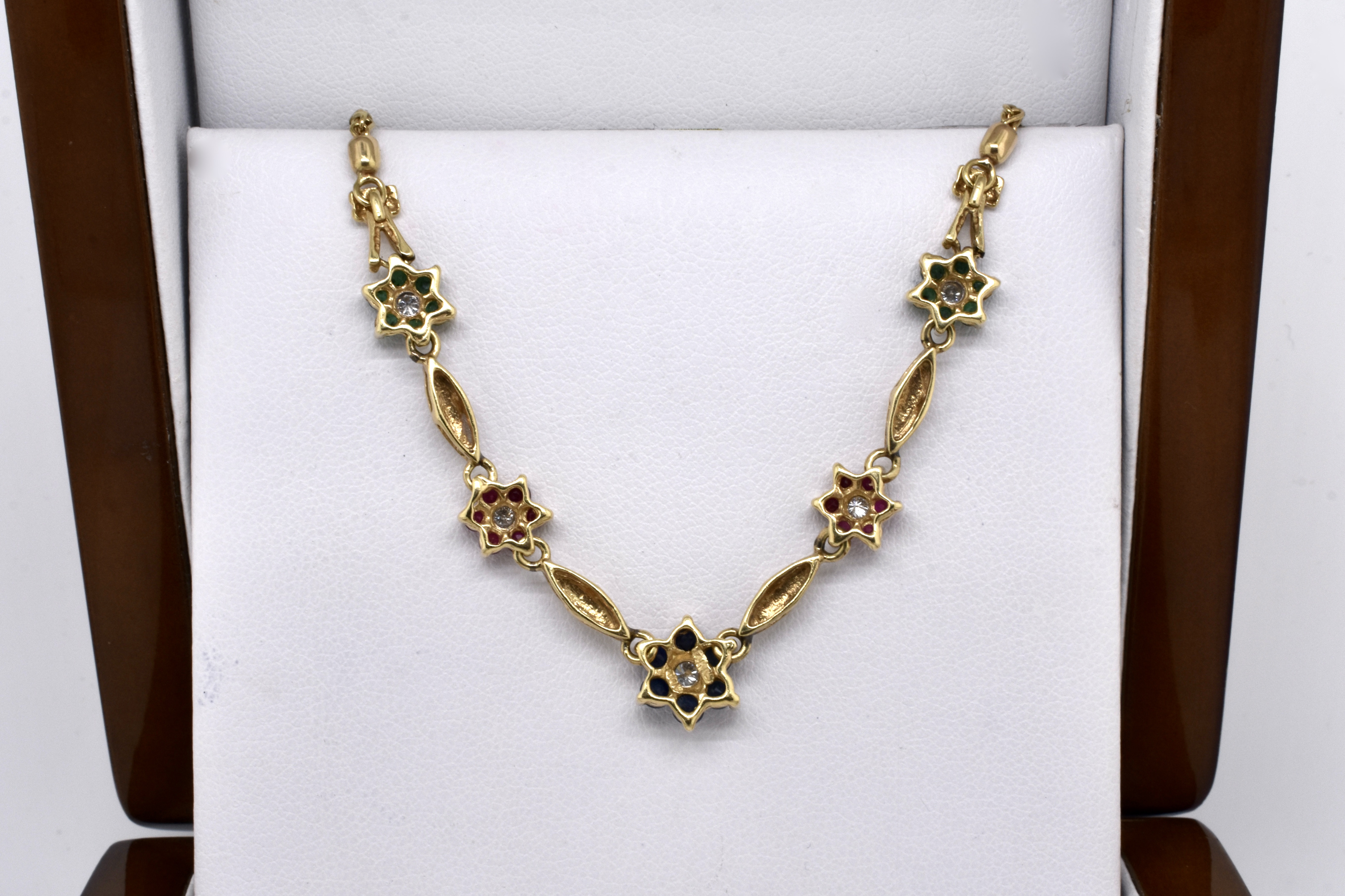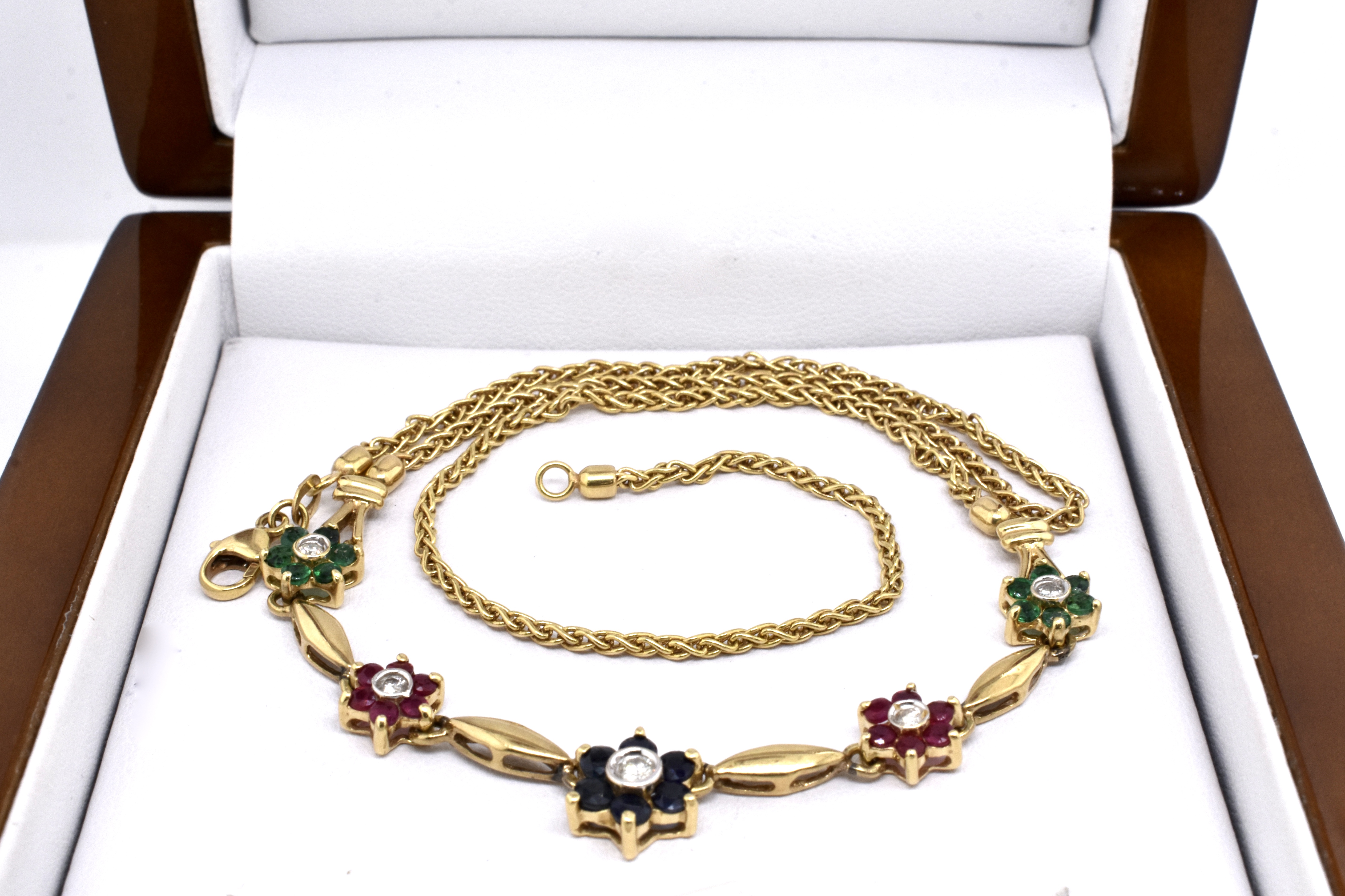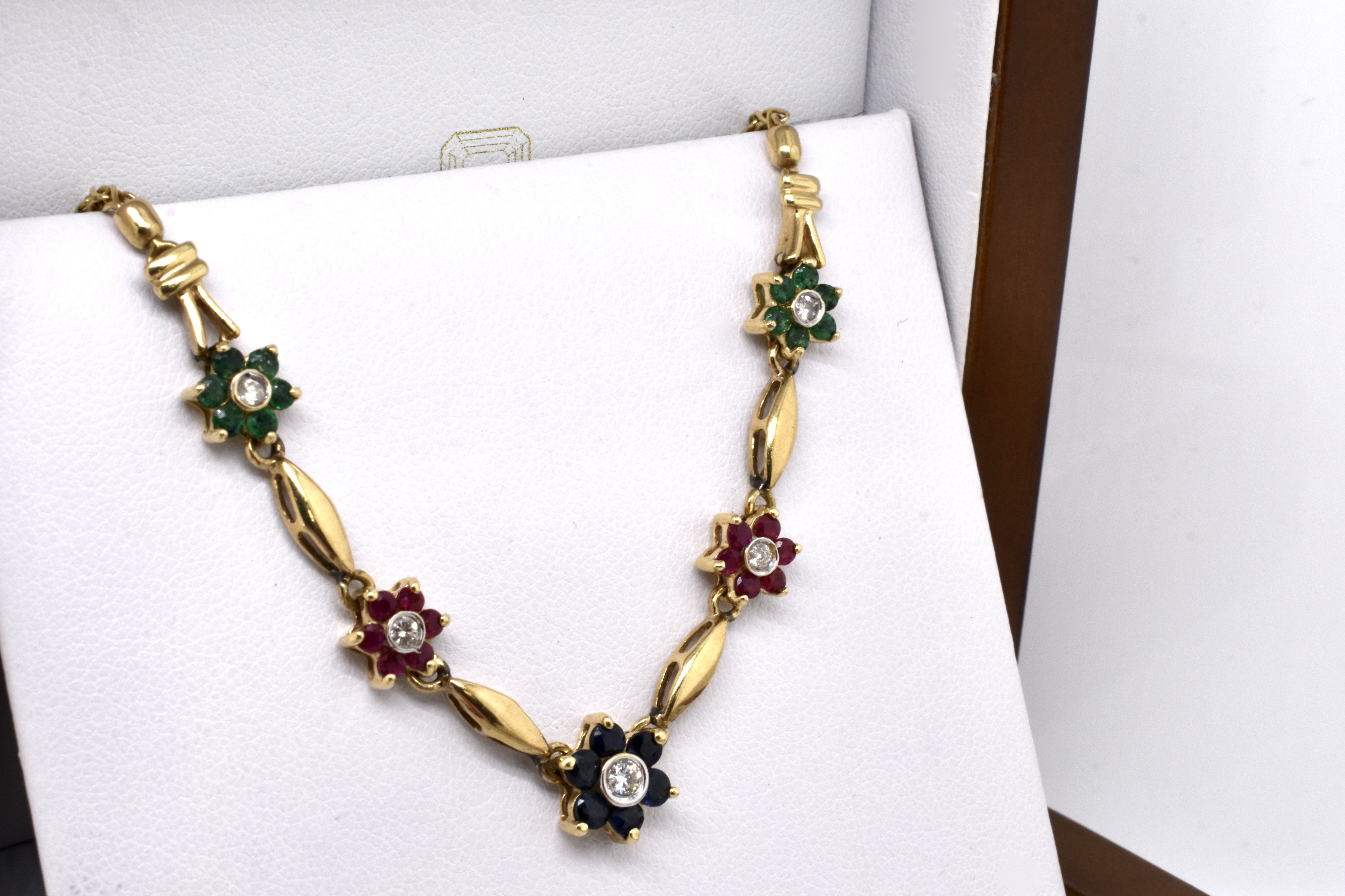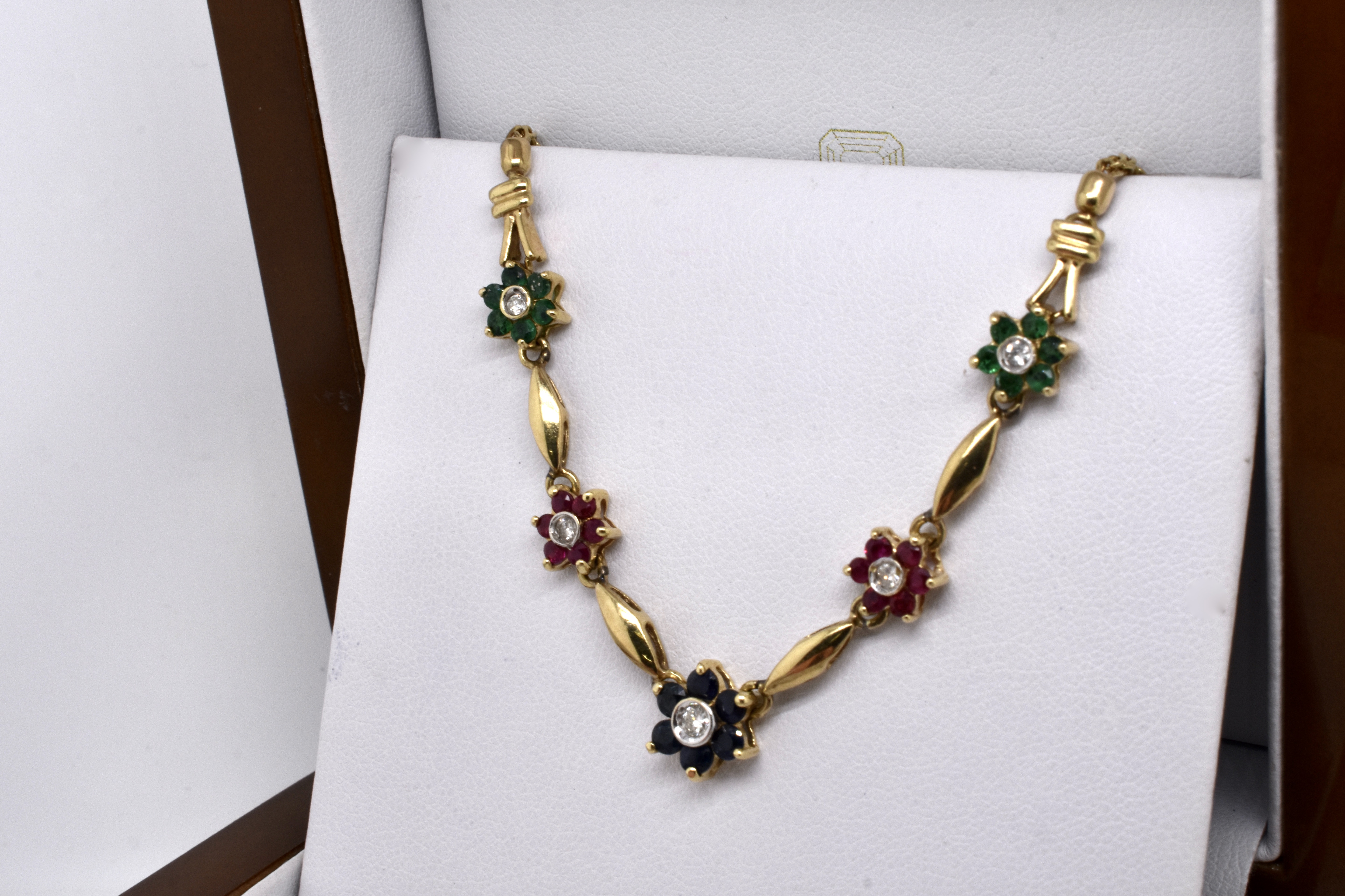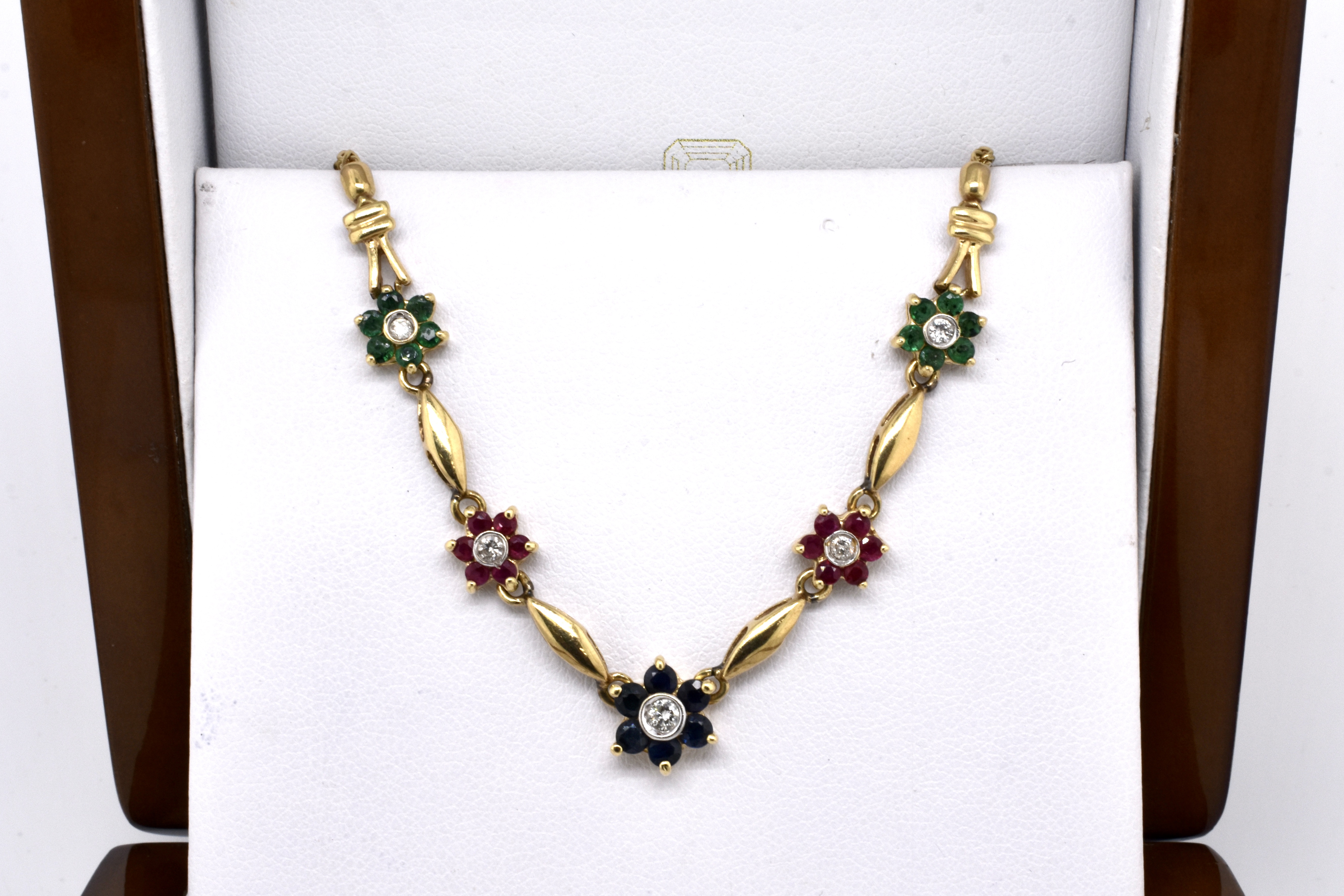 A beautiful, feminine and timeless necklace crafted from 14ct yellow gold and featuring all of the precious stones in clusters forming flower shapes. Total of six marquise sapphires equalling 0.60ct, twelve round rubies equalling 0.60ct, twelve round emeralds equalling 0.48ct and five RBC diamonds equalling 0.19ct H/SI-P1. Chain is 45cm long with a wheat link and parrot clasp